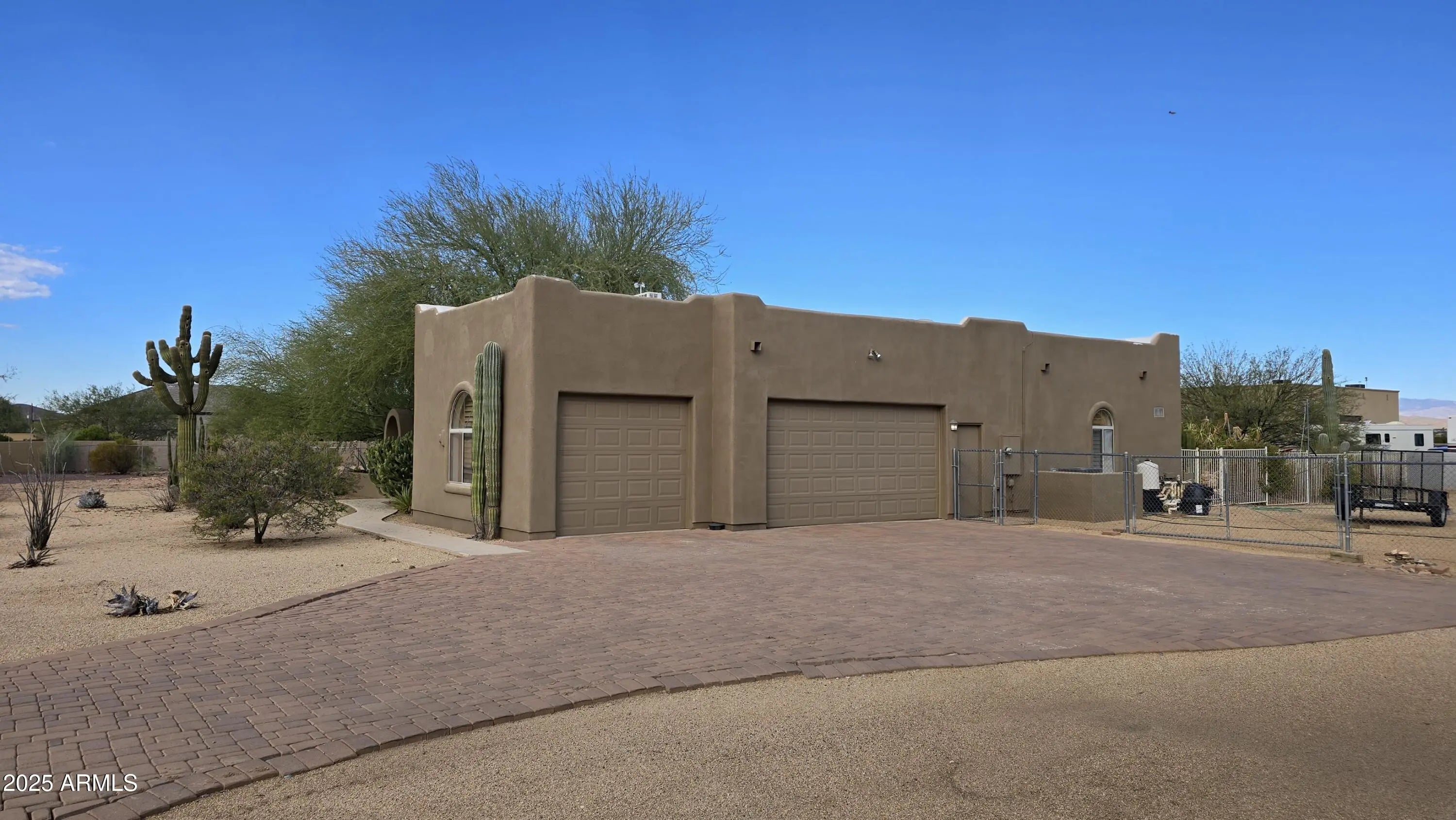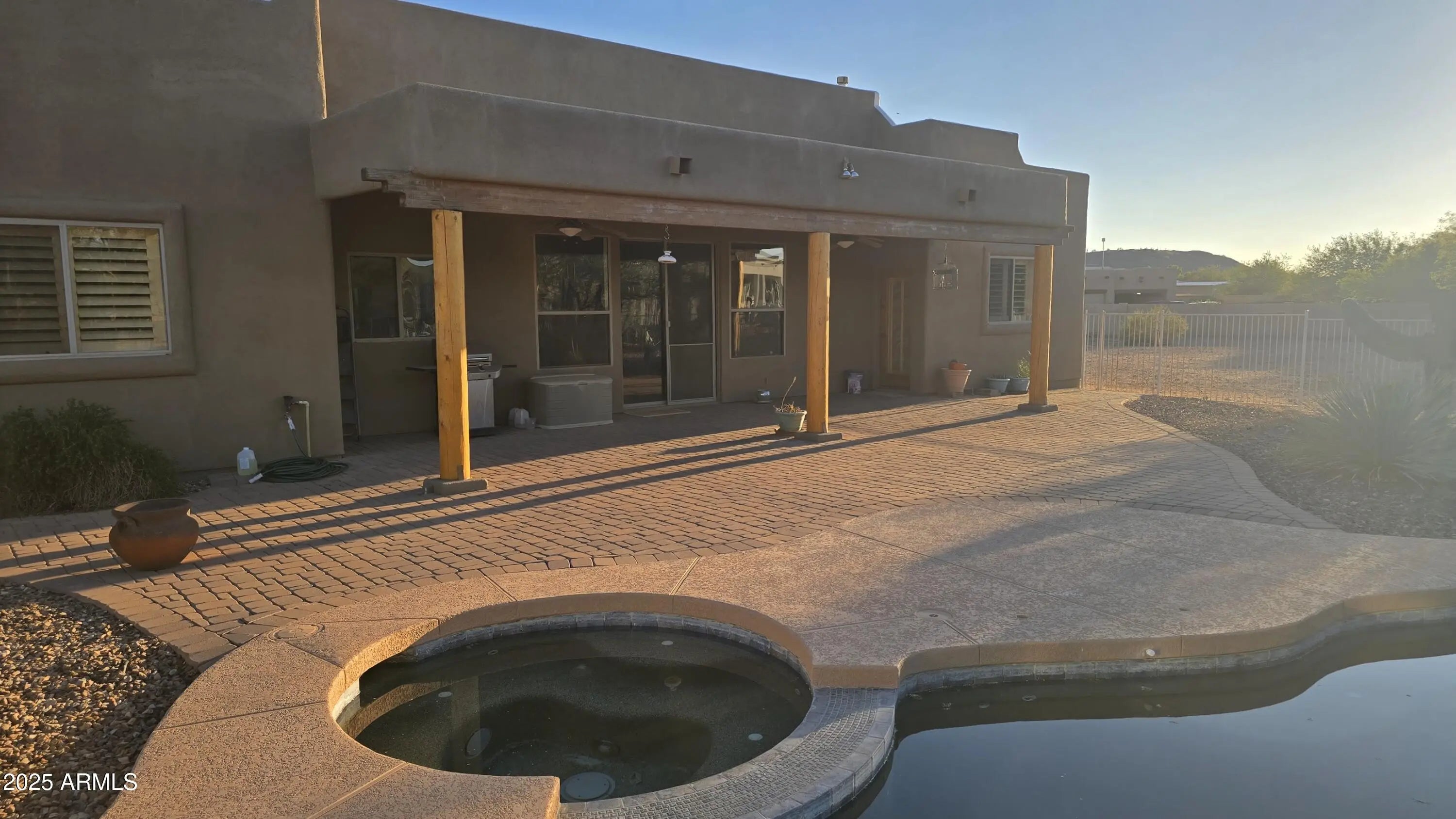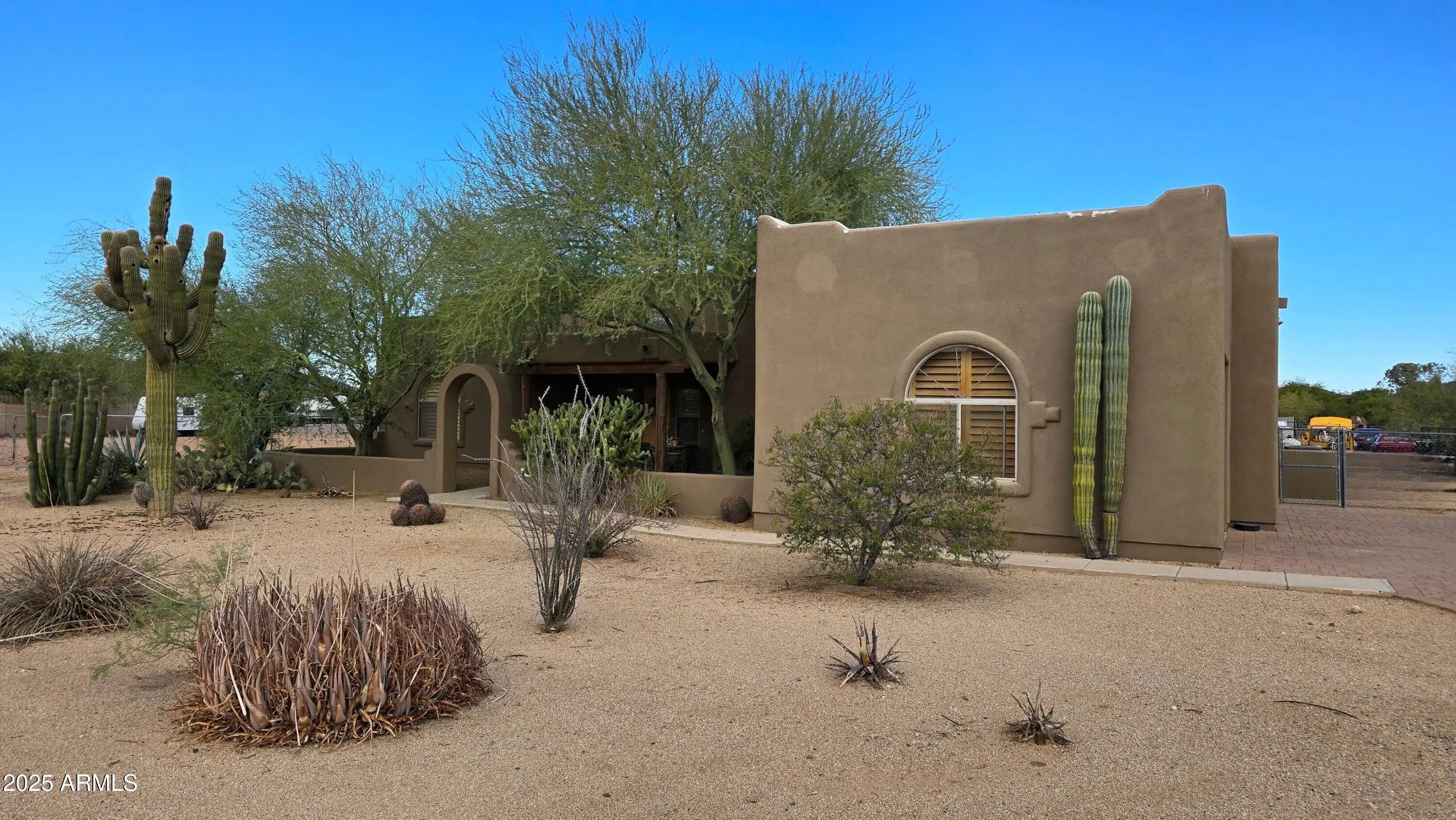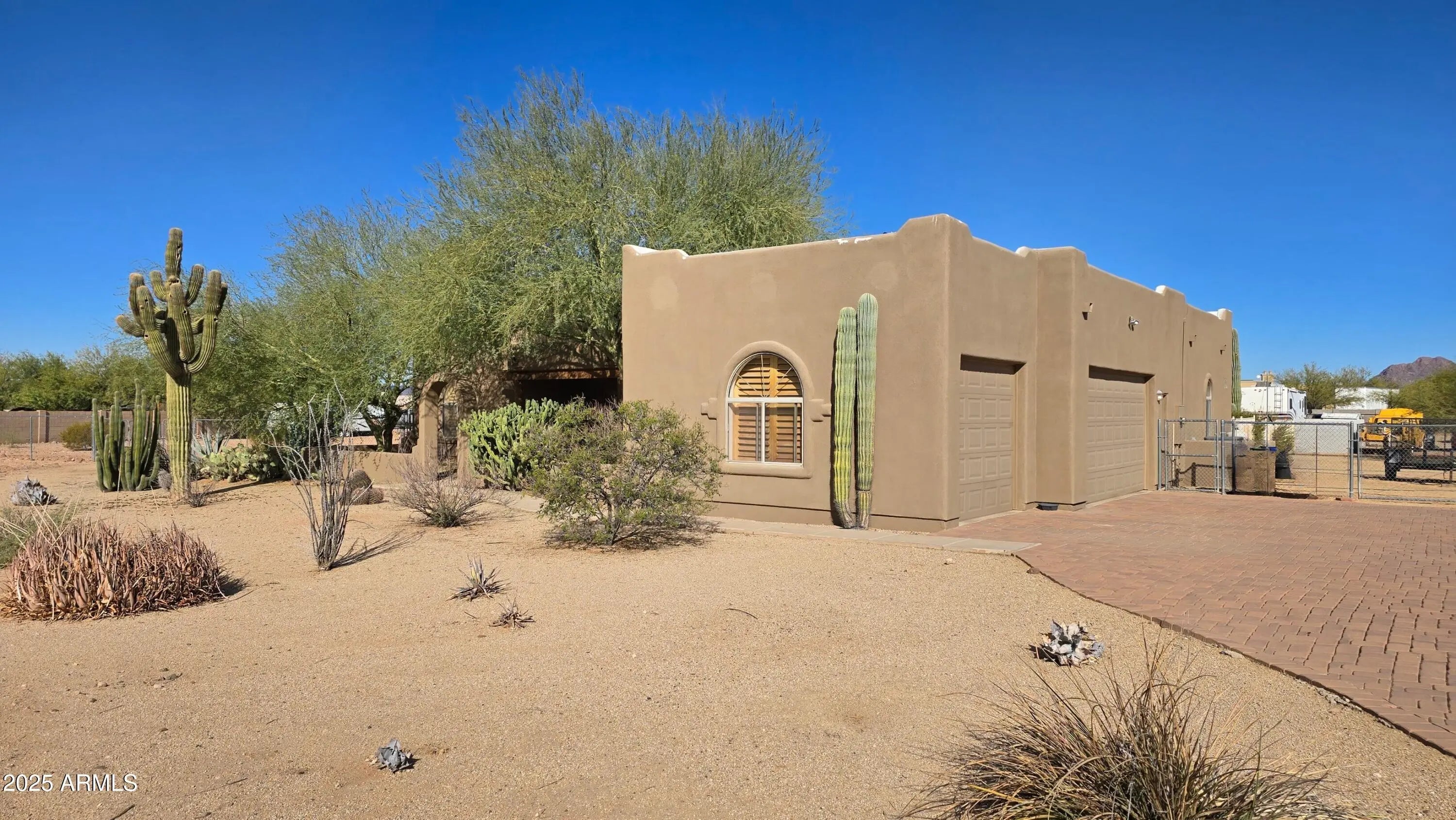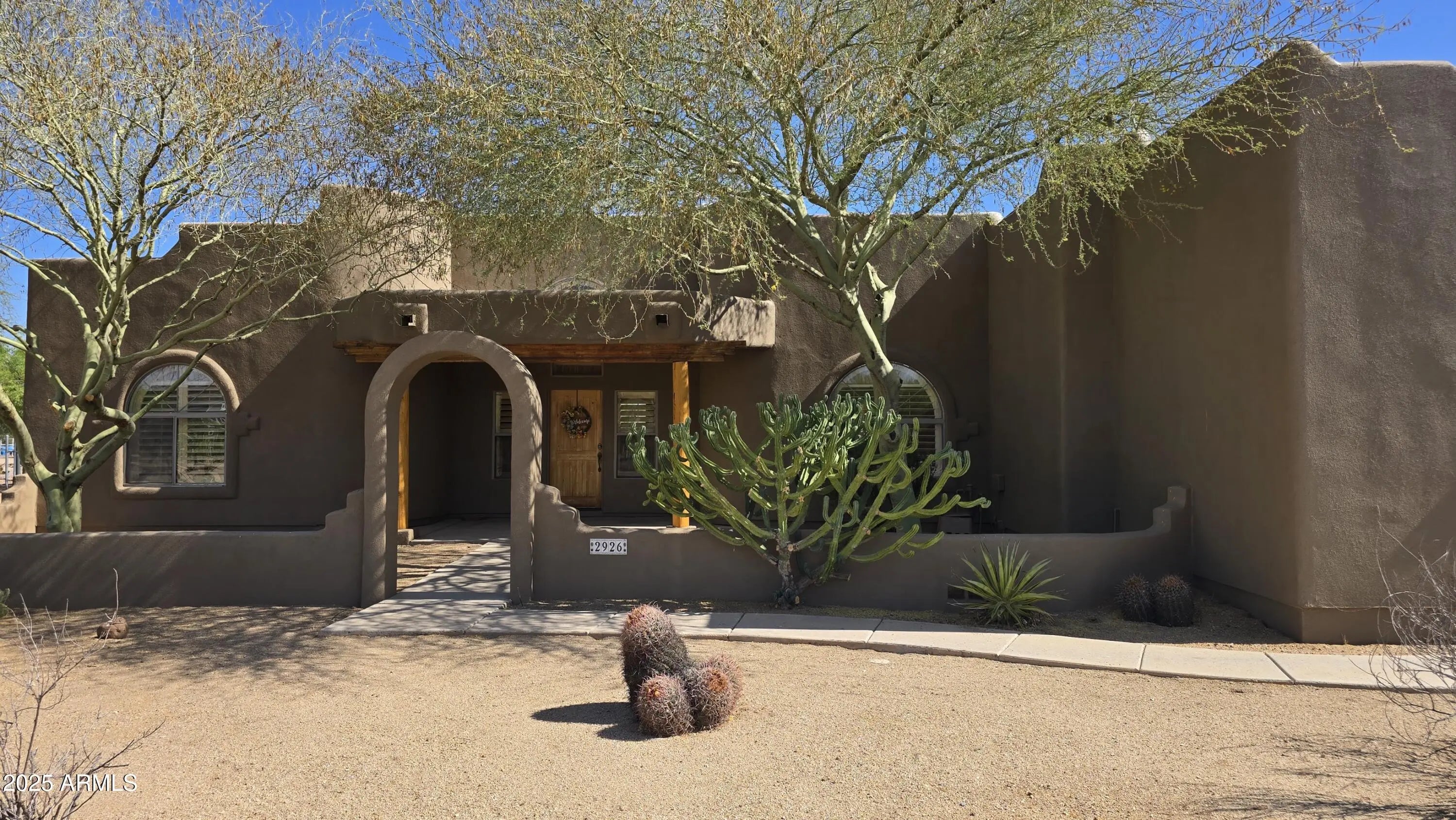What a beautiful Santa Fe style home that is Luxury desert living at it's finest. You are surrounded by amazing mountain views in this quiet oasis. Spacious Family room with vaulted ceilings. Beehive Fireplace for cozy fires. Split floor plan for extra privacy. Plantation shutters throughout. 3 car garage with 220v EV charger. Large covered back patio and entertaining area that includes a saltwater heated Jacuzzi and pool with waterfall. cool deck was just resurfaced. Roof just resurfaced with warranty. Many mature trees compliment the beautiful desert landscaping.With a full Acre lot there is plenty of space including a large separate fenced in area for your horse corral or for storage such as travel trailers, etc.