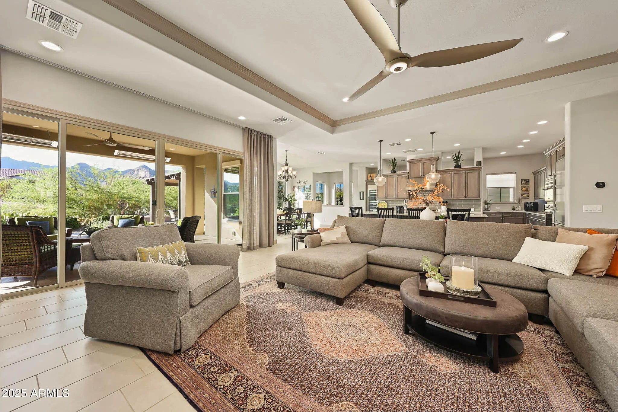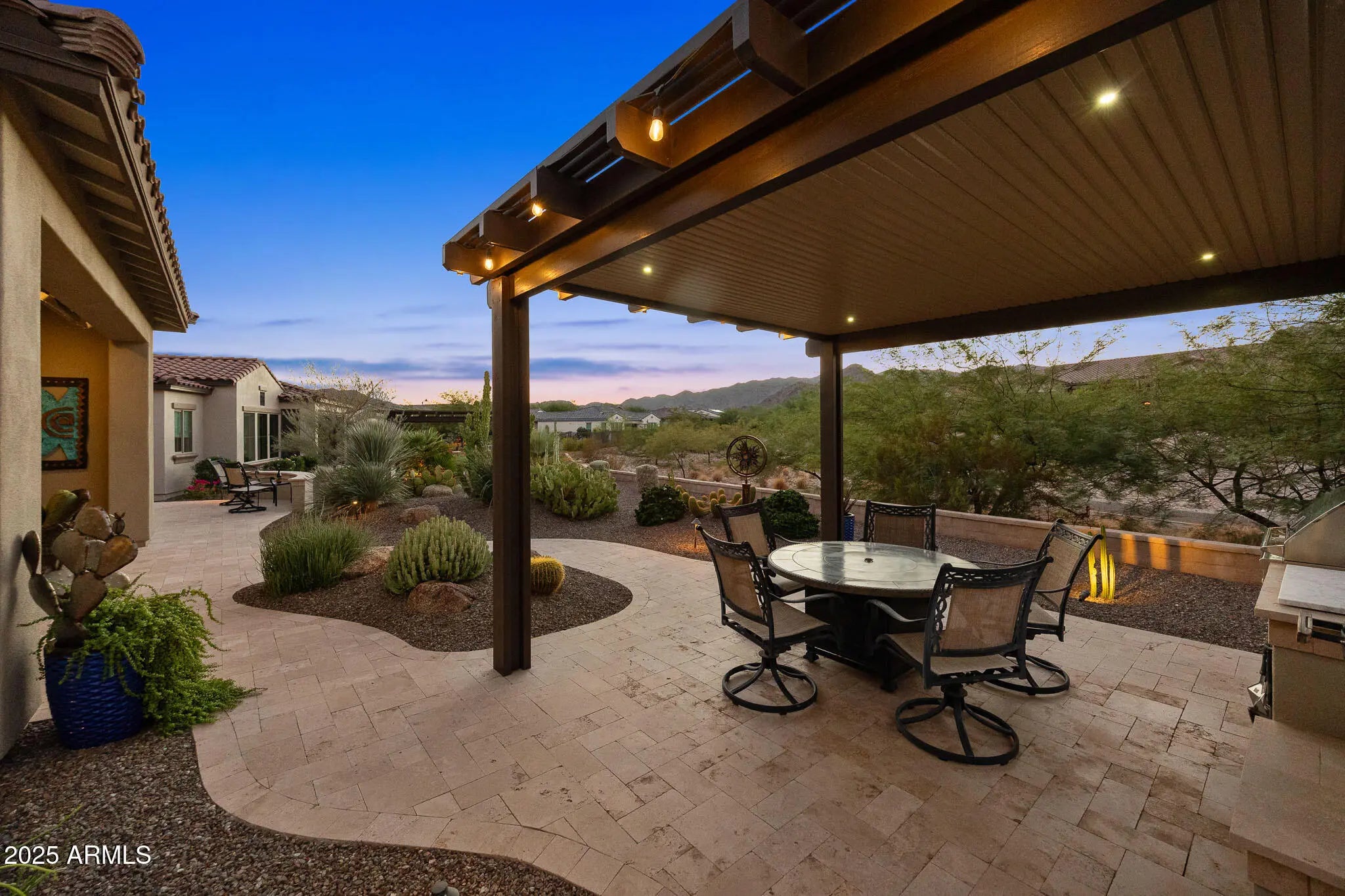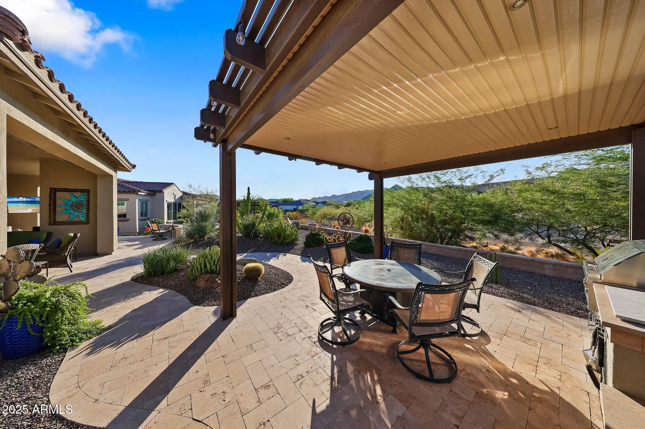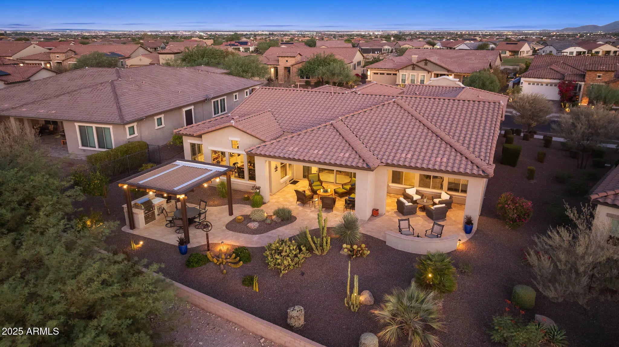 OUTSTANDING Home with GORGEOUS Outdoor spaces & views to mountains. Popular Serendipity floor plan upgraded thruout in luxury living. Kitchen features high end Thermador appliances - multiple ovens, chef's range, built-in refrigerator, wine refrigerator; prep sink, upgrade cabinetry w/furniture finishes, drawer storage & specialty storage. Expansive great room w/linear fireplace feature wall. View from back of home is breathtaking, great for entertaining - on the extended covered patio, the sun & view patios or the outdoor kitchen under the pergola. Owners' retreat w/scenic views, lux bath, large closet open to laundry room. Two guest suites w/ensuite baths & walk-in closets. Office/den perfectly sized for work or hobby, with double doors. 3-Car garage w/epoxy & cabinets. MANY $Upgrade$
