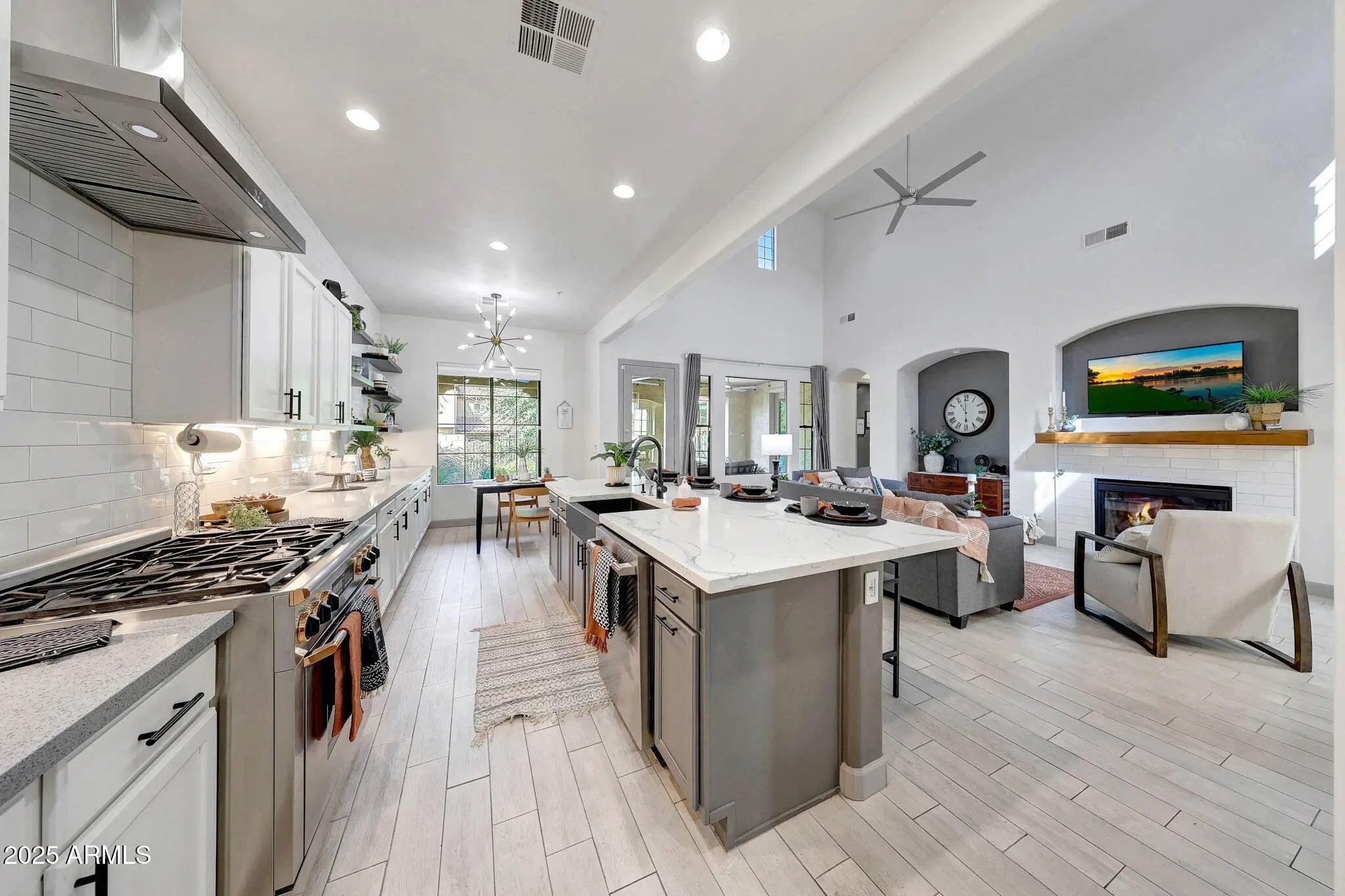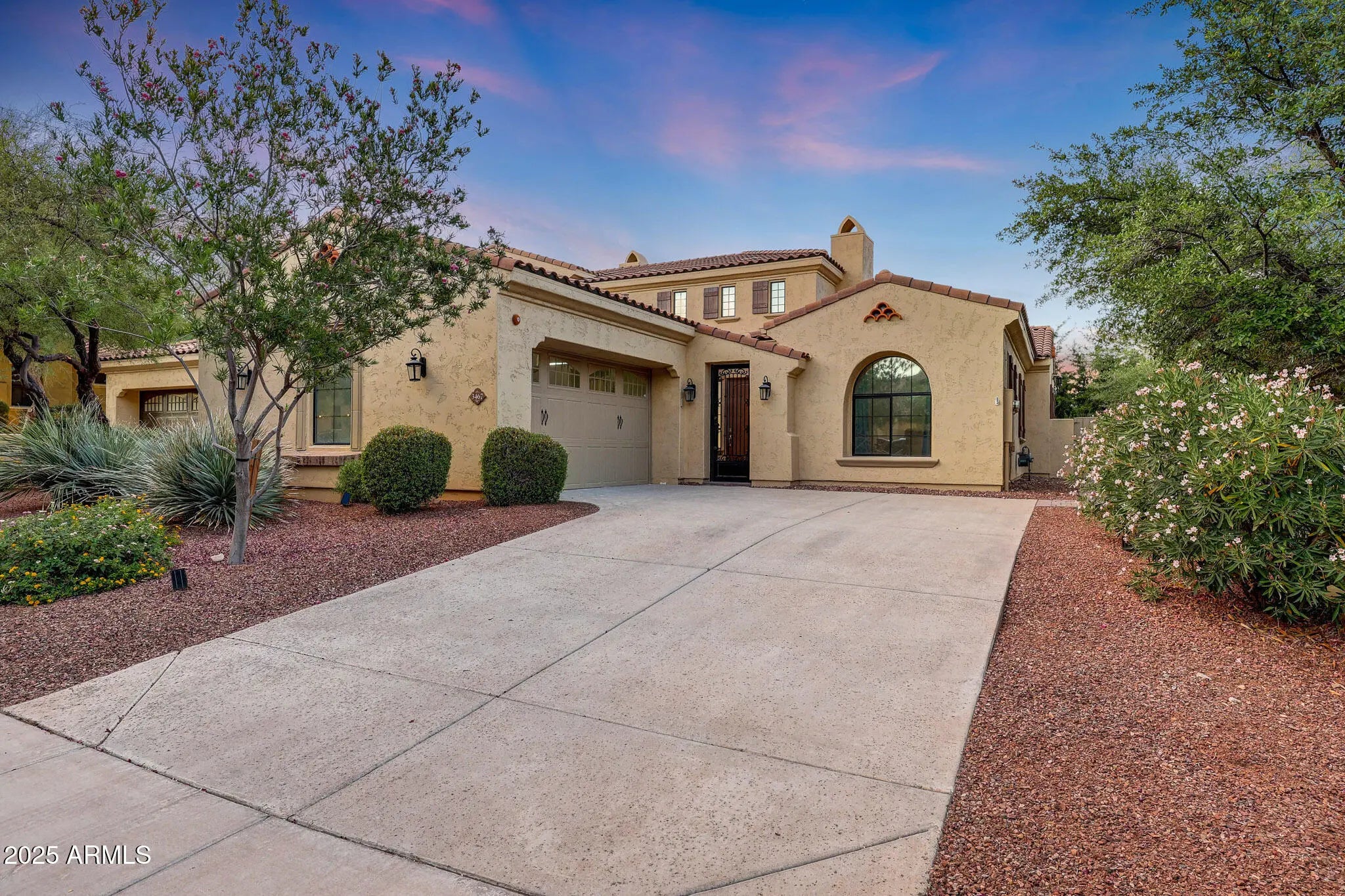 This sophisticated model-style home is located in the exclusive gated community of Vallarta and offers everything Verrado is known for. Perfectly situated on a premium corner lot adjacent to the private community pool, this move-in ready home features an open and airy great room concept with soaring 22' vaulted ceilings, 10' ceilings in the remaining areas, which seamlessly connects indoor and outdoor living, making it perfect for entertaining. The chef-style kitchen boasts quartz countertops and a high-end Dacor gas range with air fryer, convection, and self-cleaning features. All kitchen appliances are just three years old, RO water drinking system and the washer, dryer, and refrigerator all convey. Additional upgrades include a newer A/C unit (2024), a hot water heater (2018)... and fresh custom interior paint. The home features a spacious split floor plan with a cozy gas fireplace in the living room and an electric fireplace in the primary bedroom, which also includes its own private side entry to the backyard. The luxurious primary bath offers a spa-like experience with a soaking tub, granite tile shower, a high-end shower panel tower system with jets and steam, dual vanities, and a large walk-in closet. The additional bedrooms also include walk-in closets, and the remodeled second bathroom features another spa-style shower system. Step outside to your private oasis backyard with peek a boo mountain views, complete with mature landscaping, extended pavers leading to the front of the house , a watering system for plants, automatic landscape lighting and a large covered patio with ceiling fans perfect for relaxing and entertaining. The oversized two-car garage provides ample storage and convenience. Vallarta residents enjoy exclusive access to a private community pool set along tree-lined streets and lush green surroundings. The HOA includes gated access, exterior paint, road maintenance, front yard landscaping with water irrigation, and pool access offering truly lock-and-leave, maintenance-free living. Beyond the gates, Verrado offers a vibrant lifestyle with local dining, shopping, top-rated A+ schools, over 78 parks, hiking and biking trails, two additional outdoor pools, and a state-of-the-art fitness center. Year-round community events foster a strong sense of connection, and future developments including a new outdoor shopping center and medical campus just down the road ensure even more convenience and value. Don't miss your opportunity to experience the very best of Verrado in the luxurious and private enclave of Vallarta. This exceptional home is priced to sell and ready for immediate move-in!
