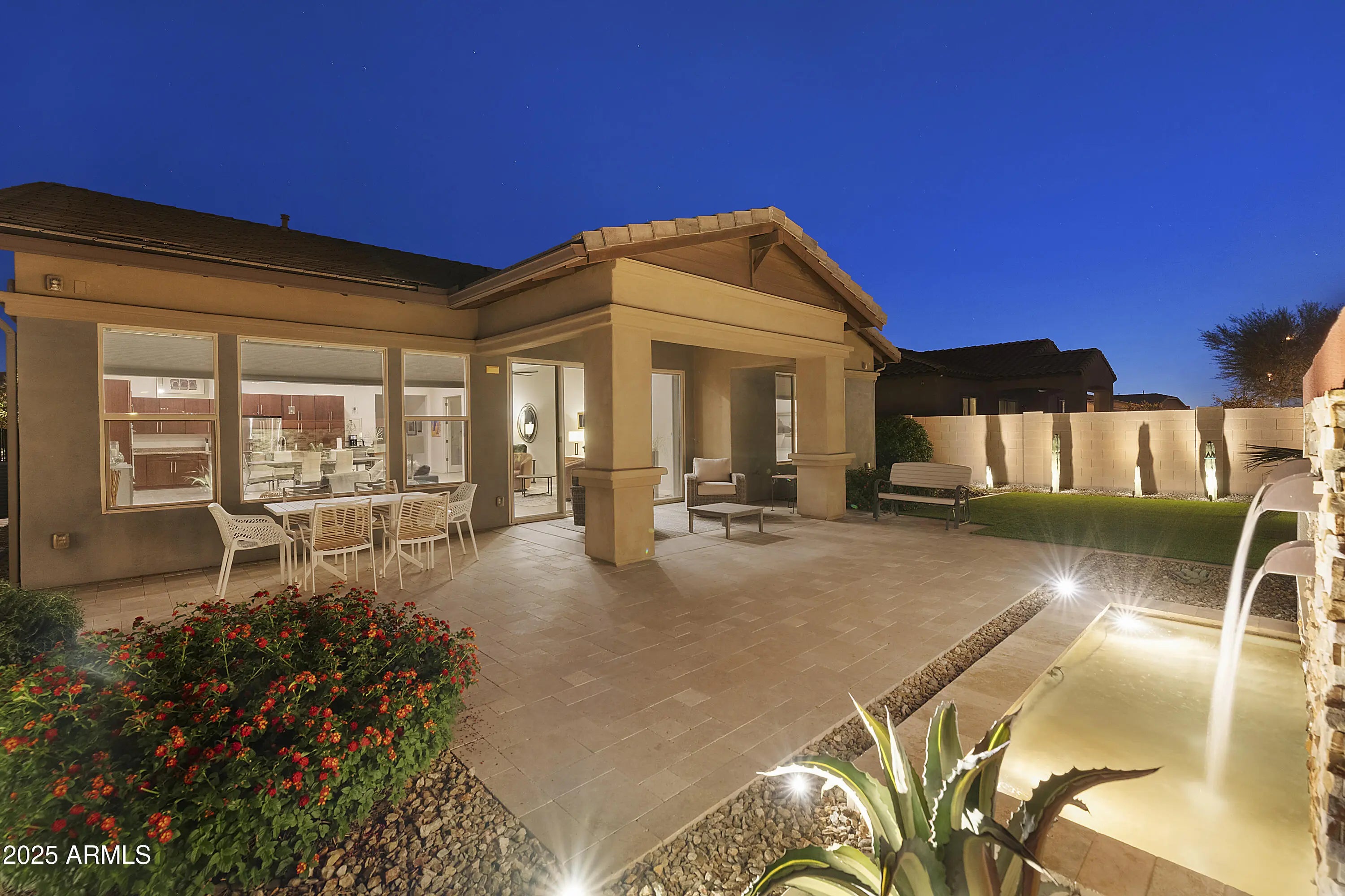 Stunning Marbella Vineyards home where modern finishes meet a sense of calm the moment you walk in. The gourmet kitchen offers GE Café appliances, gas cooktop, and a stainless French-door refrigerator. The primary suite features a spa-style walk-in shower for unwinding at day's end. A flexible bonus room fits your lifestyle. The magical, artist-designed backyard is visible from the living room, kitchen, and primary suite through expansive windows and an oversized two-door slider, filling the home with peaceful views. Travertine patio, lit water feature, lush landscaping, no homes behind, and energy-efficient upgrades throughout. See a list of all upgrades and othe info in the Document tab