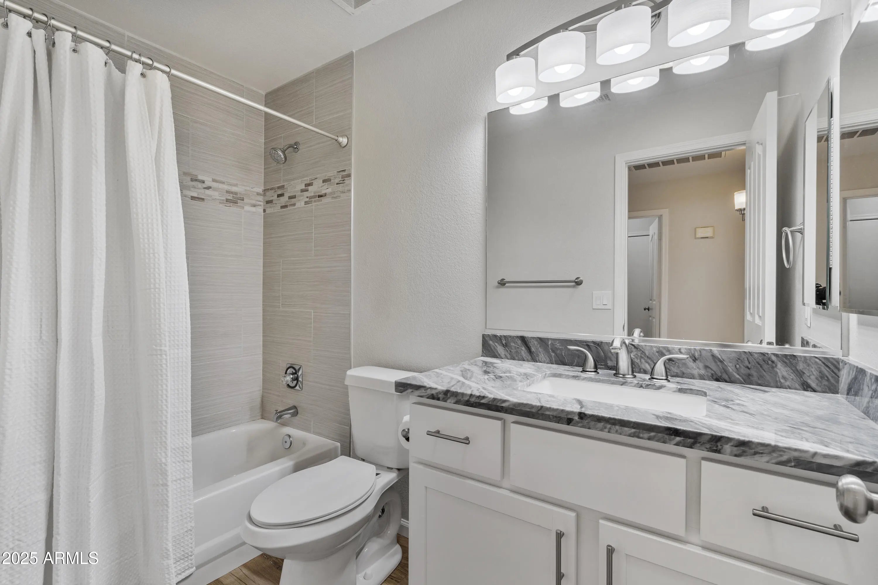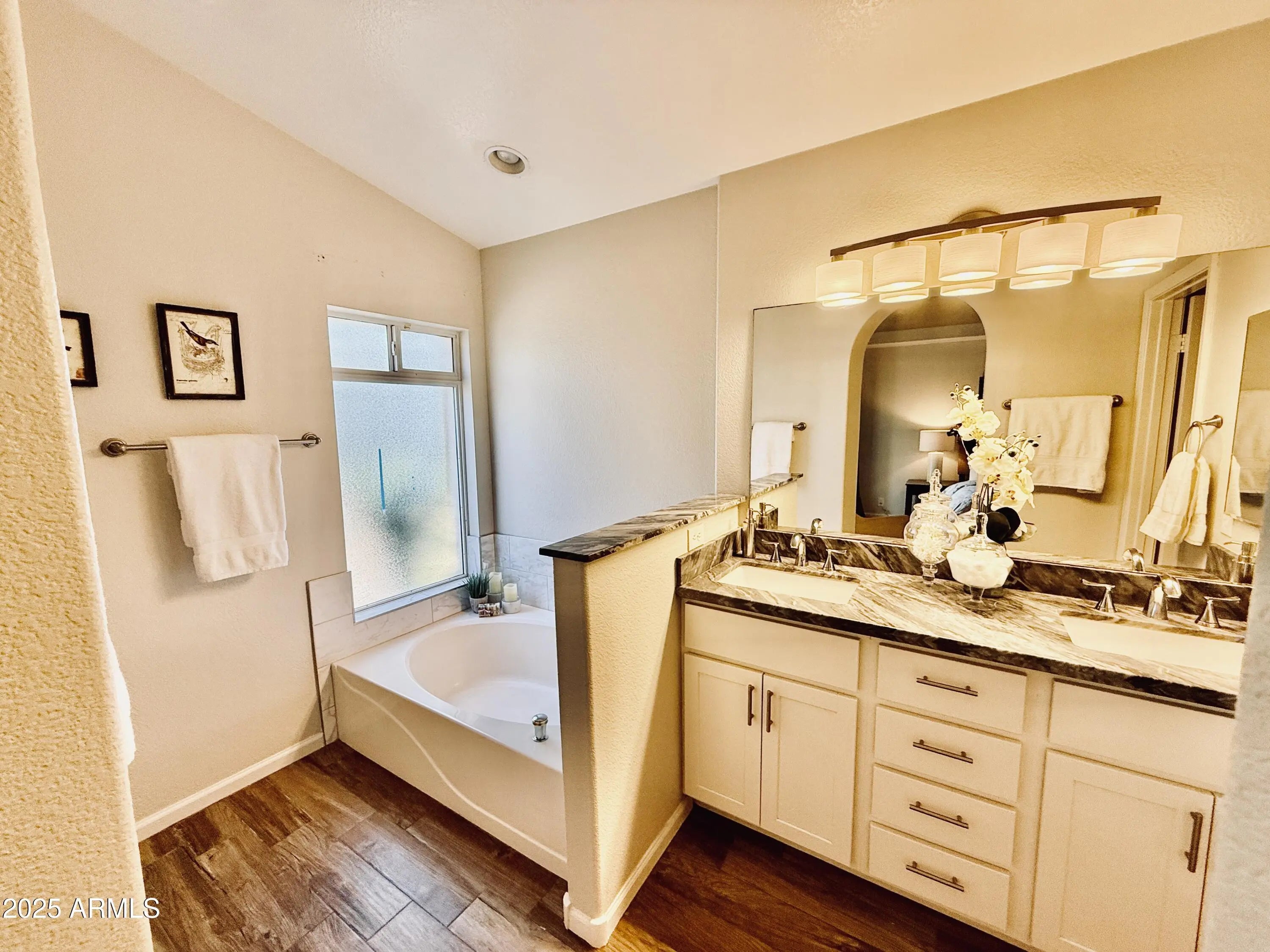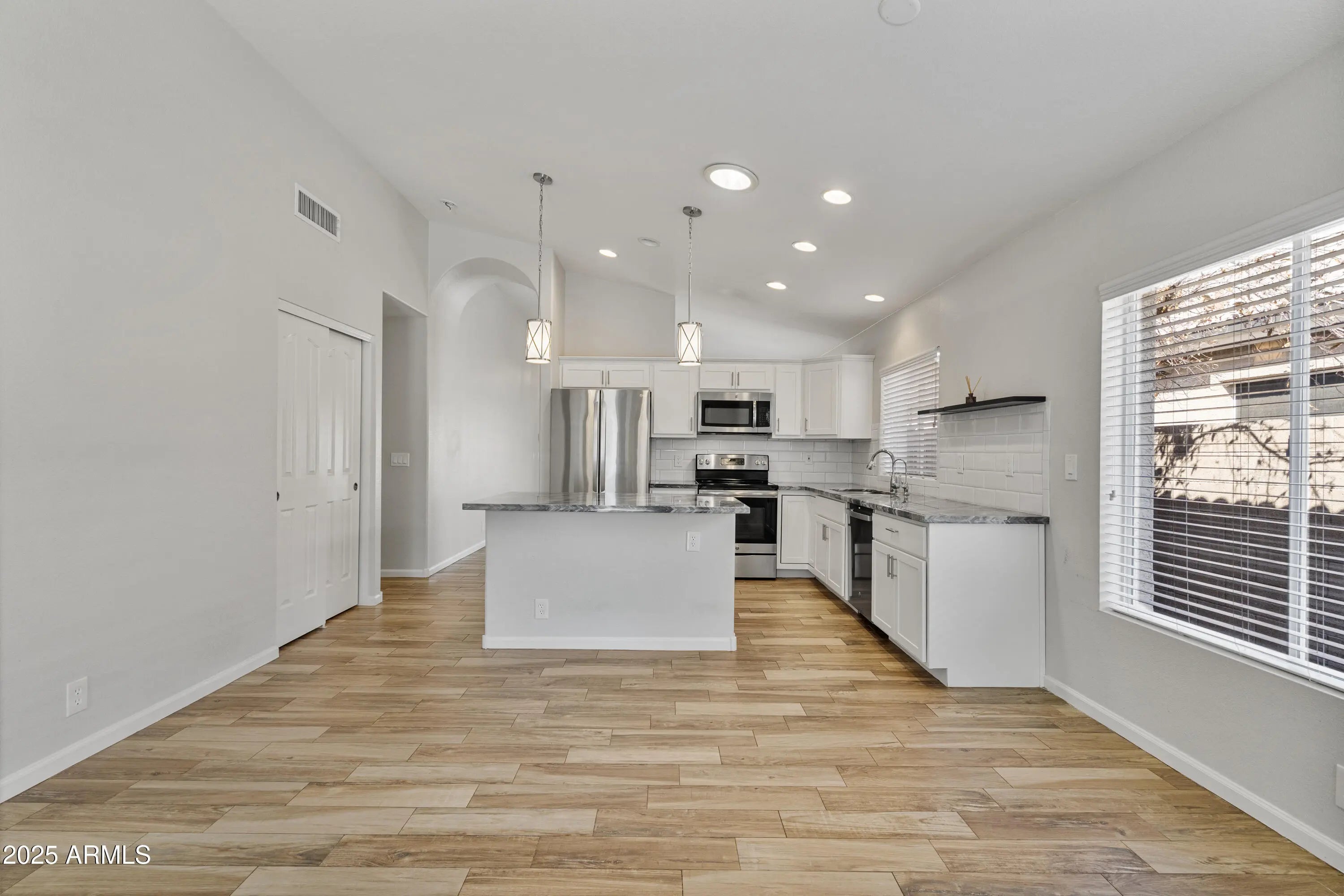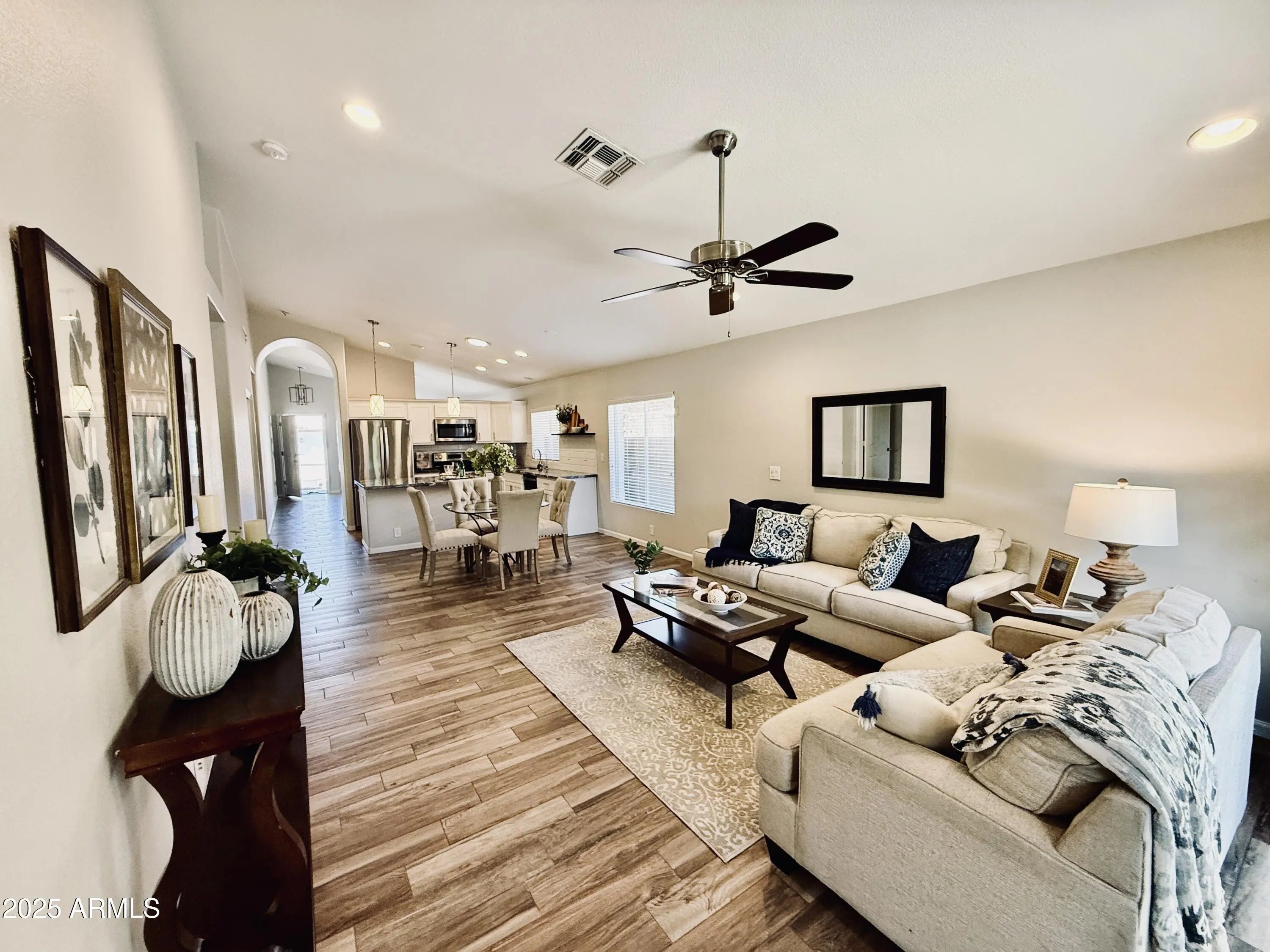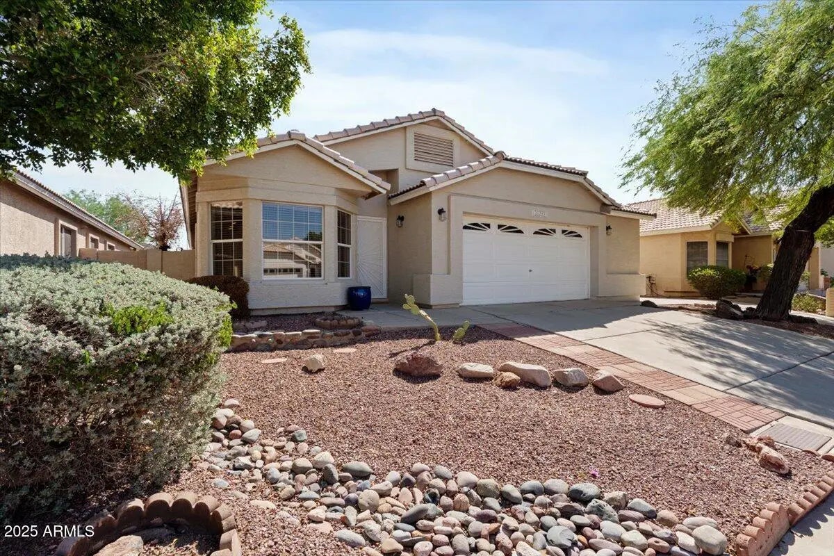 Welcome to this beautifully maintained home in the highly desirable Arrowhead Lakes community of Glendale, where pride of ownership and thoughtful updates shine throughout. The inviting front exterior features low-maintenance desert landscaping, mature trees, a wide driveway, and a clean stucco façade, creating excellent curb appeal from the moment you arrive. Inside, the home offers a bright, open-concept layout with wood-look tile flooring, neutral finishes, and abundant natural light. The formal living and dining areas are enhanced by modern chandeliers, large windows, and flexible space ideal for both entertaining and everyday living. The spacious main living area flows seamlessly into the kitchen, offering open sight lines, recessed lighting, and sliding glass doors that lead to the backyard. The updated kitchen is a standout, featuring white cabinetry, stainless steel appliances, quartz-style countertops, subway tile backsplash, pendant lighting, and a large center island with seating perfect for gatherings and daily use. The primary suite is a peaceful retreat with vaulted ceilings, plush carpet, ceiling fan, and direct backyard access. The spa-inspired primary bathroom includes a dual-sink vanity, upgraded counters, modern lighting, soaking tub, walk-in shower, and generous storage, along with a walk-in closet with built-in shelving. Secondary bedrooms are well-sized with neutral finishes, ceiling fans, and ample closet space, offering versatility for guests, family, or a home office. Additional highlights include a guest bathroom with updated vanity and fixtures, hallway storage closets, and a dedicated laundry room with shelving. Outdoors, enjoy a private, low-maintenance backyard with block fencing, mature trees, covered patio, concrete hardscape, and scenic mountain views ideal for outdoor dining, entertaining, or relaxing year-round in Glendale's climate. Aerial views showcase the newer roof, private lot, and proximity to the lakes and waterfront lifestyle that make Arrowhead Lakes so sought after. This move-in-ready Arrowhead Lakes home combines modern updates, functional living spaces, and an exceptional community setting close to shopping, dining, golf, and recreation. A fantastic opportunity to enjoy comfortable living in one of Glendale's most desirable neighborhoods.