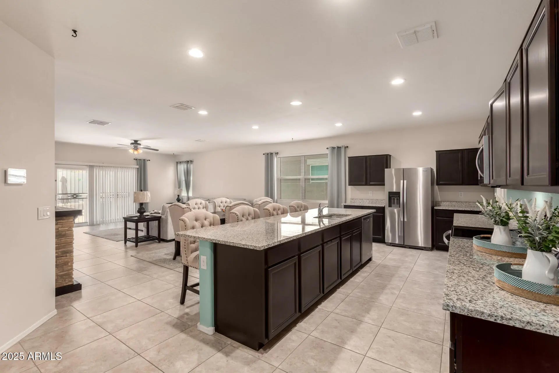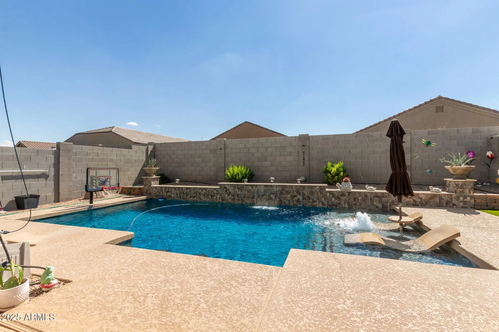 This 3-bedroom, 2-bath home features a gourmet kitchen with a huge island, stainless steel appliances, and plenty of storage, all opening to a spacious living area. The split floor plan includes a large primary suite for added privacy. Step outside to your backyard retreat with a sparkling pool complete with a Baja step, basketball hoop, tranquil water feature, and built-in BBQ, perfect for relaxing or entertaining year-round.