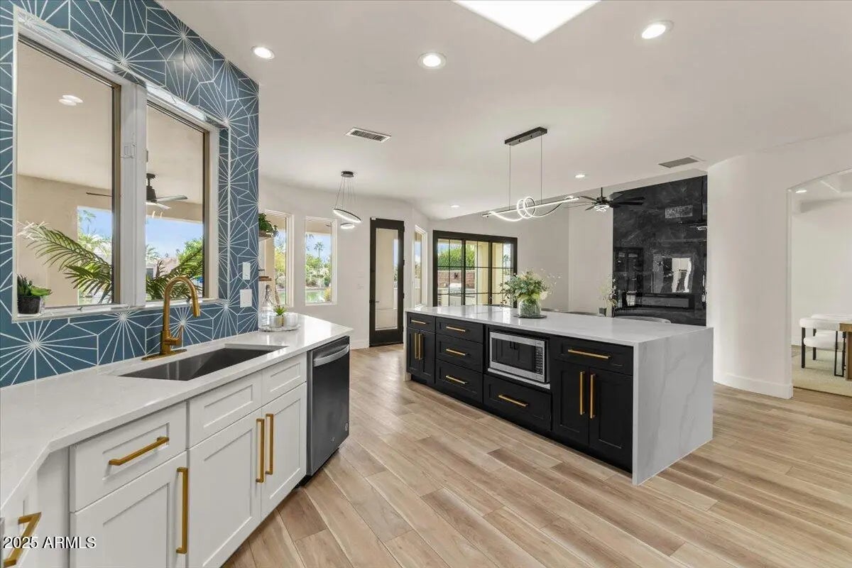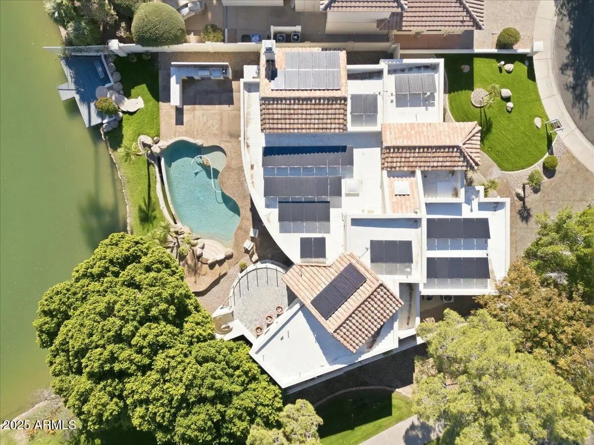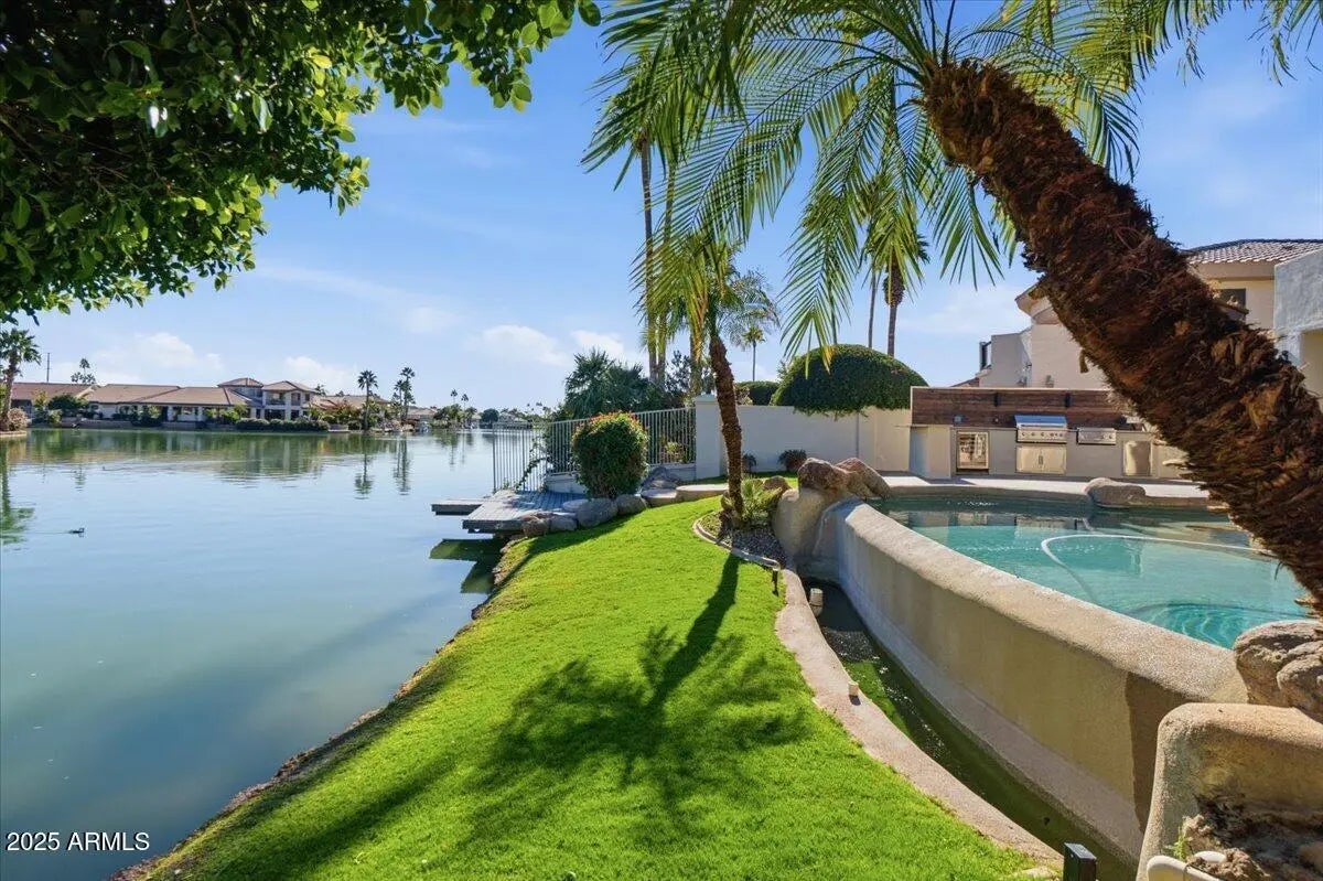 Amazing plan with 4-bedrooms, 4 Baths, plus 4 more Bonus Rooms in this lakefront home w/outdoor Kitchen & negative Edge Pool! Positioned on a premier cds lot w/lots of extra parking, this home combines modern luxury with timeless design. The gourmet kitchen showcases high-end finishes w/luxury vinyl flooring & carpet throughout. The lower level includes versatile basement retreat, ideal for entertainment.. Outdoors enjoy a resort-style setting with an infinity-edge pool, private dock, and spacious patio. Many extra rooms! Owned solar enhances efficiency and sustainability. Boat to VVL clubhouse, pools, pickleball, tennis, locker & workout rooms. Located within minutes of upscale shopping, dining, top-rated Gilbert school district!