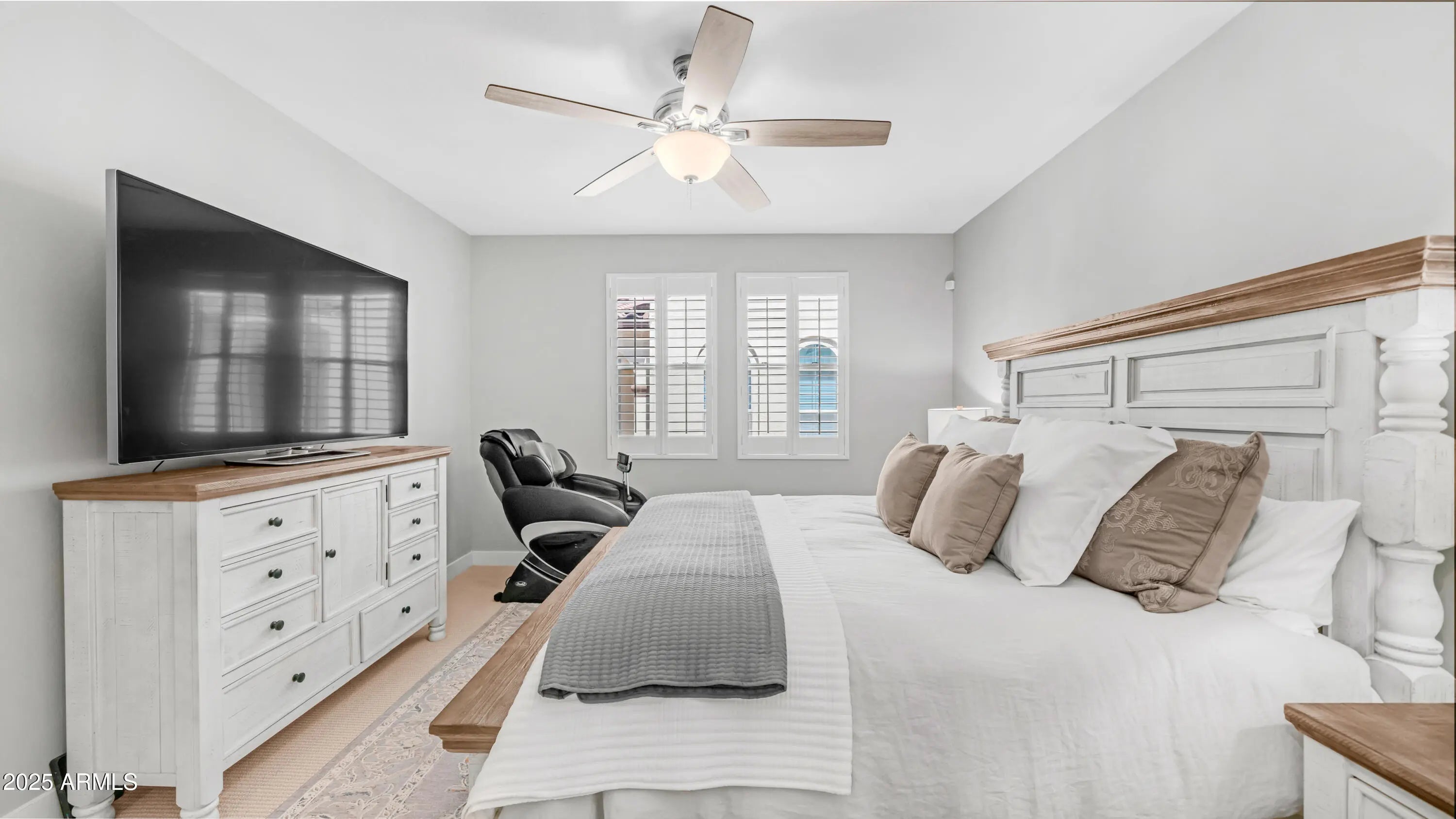 Welcome to this beautifully maintained home in the highly desirable gated community of Paseo Vista Village! This 3-bedroom, 2.5-bath residence features a spacious loft, ideal for a home office or entertainment space. The bright and open layout offers abundant natural light, enhanced by plantation shutters on most windows for a stylish and functional touch. The modern kitchen shines with stainless steel appliances, crisp white cabinetry, a walk-in pantry, a tiled backsplash, and a shiplap-accented island with breakfast bar seating. The downstairs primary suite includes a private en-suite bath and a remodeled walk-in closet, offering both luxury and convenience. Step outside to a cozy covered patio, perfect for morning coffee or relaxing evenings. Lots of common are spaces to gather Enjoy community amenities such as a sparkling pool, pet-friendly green spaces, playground, and neighborhood charm, all for just $264/month HOA dues under Paseo Village. Additional upgrades include a shiplap accent wall, wainscoting in the entry bathroom, updated bathroom mirrors, and ceiling fans installed in 2021. The home also features advanced smart home integration with a Lutron/Apple Home lighting and environmental control system (Alexa compatible), a Ring security system, and a remotely controlled garage lift door. The garage is further equipped with overhead storage shelving and a 240V hook-up, ready for an electric vehicle charger. Please note: Panel curtains in the family room do not convey. This is a rare opportunity to own a thoughtfully upgraded townhome in a prime Chandler location where comfort meets convenience, all just minutes from the 202 freeway and Chandler Municipal Airport.
