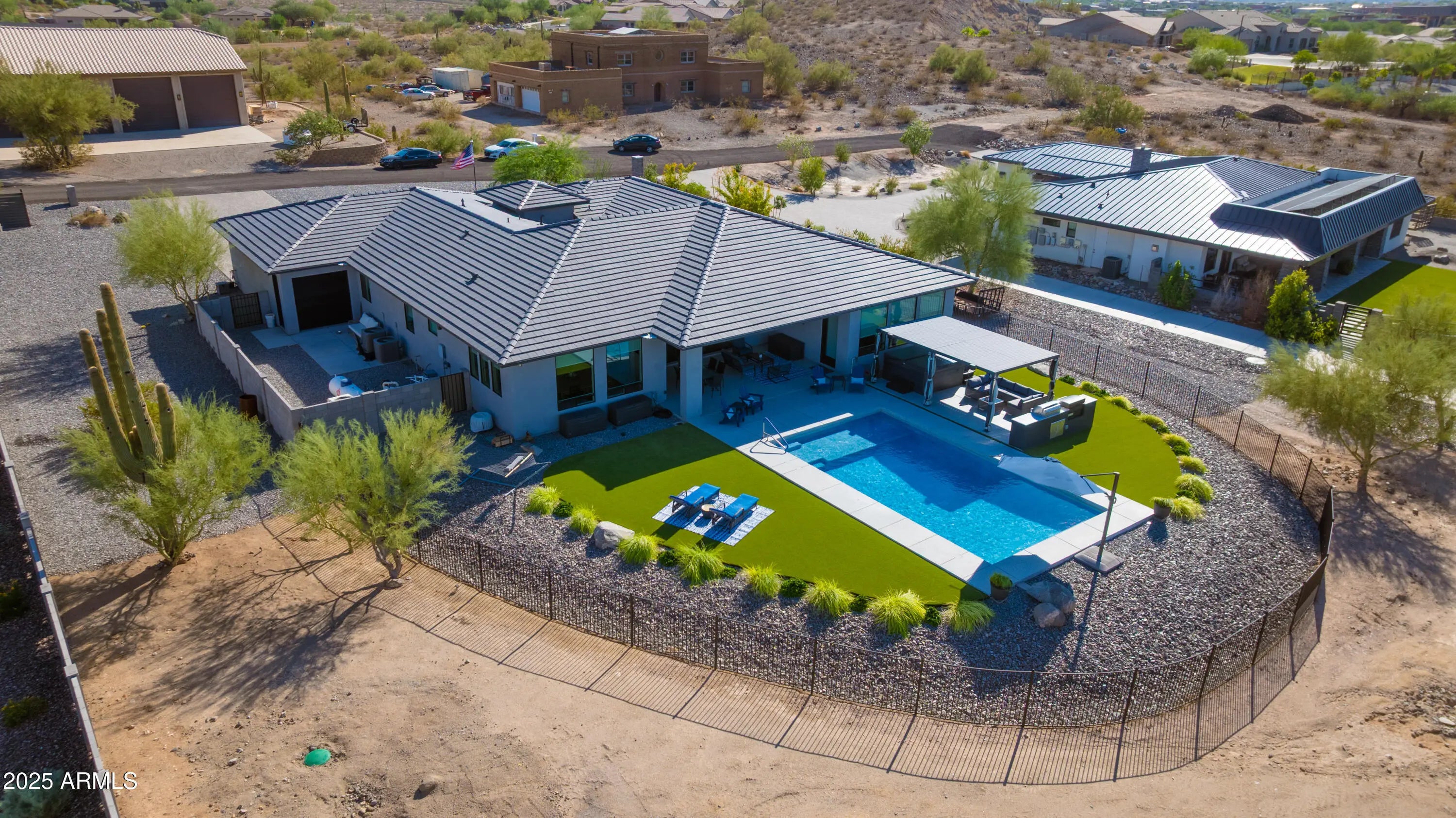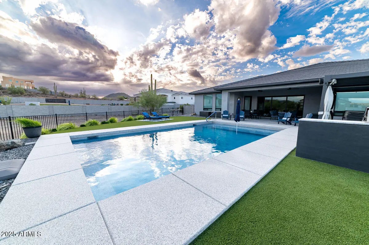 Welcome to your Desert Dream w/ 2x6 Exterior construction, 5.5 inch full spray foam insulation roof deck, exterior, and garage..NO HOA. Tranquil home set on a 1.098-acre lot. Bring your toys for the 1,245 sq. ft. garage w EV charger, 220 outlet & home has 400 amp service panel & 200 amp sub in garage. Inside you'll find water vapor fire feature, 10 ft ceilings, 4 en suite bedrooms, den and office, a chef's kitchen w/Dolemite waterfall edge counters, double fridge, butler pantry. Indoor-outdoor living w/ a 15 ft full pocket slider, insulated interior walls. Backyard features a heated & chilled pool w/ therapy jets, a spa,an outdoor kitchen, & a custom louvered pergola . All just minutes from Lake Pleasant. Home is walking distance to the Sunrise Mountain trails. 250 Gallon propane tank