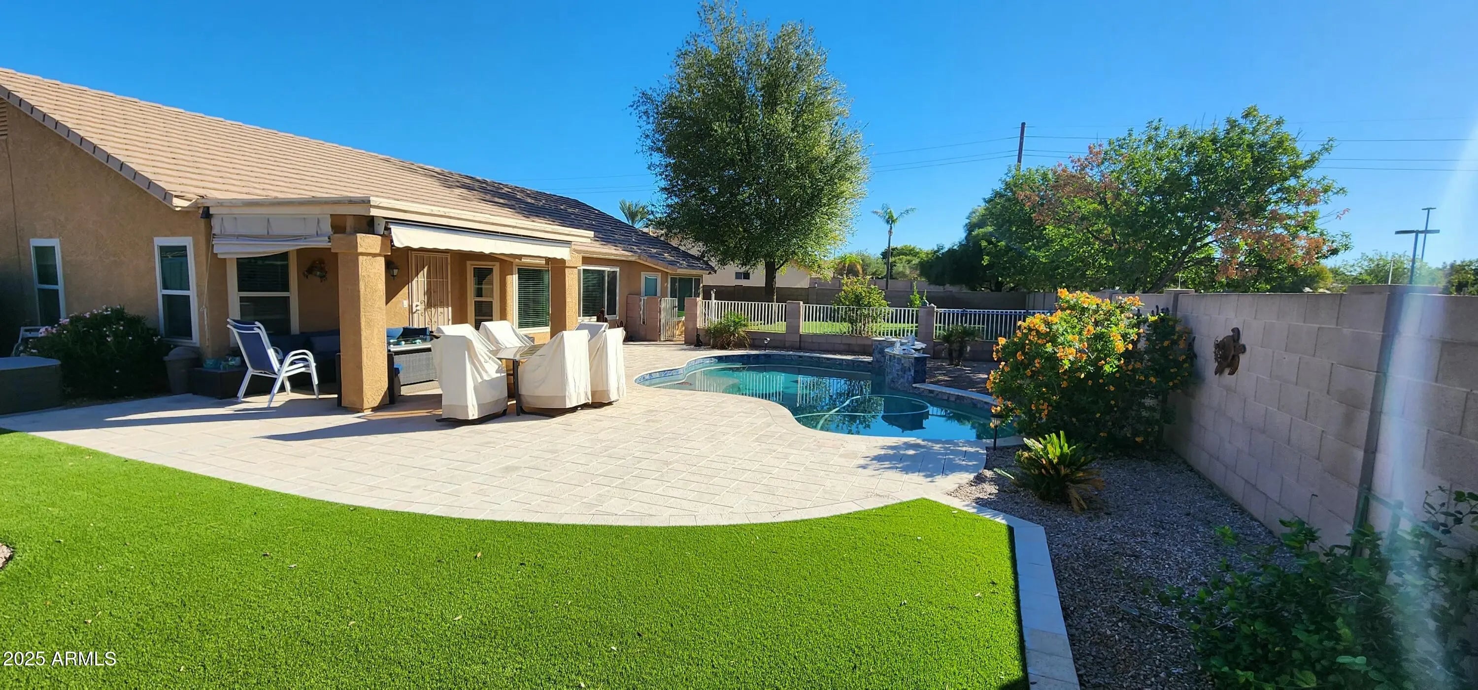 Beautiful home in wonderful Gilbert community near top rated schools, shopping, restaurants, hospitals, and easy access to 101 and 202 freeways. The 3-car garage has built-in cabinets, work bench and access to the gated RV parking area. The play pool has been fully remodeled with a gorgeous waterfall, expanded paver deck and artificial turf yard. A motorized awning extends shade for the patio. The oversized back yard boasts lush grass, shade trees, a lime tree and garden box. Inside is a large kitchen with island, breakfast nook and pantry. Dual pane bay windows in formal dining area and master bedroom. Master bath has a huge walk-in shower, walk-in closet and linen closet. Wood look luxury vinyl flooring through main living areas and master bedroom. Wired for whole house surround sound.