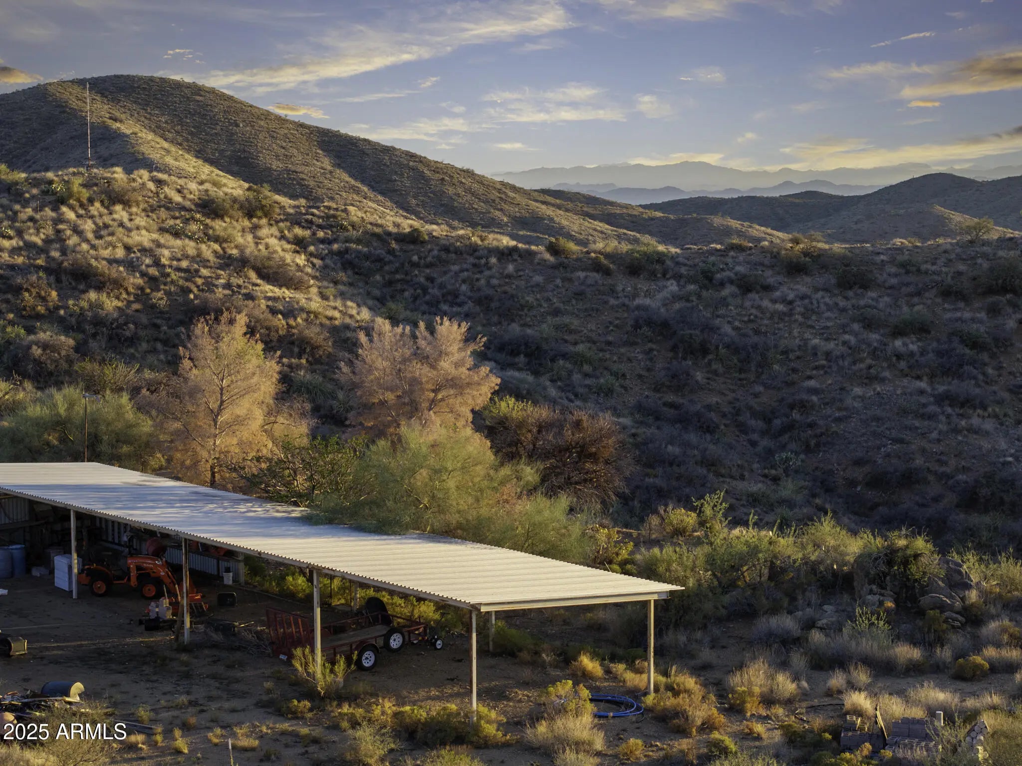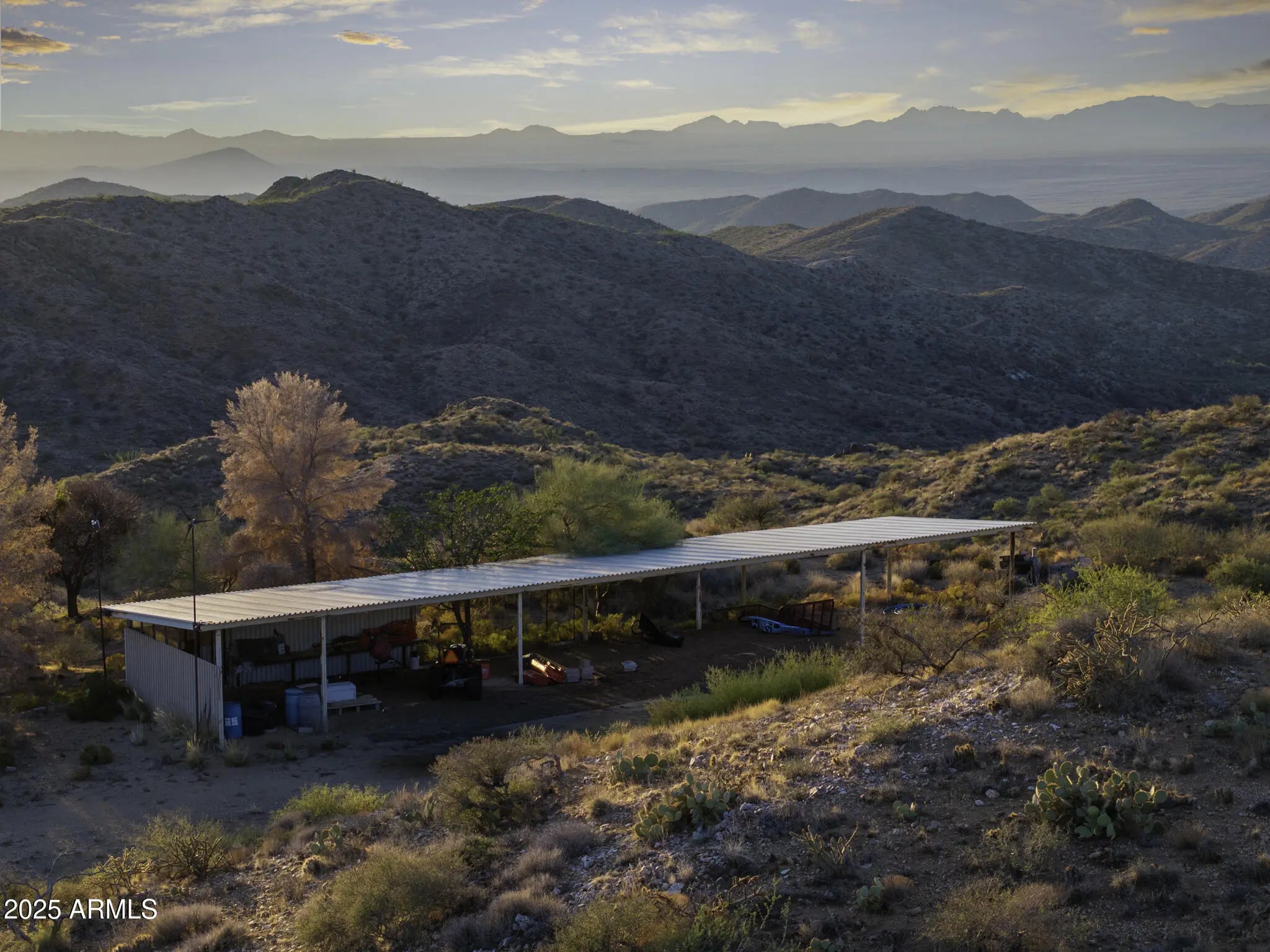 CALLING ALL CATTLE RANCHERS & OUTDOOR ENTHUSIASTS! This is an EXTREMELY RARE OPPORTUNITY TO OWN YOUR OWN PERSONAL PARADISE! Welcome to 5975 Aurora Hills Road, where desert living meets timeless design atop a private mountain at 4300 feet, surrounded by thousands of acres of Bureau of Land Management, overlooking the Wickenburg Valley. This turnkey adobe home with a metal roof offers peaceful seclusion, stunning sunsets, and unbelievable night skies just 1 to 1.5 hours from Phoenix and 20 to 30 minutes from Wickenburg. Built in 2011, the 1,300 sq ft residence features 2 bedrooms, 2 bathrooms, vaulted ceilings, and a sprawling wraparound porch on three sides. The property is fully self-sufficient with a 75 kWh solar system (58 panels, 10 lithium batteries, updated 6/23), propane, 5-ton AC, hot tub, real wood fireplace, water softener, chemical septic. High-speed HughesNet internet, and a new 80-gallon on-demand well pump installed in 12/23. Outside, enjoy a huge patio with 360° views, established trees and shrubs, landscape irrigation, a wildlife water hole, sports court, shed, carport, and a SkyCat Model 163 RV that sleeps 6. Smart features include a remote-control thermostat, camera system, & weather station. Recreation is abundant with hiking, ATV trails, hunting, shooting, gold panning, and easy access to Wickenburg's vibrant shops and events. An additional 36-acre parcel expands the opportunity with two wells, a perking septic system, two gold mines (Texas and Demon), three potential building sites with mountaintop views, a large equipment shed, and a 200-gallon water holding tank ideal for building out a cattle ranch (just add fencing), multi-home compound or private retreat. Tractor, ATV, and UTV are negotiable. Just add fencing for a great cattle ranch. Parcel outlines found in red are rough estimates. Seller financing is available if needed! -5975 W Aurora Hills Rd.: 15.66 acres, parcel #: 204-21-025-A 2024 taxes: $1,074.20 -6300 W Aurora Hills Rd.: 36.984 acres, parcel #:204-21-025-G 2024 Taxes: $457.74