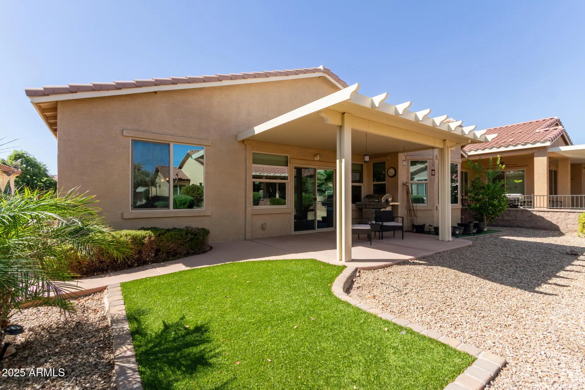 Welcome to the highly desirable 55+ Mission Royale community! This fully upgraded, all electric, energy-efficient home with PAID solar & additional battery with 7.5kwk of storage is move-in ready! Enjoy your morning coffee in the charming front courtyard before stepping inside to find 2 bedrooms, 2 bathrooms, tile & carpet flooring, recessed lighting, ceiling fans, & surround sound. The entertainer's kitchen features white cabinetry with hardware, granite countertops, drop-down deep sink, pendant lights, RO system, and stainless steel appliances. A 150 sq. ft. Arizona room offers extra living space. The primary suite boasts dual sinks and a walk-in shower. The extended garage impresses w/ cabinets, epoxy floors, sink, soft water system, and utility door. Furniture available for purchase. Mission Royale residents enjoy a 15,000+ sq. ft. clubhouse with fitness center, library, billiards, and crafts room. Outdoor amenities include pools, spa, walking paths, tennis, pickleball & bocce ball courts. Golf enthusiasts can join the Mission Royale Golf Club for access to the 18-hole course. Close to shopping, dining, medical centers, and parks, this is 55+ living at its finest!