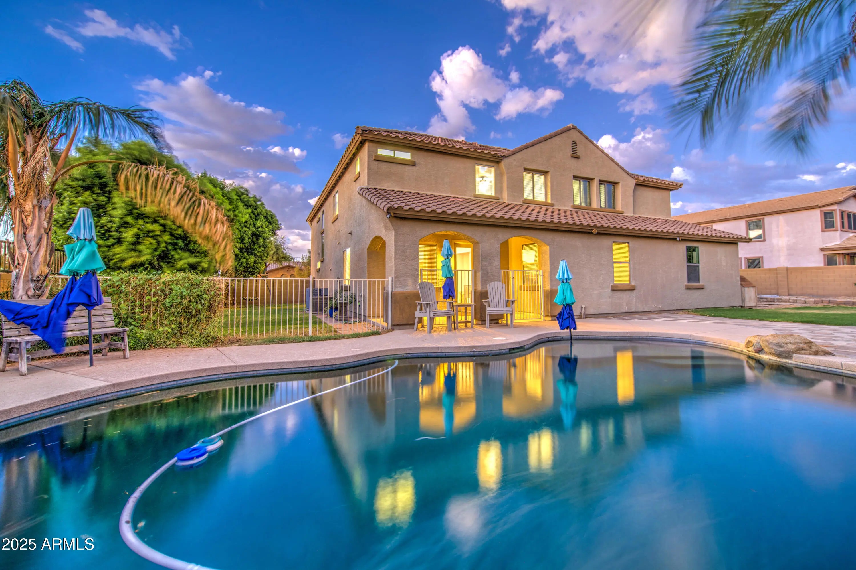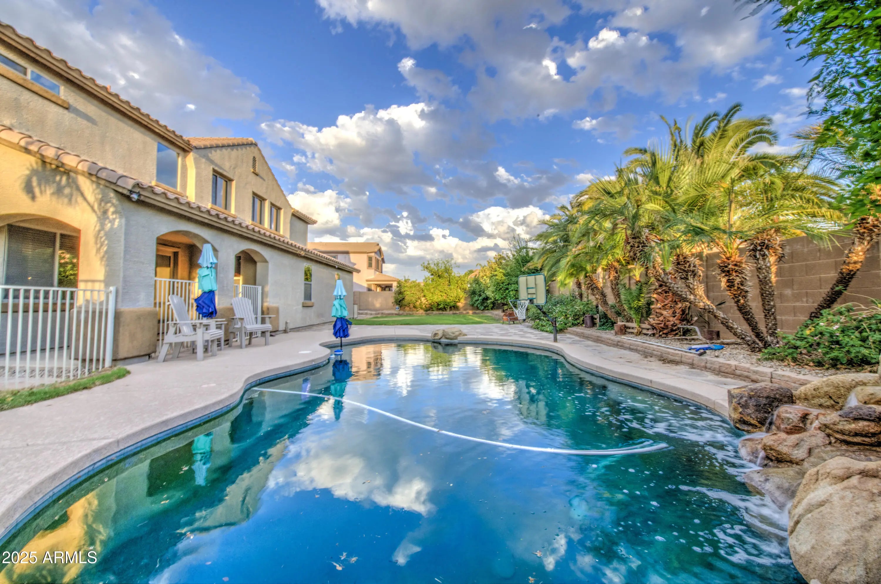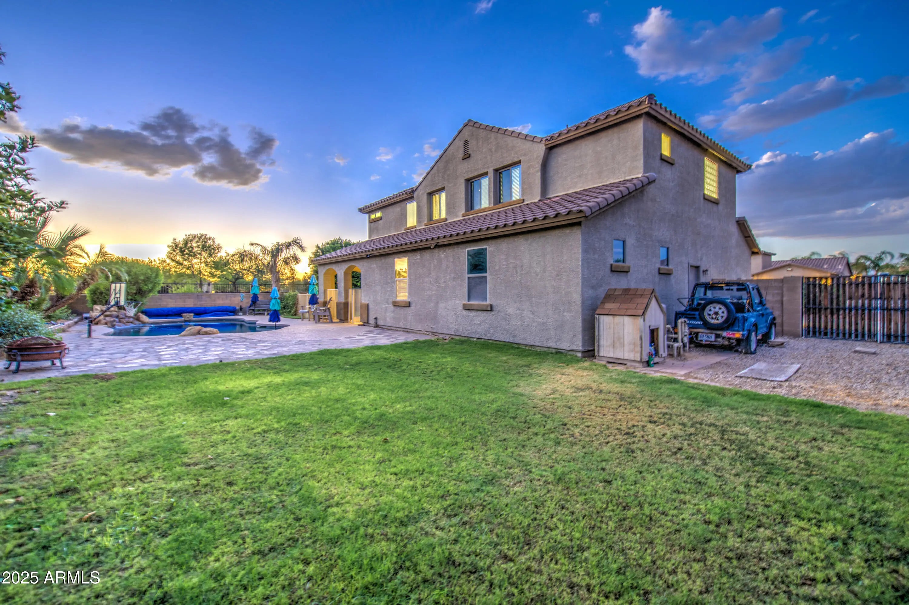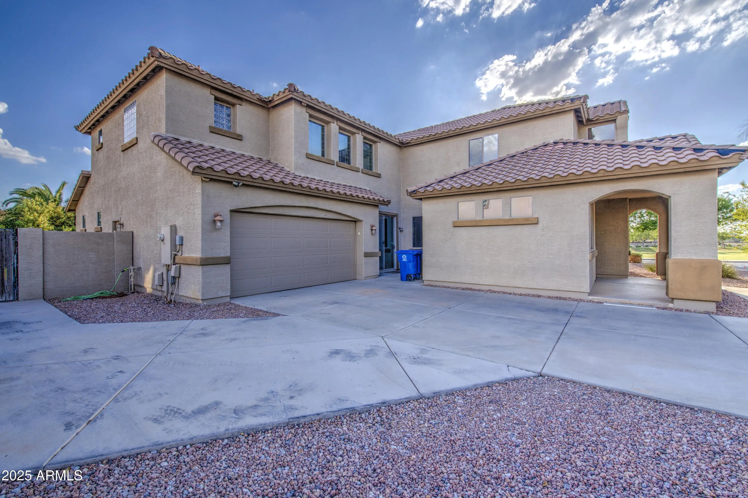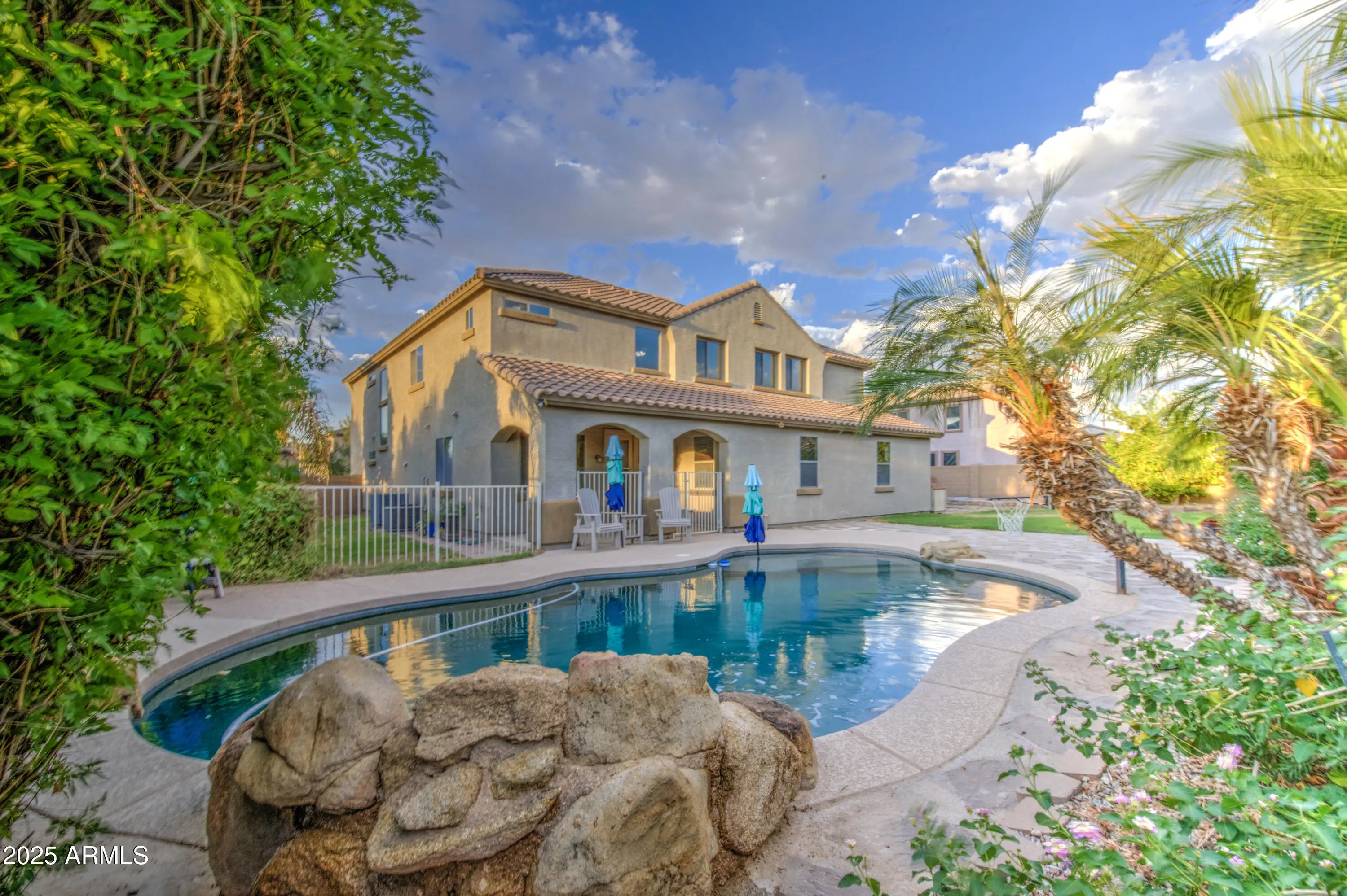 Stunning 5-Bedroom, 5-Bath Home on Oversized Corner Lot Across from Park! This beautifully upgraded 5-bedroom, 5-bathroom home sits on an oversized corner lot that sides a greenbelt and is directly across from a community park. Offering incredible space and versatility, this home features a 4-car tandem garage and RV gate—perfect for all your vehicles and toys! Inside, you'll find an open-concept kitchen with a large island, walk-in pantry, and ample cabinetry—ideal for cooking and entertaining. The formal living area welcomes you near the entry, while the family room opens to a covered patio and expansive grassy backyard complete with a fenced, 9-ft deep diving pool with a waterfall. Downstairs includes 1 bedroom with a bathroom nearby plus a den with an adjacent full bath, making it perfect for a guest suite or home office. Upstairs, the primary suite boasts a private sitting or exercise area, spacious bathroom, and generous closet. A loft provides additional flexible space for a game room, media center, or play area plus 3 additional bedrooms upstairs. There are 2 full bathrooms down and 3 upstairs. Come to see this beauty today! Great location. Queen Creek offers all the shopping, dining, entertainment and experiences you are looking for. Minutes to freeway access to get to all the places outside town.