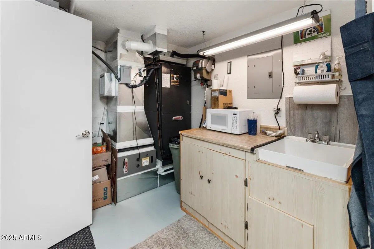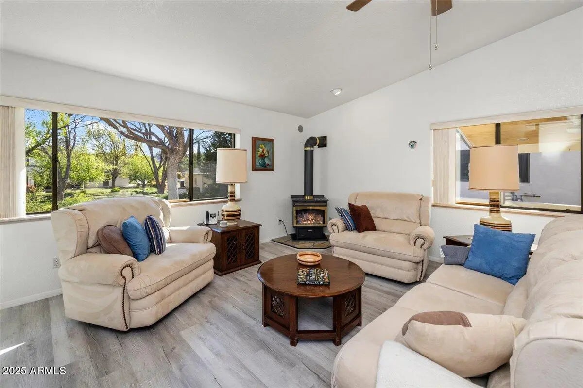 If you are searching for a hidden gem in the Verde Valley, YOU MUST SEE THIS 3074 SQUARE FOOT SINGLE FAMILY HOME IN PERSON. (3074 Total sq ft, Main level 1586 sq ft, 1488 sq ft basement). This breaks down as 2,333 sq ft of living space which consists of two bedrooms on the main level including a large master suite with walk-in closet, private covered patio, a 3/4 bathroom, and a laundry room with ample storage. Second upstairs bedroom has a walk-in closet and is next to a full bath. Finally, main level includes an open concept living space complete with a natural gas fireplace, dining area with built-in breakfast nook, large kitchen (w/ walk-in pantry, gas range) and access to another huge 400 sq ft covered patio. Basements are relatively rare in AZ; this has one as big as a house...MORE. itself at 1488 sq ft with heating and air conditioning. Downstairs living space features a family room with surround sound & built-in wet bar, a third bedroom with egress, a 3/4 bathroom, a storage room. Additionally, the basement features a completely unique 741 sq ft creative space that could serve as a game room/rec room/home gym/craft room/bunk room/artist space or endless other possibilities. It is currently configured as a woodworking shop with built in cabinets, utility sink and an office. You might not use the two car garage with epoxy floors given that you can walk to grocery store, banks, pharmacy, restaurants and doctors' offices. 3rd party sites may inaccurately classify this as an apartment. Do not be misled. This is a one-of-a-kind meticulously-maintained freestanding home, tucked away on a private street.