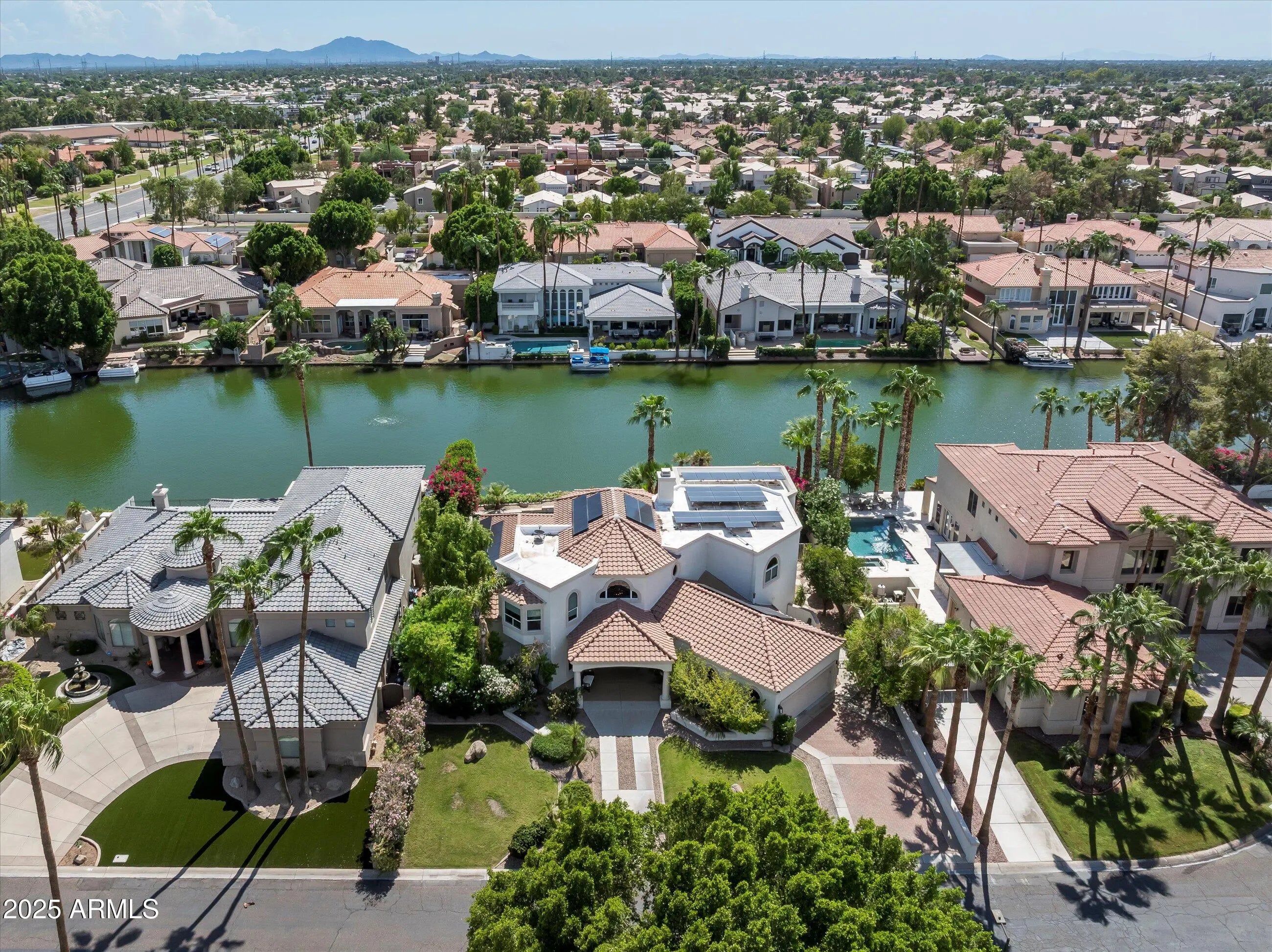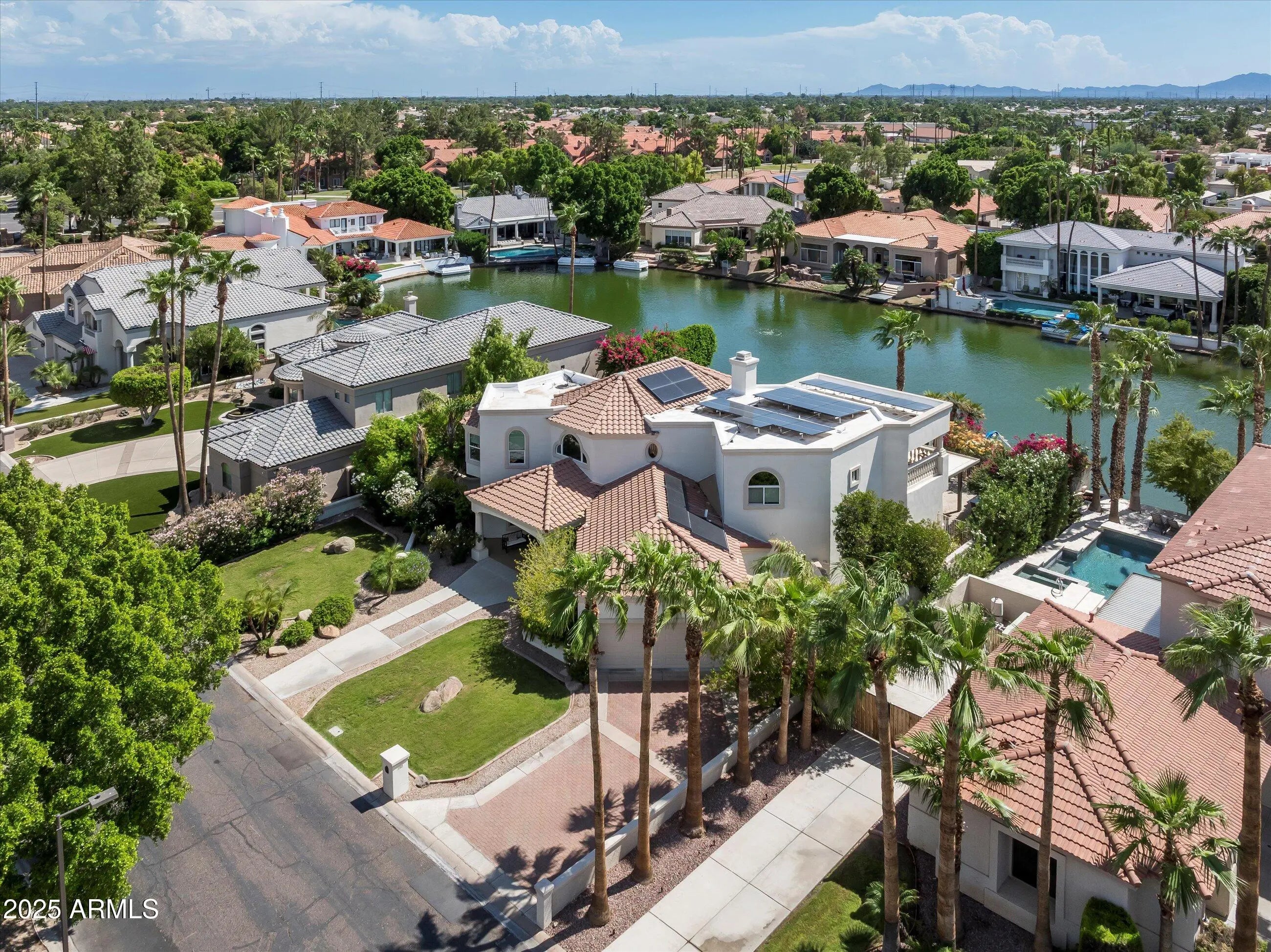 Welcome to 1407 E Coral Cove, a lakefront home with 5-bedroom, 3.5-bathrooms, 4,342 sq ft of beautifully designed living space in one of Gilbert's most desirable communities. Enjoy true Arizona resort-style living with sparkling pool & spa, and direct lake access from your own private dock, - perfect for kayaking, paddle-boarding, or just soaking in the sunset views. Inside, an open-concept layout with soaring ceilings, a spacious great room, and kitchen featuring granite countertops, stainless steel appliances, and ample cabinet space. The oversized primary suite has lake views, a spa-like ensuite bathroom, and a walk-in closet. Energy efficiency is covered with a fully owned Tesla solar system - keeping utility costs low while maximizing sustainability. Located in the prestigious Val Vista Lakes community, residents enjoy access to world-class amenities including a multi-million dollar clubhouse, sandy beach lagoon, tennis & pickleball courts, fitness center, heated Olympic-style pool & spa, and miles of walking/biking trails - all set in a lush, waterfront setting. This is more than just a home - it's a lifestyle. Don't miss your chance to live lakefront in Gilbert's premier master-planned community.