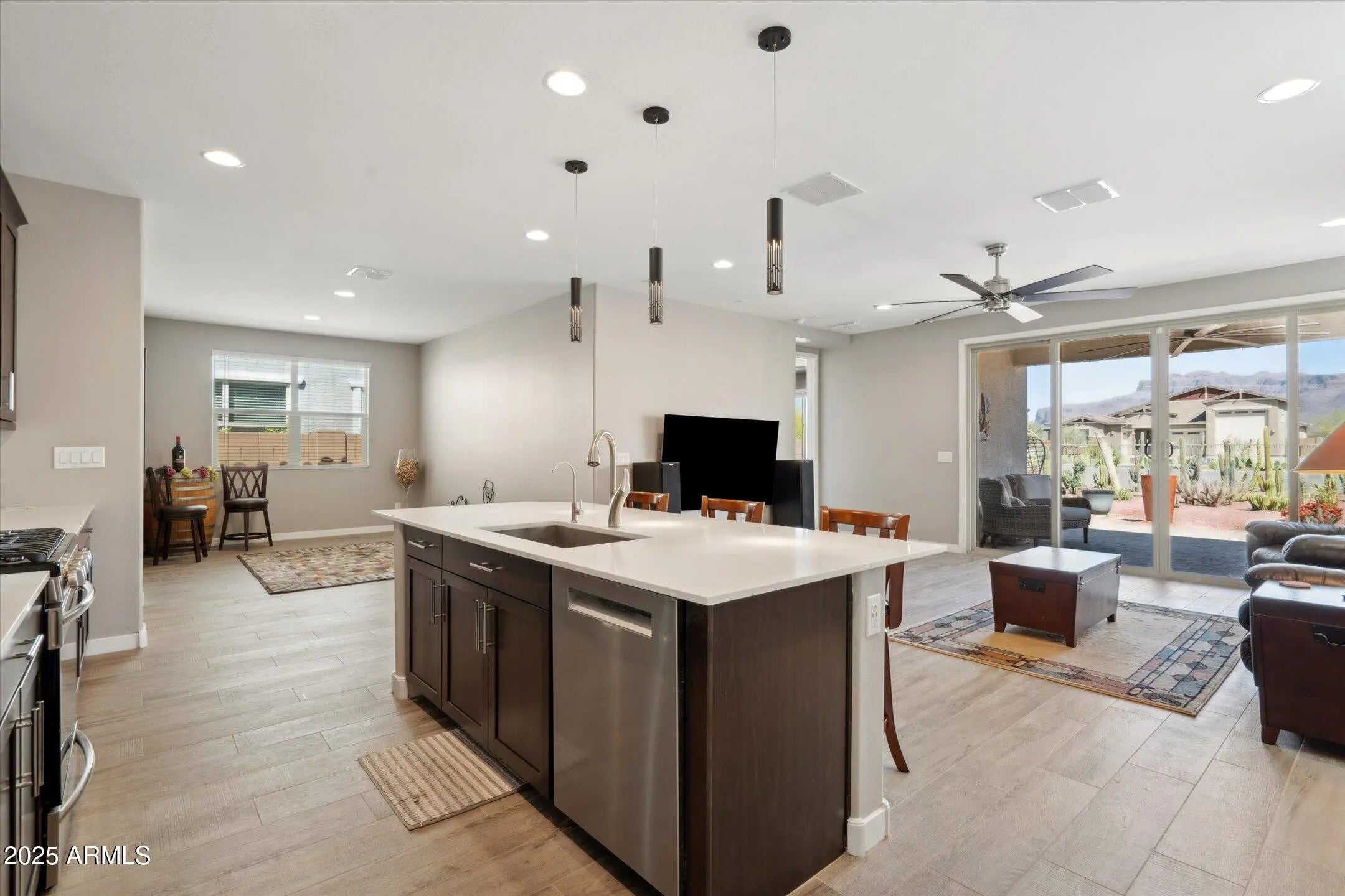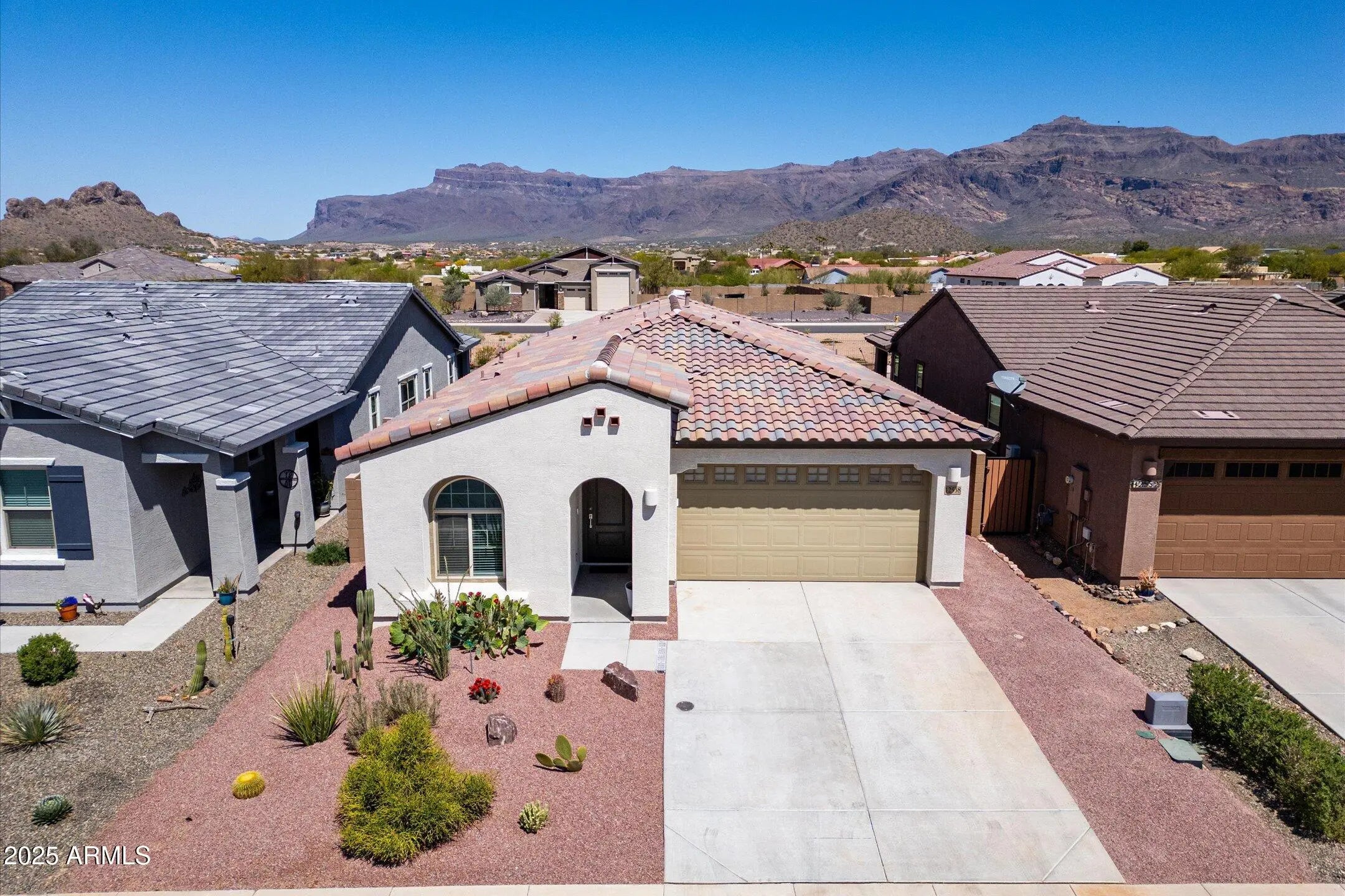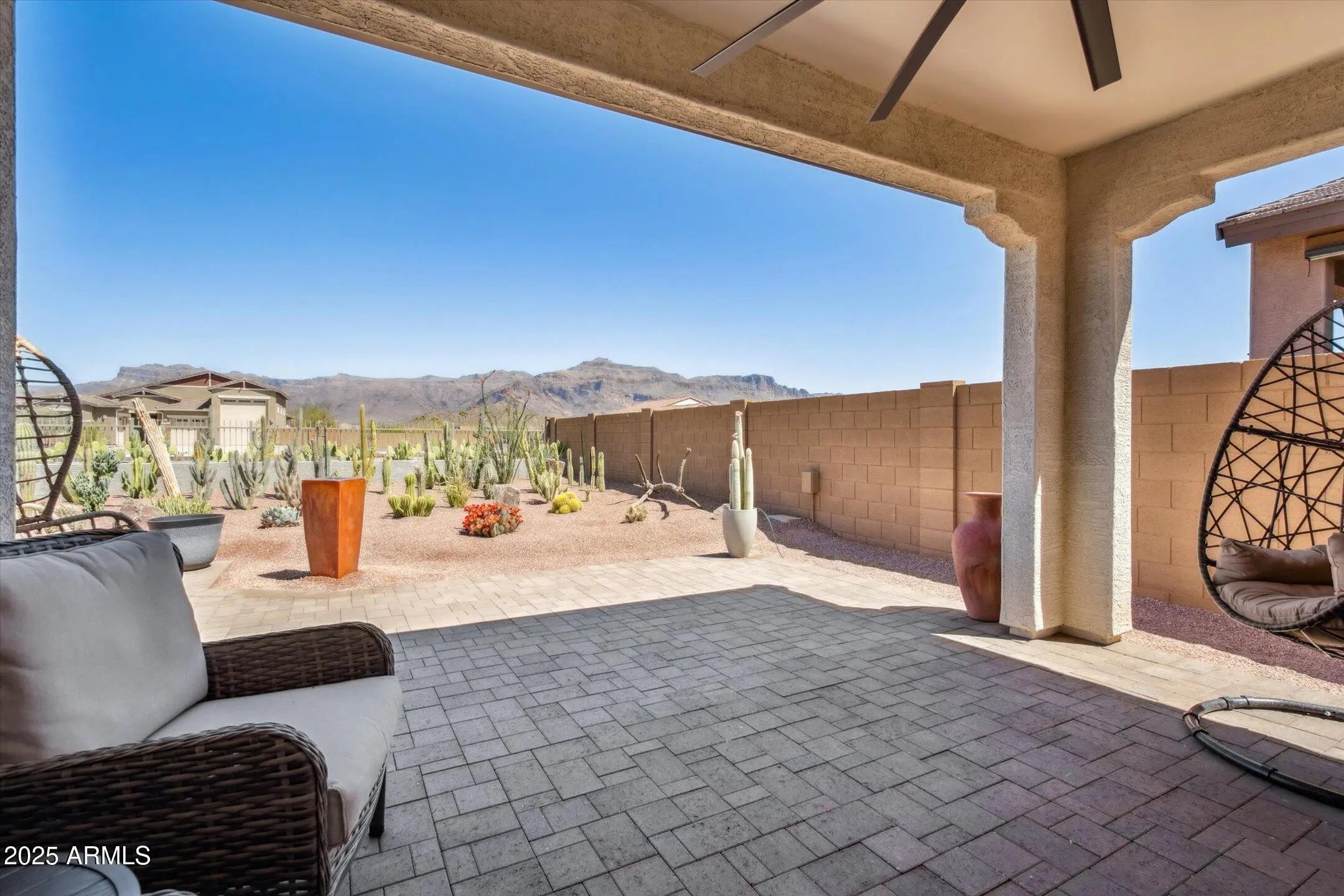 Stunning 1960 square feet, 4 bed, 3 bath single-level home in Gold Canyon's Peralta Canyon community! Fully furnished (see list). Built in 2021 with breathtaking views of the Superstition & Dinosaur Mountains from the backyard, great room, kitchen, and primary suite. Serene backyard with covered patio, extended paver patio, and serene water feature. Kitchen appointed with quartz counters, espresso cabinets, gas cooktop, walk-in pantry. Primary Bedroom offers a large tiled shower with bench & double sinks. Tile throughout the main areas (carpet in bedrooms only) -enough new matching tile for the primary bedroom - stored in the garage. Washer/Dryer/Fridge included. Other added benefits include french drains on sides of home, gutters & epoxied garage floor with built-in cabinets. A BEAUTY