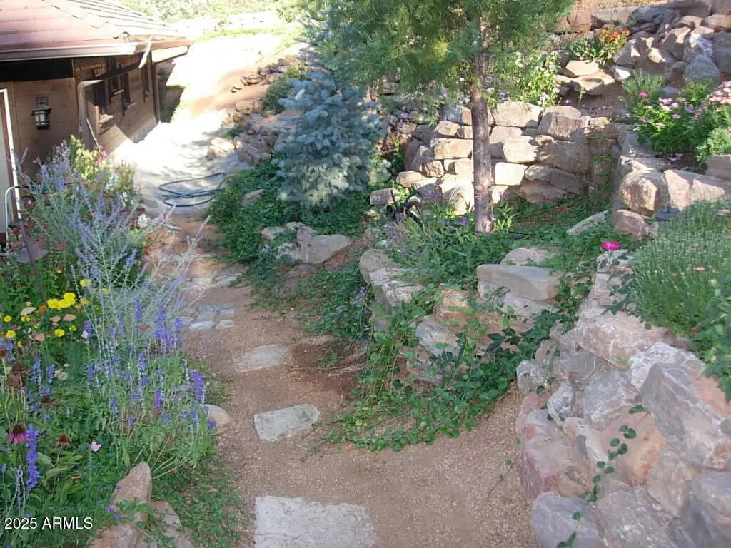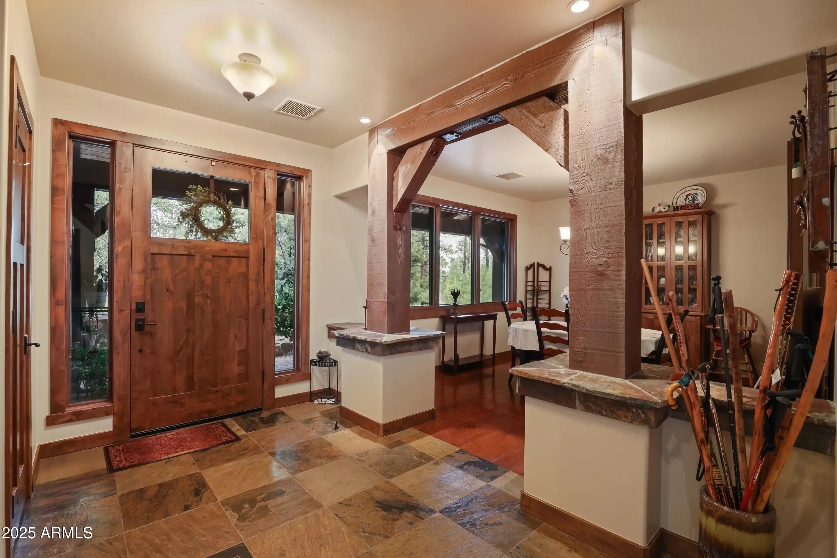 Single-Level, Furnished Home with Golf Course View. 3-bedroom, 3-bath freshly painted residence combines elegance, comfort, and efficiency in a serene setting. Upon entering, massive beams and a welcoming stone fireplace set the tone for this thoughtfully designed home. The kitchen features granite countertops, an island, and a unique mountain silhouette backsplash—perfect for both cooking and entertaining. A split floor plan offers privacy, with the primary suite showcasing double closets and a spa-like bath. Hardwood floors flow throughout, while the separate office provides inspiring views of the 14th green, also enjoyed from the dining room. Step outside to a lush, garden-like backyard, ideal for relaxation as you enjoy the many colors, plus there is room for gardening. A recently added owned solar system keeps utility costs low, while the large driveway offers ample parking for guests. Quietly nestled in a prime location, this home blends golf course living with mountain charm.
