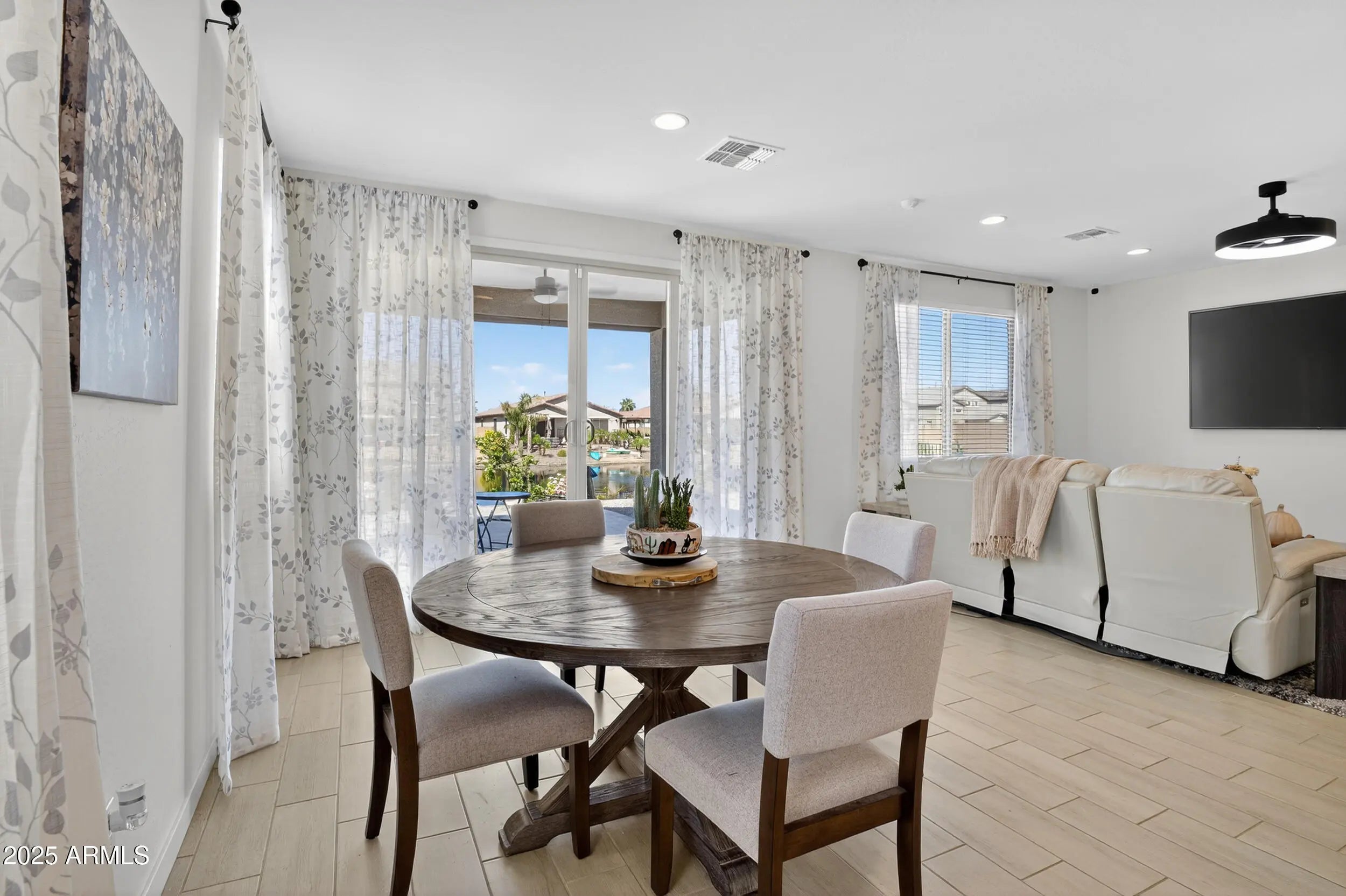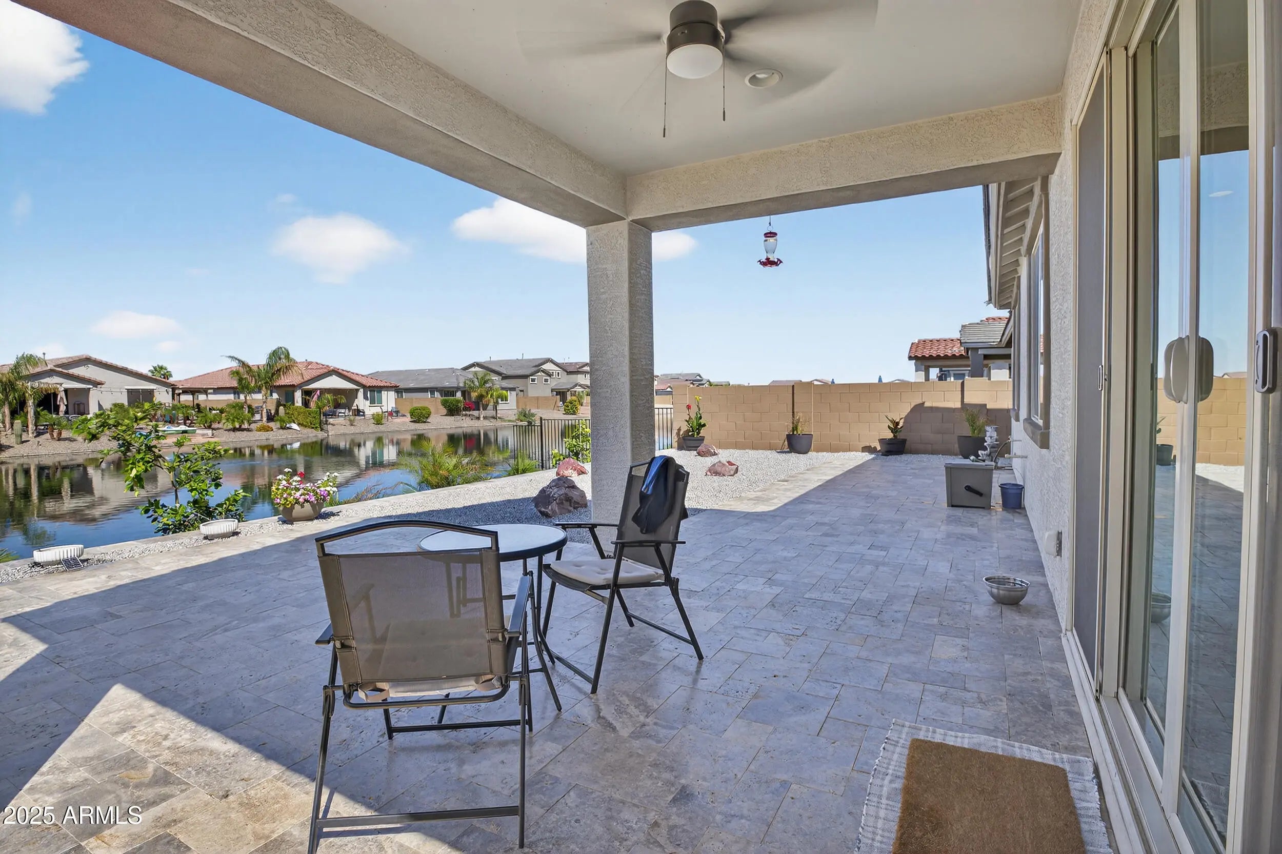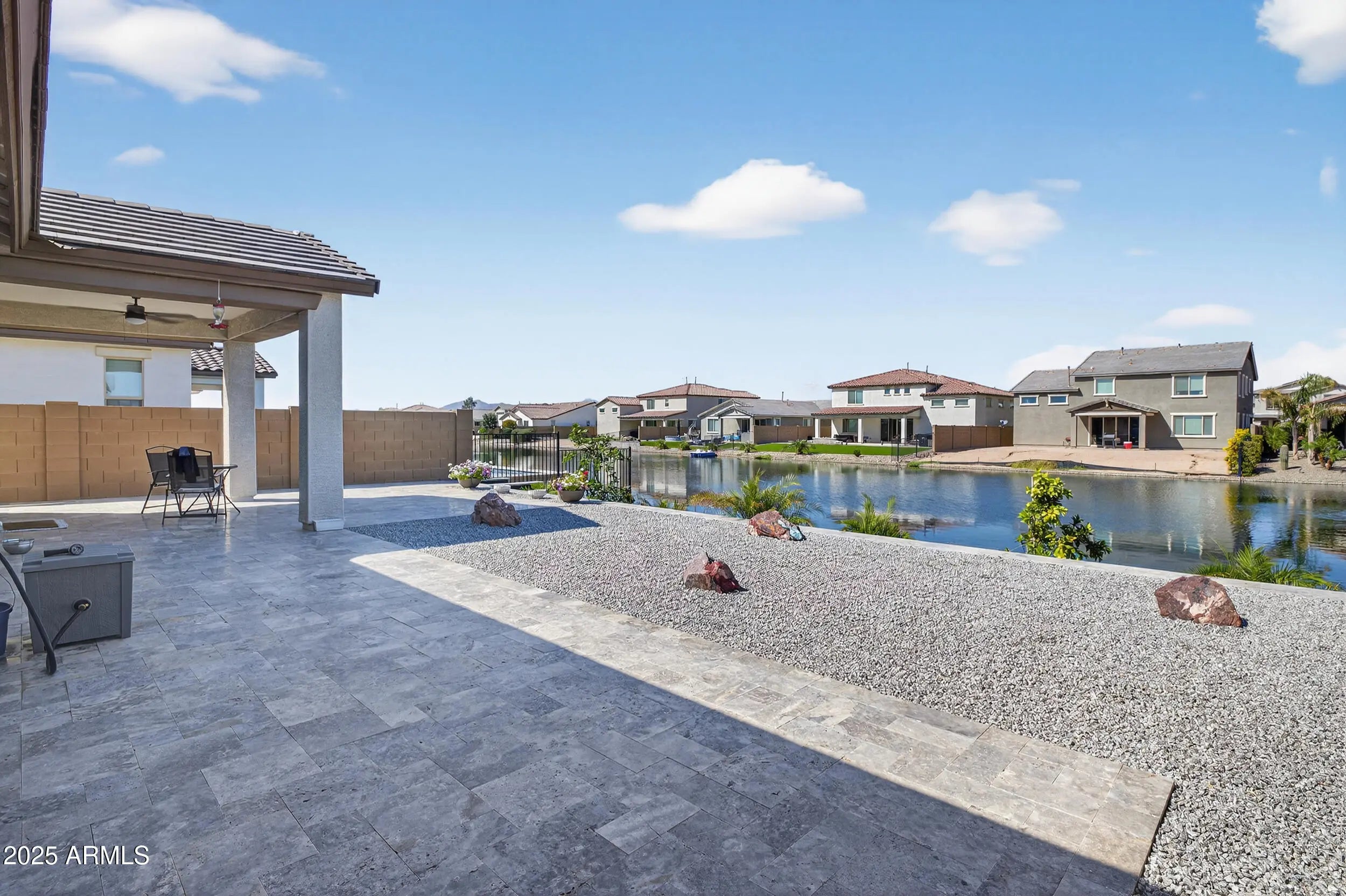 Enjoy LAKEFRONT living in this BEAUTIFUL 3-bedroom, 2-bath home BUILT 2024 PLUS office with a set of French doors. ''VOTED BEST HOME ON TOUR'' and $50,000 UPGRADES* in Exquisite backyard landscaping with TRAVERTINE Tile, Fruit Trees, Turf Grass and more on the LAKE. Welcoming home with paver driveway and a grand entrance to an open floor plan where the Kitchen has Upgraded Cabinets, QUARTZ Countertop, Tile Backsplash, Pendant Lights, and SS Appliances is open to the dining and living room, perfect for gatherings or quiet evenings in. The primary suite features a spacious walk-in closet, dual vanities, and a walk-in shower for a private retreat. Outside, a covered patio offers the perfect place to sip morning coffee or unwind at sunset while taking in tranquil water views.