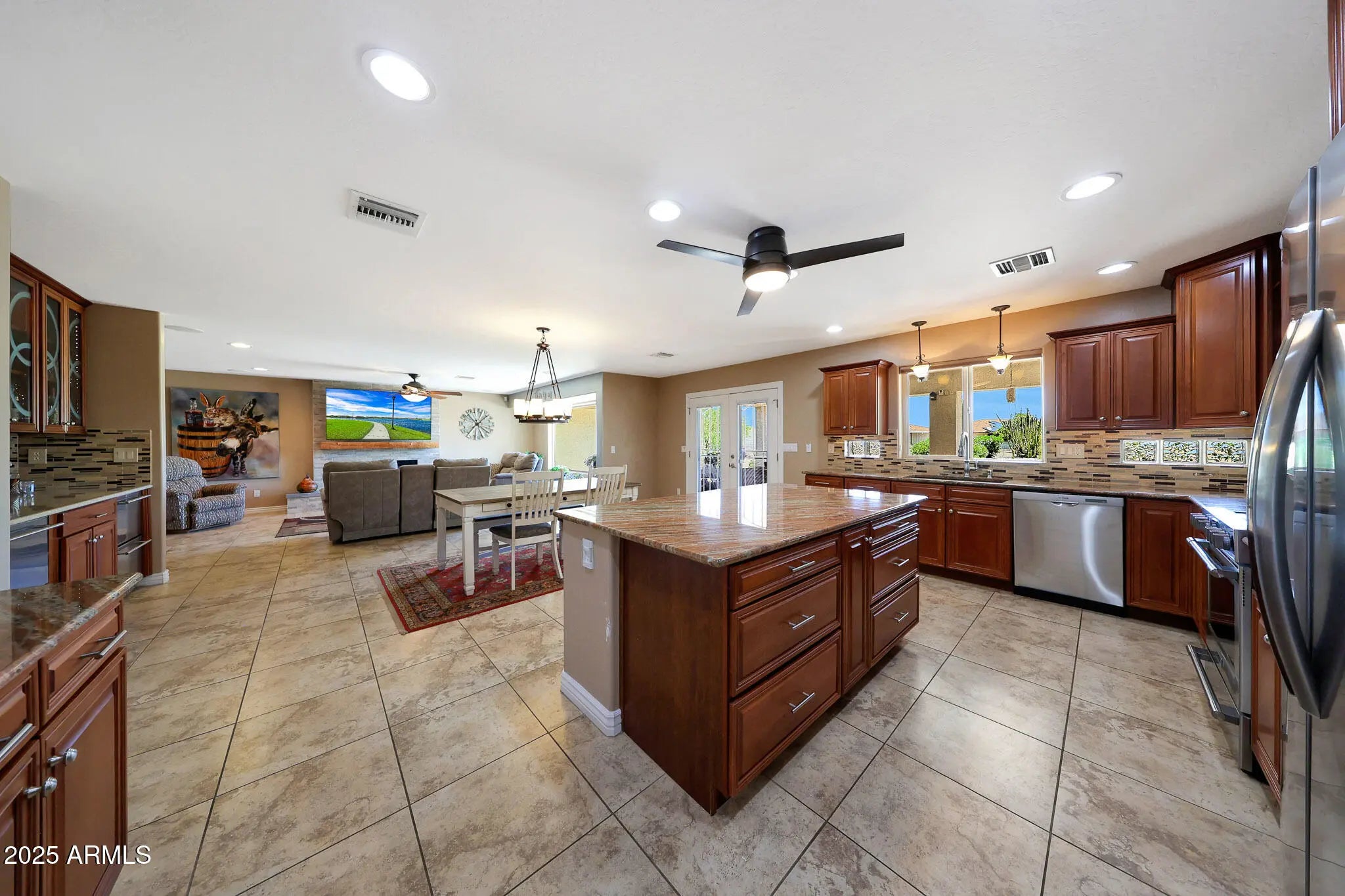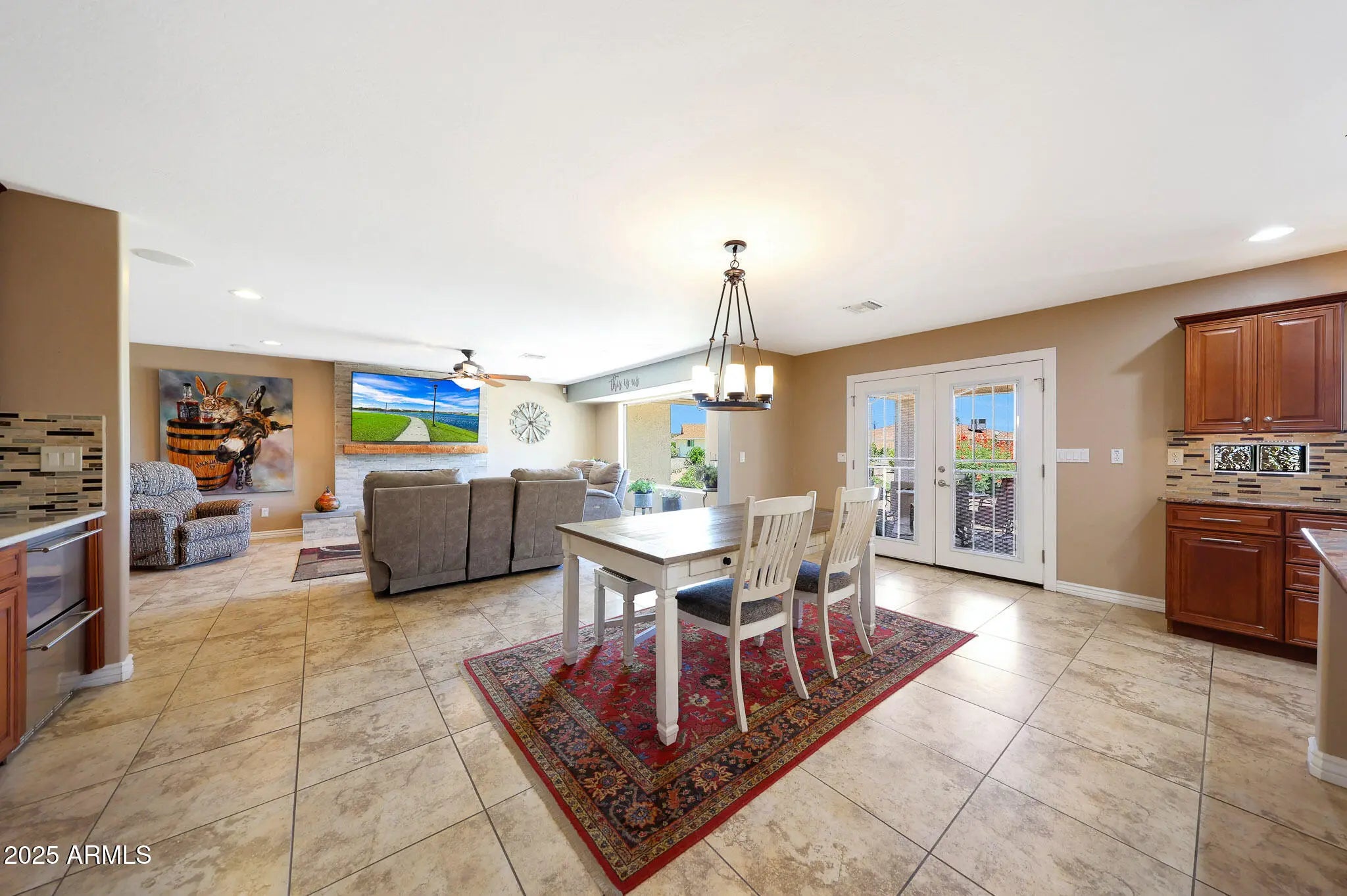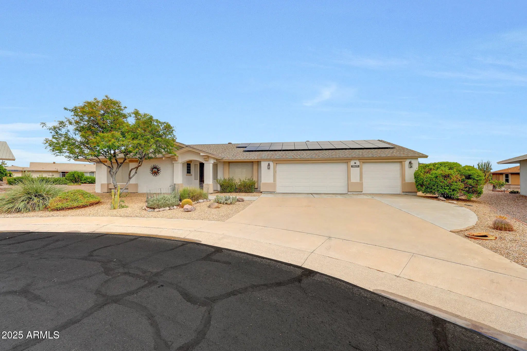 Welcome to Del Webb's Original Sun City. Where you can enjoy 8 golf courses, a33 acre man-made lake, 7 recreation centers, an outdoor amphitheater & dog park. Enjoy all of this from your own desert oasis in a remodeled ('08) & updated 2400 sq ft 3 bedroom 2 bath home. Neutral tile, paint & recessed lighting & fans throughout, Custom kitchen cabinetry, new stainless appliances in '24, granite countertops, kitchen island, lighted custom butler's pantry w/ 4 temperature controlled refrigerated drawers. Open great room/eating area w/ picture window w/views of spacious desert landscaped back yard. Electric fireplace w/ eucalyptus mantel, surround sound system & Wall mounted tv conveys. Formal dining &/or living room . Primary bedroom features bay window, ensuite w/ large walkin closet, snail shower, granite dble sink vanities & private toilet closet. 2nd & 3rd bedrooms have walk in closets. 3 car garage with coated garage floor & ladder access to attic, custom built in cabinets, water softener Paid for owned solar in '24 & new roof in '25. Custom window coverings throughout.