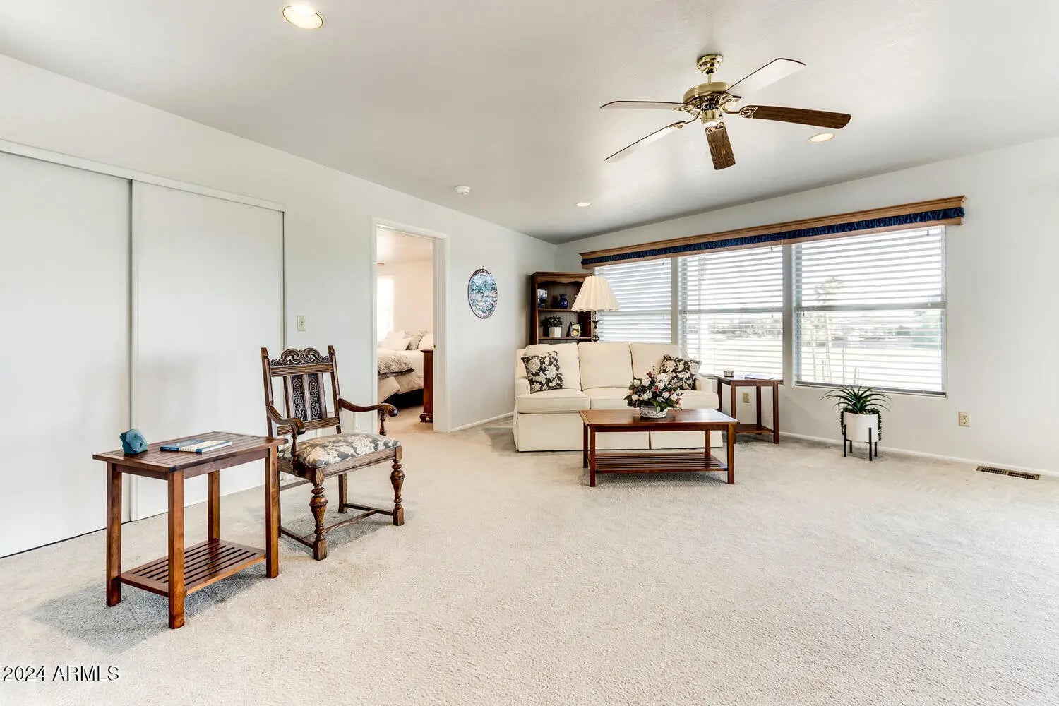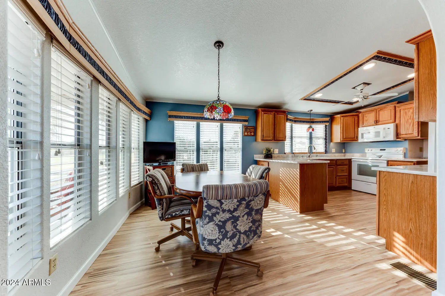 Experience tranquility in sunny Arizona as you enjoy breathtaking sunrises over the 12th hole of The Great Eagle Golf Course from your multi-season Arizona room. This meticulously maintained home in Happy Trails RV Resort located in Surprise offers a welcoming covered front porch, a spacious living room, and a large master suite, a guest bedroom, two bathrooms, an indoor laundry area, and a remodeled kitchen with elegant quartzite countertops with newer appliances. Additional features include newer water heaters, a reverse osmosis system, a water softening system, a reconditioned swamp cooler, TPO roofing over the shingles, and a newer AC/heat pump. The workshop/shed is ideal for storing your golf cart or working on projects. Don't miss your chance to make this stunning home yours! Experience tranquility in sunny Arizona as you enjoy breathtaking sunrises over the 12th hole of The Great Eagle Golf Course from your multi-season Arizona room. This meticulously maintained home in Happy Trails RV Resort located on lot #349 offers a welcoming covered front porch, a spacious living room, and a large master suite, a guest bedroom, two bathrooms, an indoor laundry area, and a remodeled kitchen with elegant quartzite countertops with newer appliances. Additional features include new soft water heaters, a reverse osmosis system, a water softening system, a reconditioned swamp cooler, TPO roofing over the shingles, and a newer AC/heat pump. The workshop/shed is ideal for storing your golf cart or working on projects. Don't miss your chance to make this stunning home yours!