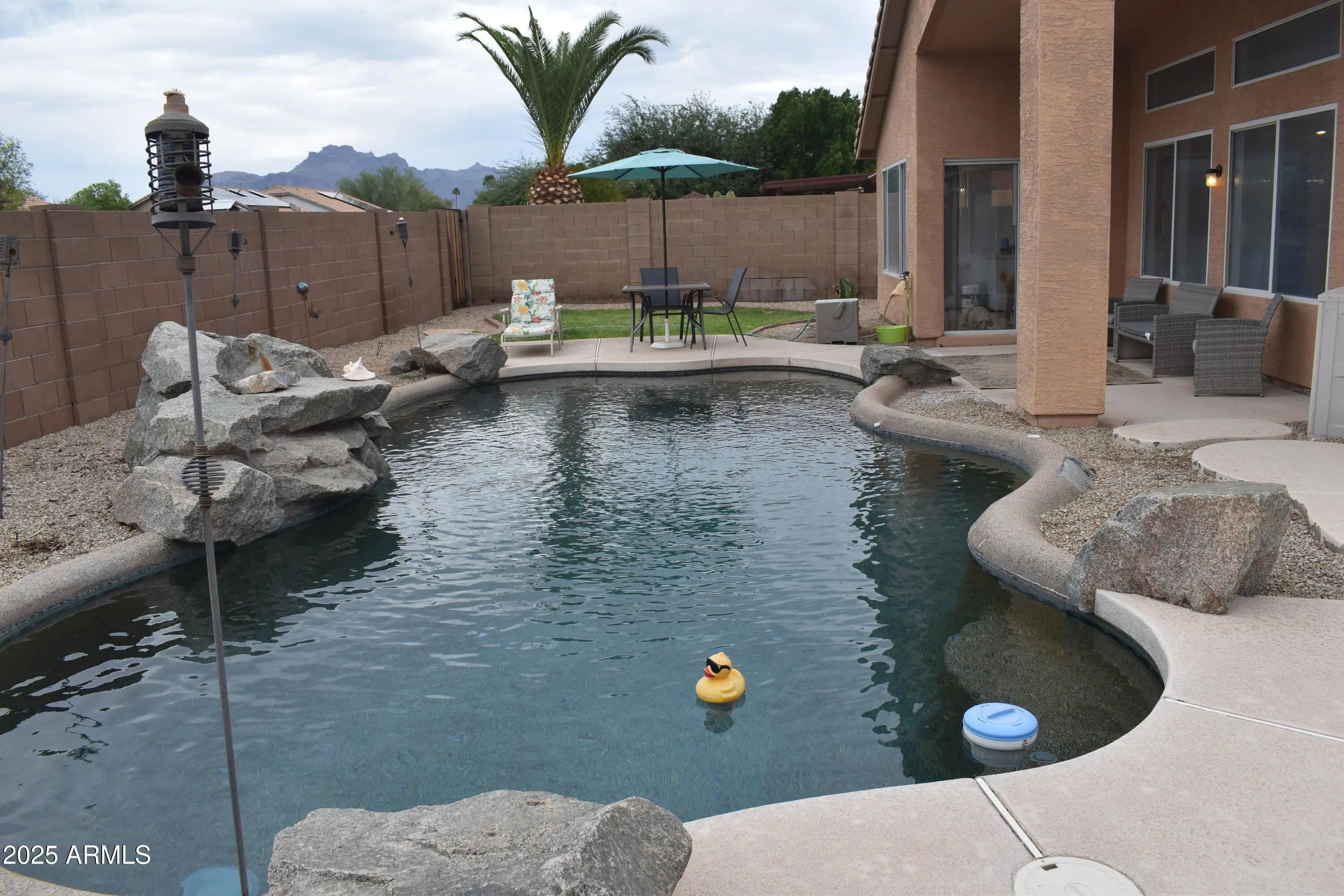 No HOA, No neighbors behind, only breath taking view of Superstition Mountains from sun up to sun down Sweet curb appeal,security gate entry. Fall in love with this beautiful 3/2, plus den. Kitchen w/ breakfast bar, and new stainless steel appliances. Vaulted ceilings in living room, den, and master adds lots of natural lighting through out home. Fresh paint, new lighting and fixtures Master suite new flooring, dual sinks, walk in closet, and custom jacuzzi 10 ft shower. Of course french doors to backyard for quick dip in pool on warm summer nights. Entertain friends and family under covered patio. Gated dog run for your pups. Private gate to walking path. 2 car garage with ample storage. A must see!!