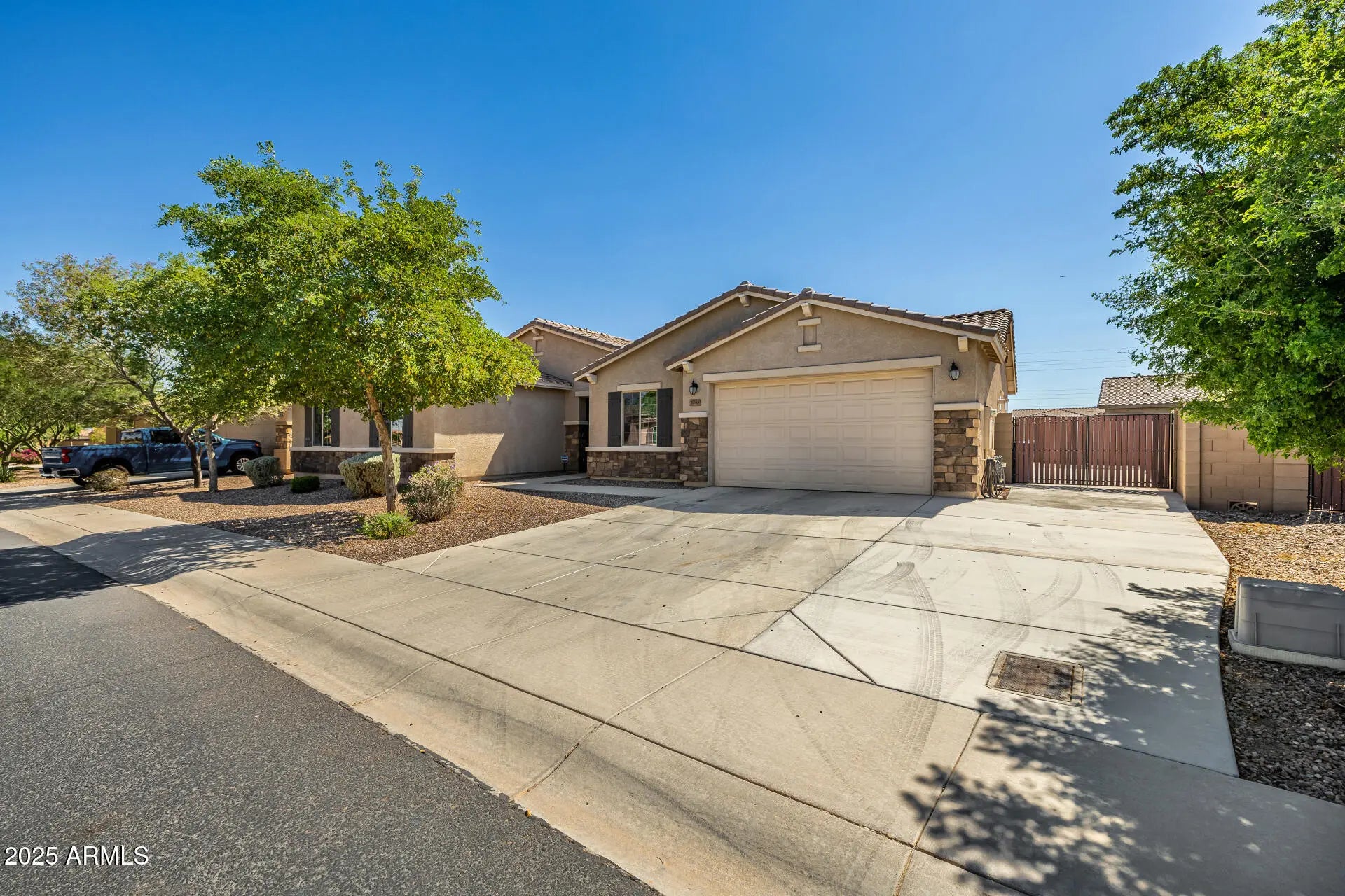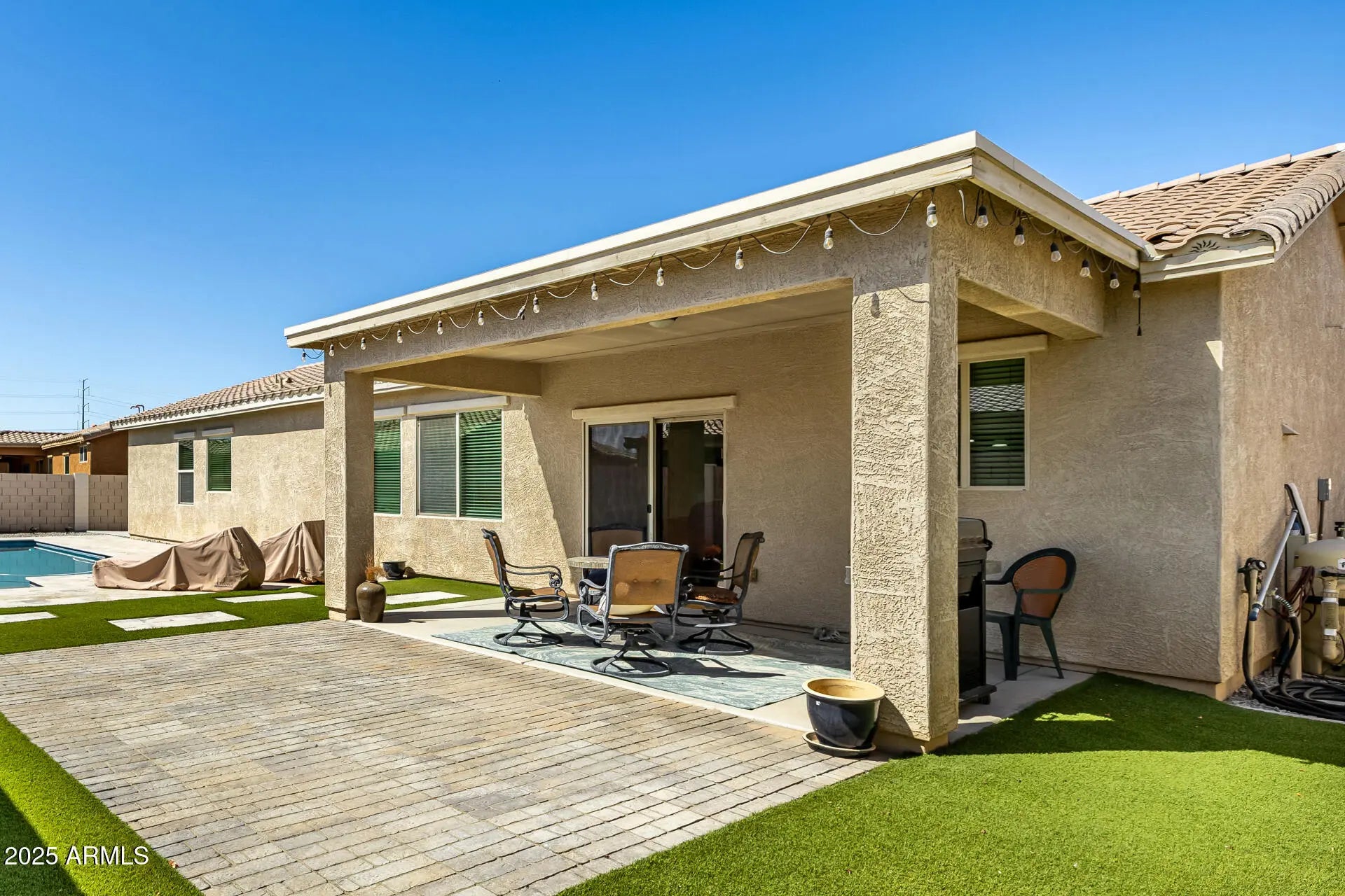 The search is over! Welcome to this lovely 4-bed residence with a 2-car garage, an RV gate, and stunning stone accents. Discover a tranquil great room with high ceilings, blinds, durable tile flooring, and sliding door access to the backyard for seamless indoor-outdoor flow. The gourmet kitchen comes with granite counters, abundant wood cabinetry with crown moulding, a striking tile backsplash, pendant/recessed lighting, stainless steel appliances, a pantry, and an island with a breakfast bar. You'll also find a cozy den ideal for an office or lounge. The primary bedroom features soft carpeting, an ensuite with double sinks, and a walk-in closet. Spend enchanting evenings in the backyard, complete with a covered patio, pristine artificial turf, and a refreshing pool. Make this gem yours!