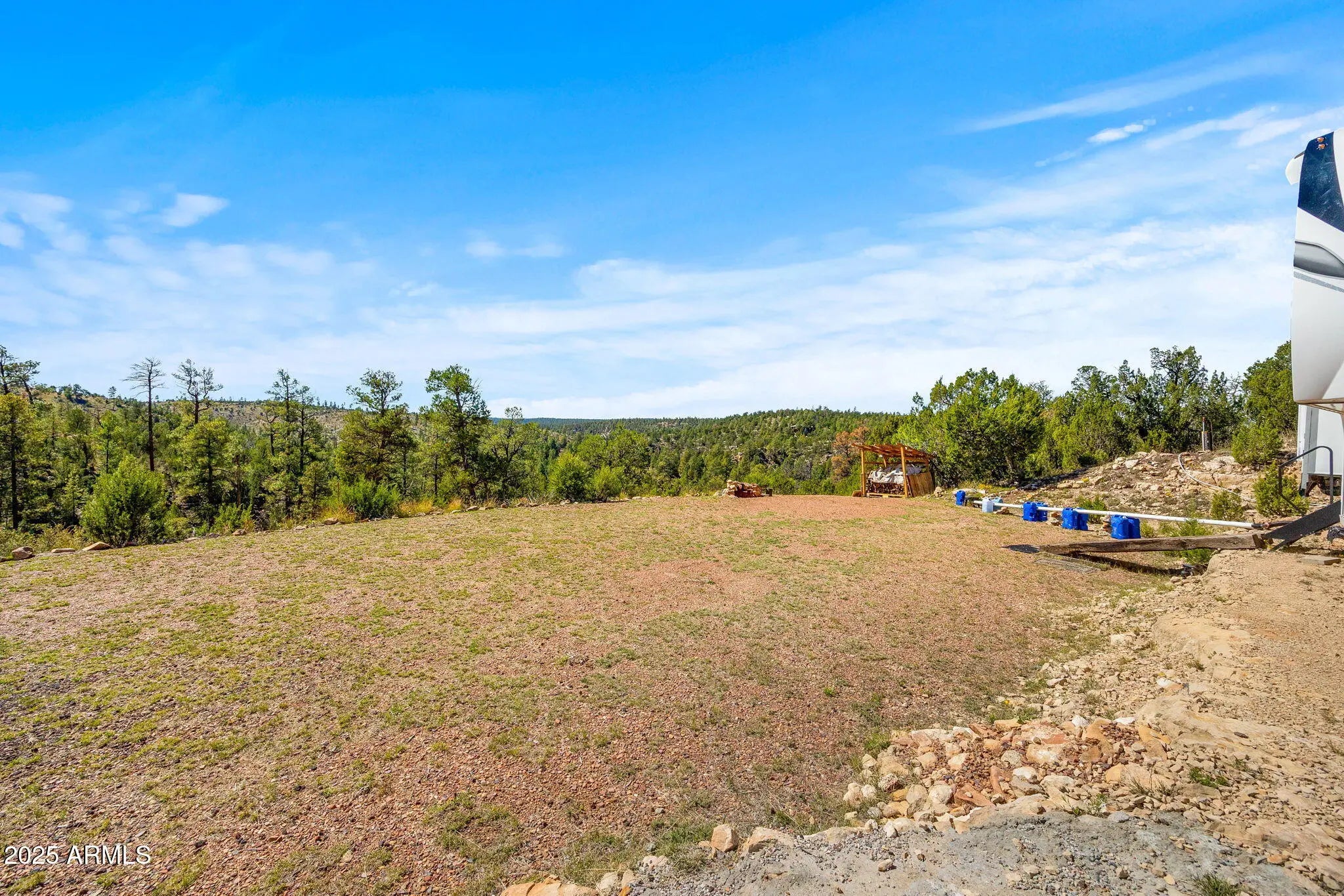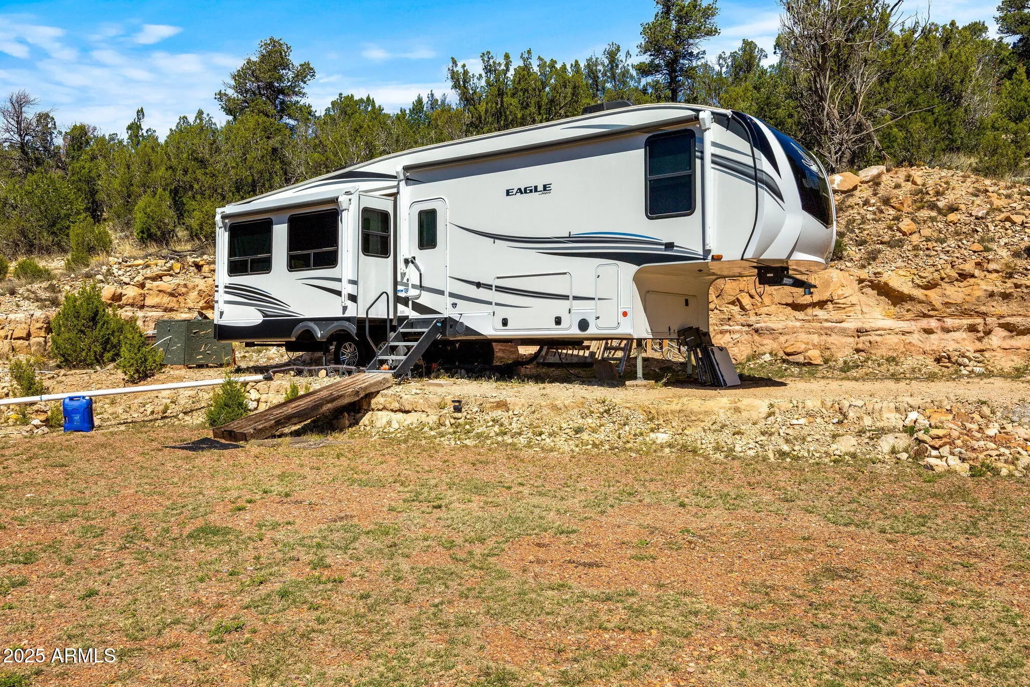Unbelievable opportunity to own acreage in the White Mountains which has all the amenities to start living your best mountain life now! This 5 acre parcel features breath-taking views, 2022 Jayco Eagle 5th wheel, 600 gallons of water with tanks and pump, power installed, ready-to-build flat pad, storage shed, and septic tank installed. Allows for Manufactured homes, horses and plenty of room for all the toys. No HOA. So many possibilities so come take a look today!