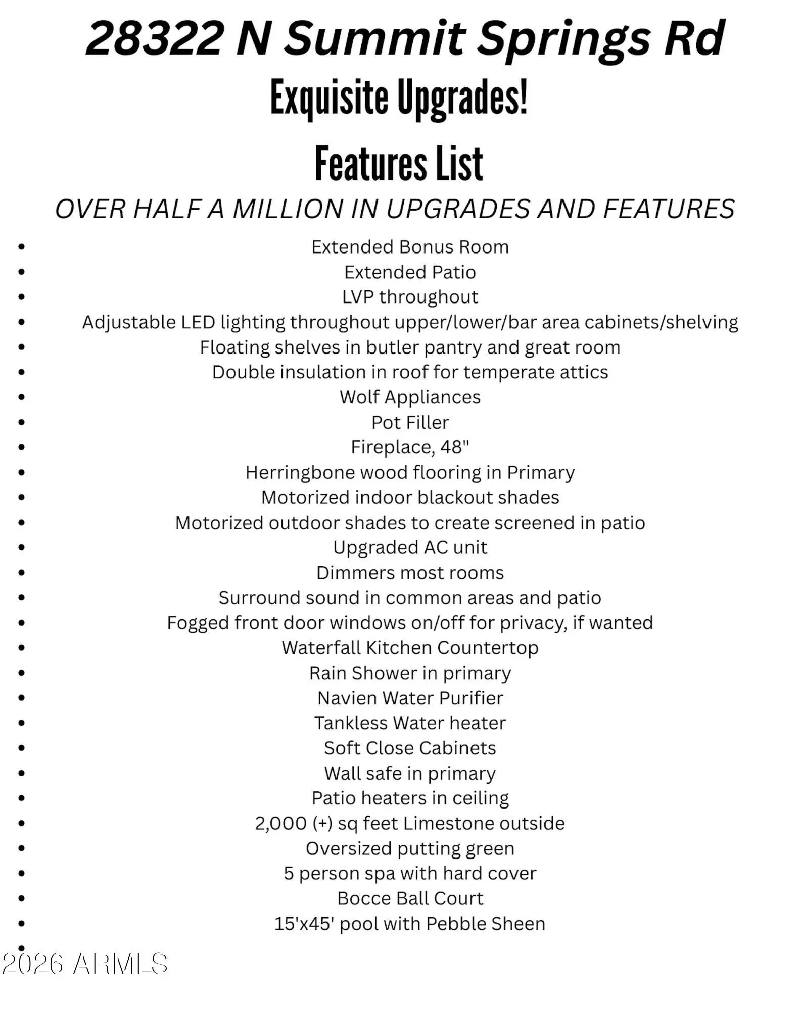 OVER 500K in UPGRADES! SELLER WILL CARRY *ask for info Nestled in the exclusive Verde River Golf & Social Club, this meticulously upgraded residence offers an elevated lifestyle both inside and out. Every detail has been thoughtfully curated--from refined finishes and high-end appliances to seamless indoor-outdoor living spaces designed for entertaining, relaxation, and privacy. Whether you're enjoying quiet mornings with mountain views, hosting under the stars, or taking full advantage of the world-class amenities just steps away, this home offers the perfect balance of elegance and ease. With city water, three on-site community restaurants, and a convenient marketplace, every comfort is within reach. Combined with resort-style living at your doorstep. Property Highlights Spacious Upgrades: Extended bonus room and extended patio for flexible living and entertaining. Designer Finishes: LVP throughout, herringbone wood flooring in the primary, waterfall kitchen island, soft-close cabinetry, and floating shelves in both the butler's pantry and great room. Luxury Kitchen: Wolf appliances, pot filler, Navien water purifier, tankless water heater, and abundant storage. Modern Comforts: Adjustable LED lighting, dimmers in most rooms, surround sound in common areas and patio, and motorized indoor blackout shades plus motorized outdoor shades for a screened-in patio feel. Energy Efficiency & Privacy: Double-insulated roof for temperate attics, upgraded AC unit, fogged front door windows (on/off privacy), and wall safe in the primary. Spa-Inspired Primary Suite: Rain shower and custom finishes designed for ultimate relaxation. Outdoor Living & Entertainment: 2,000+ sq. ft. of limestone hardscaping 15'x45' Pebble Sheen pool with ceiling-mounted patio heaters Oversized putting green, bocce ball court, and 5-person spa with hard cover Trilogy at Verde River Community Amenities Living here means more than just the home it's a full resort lifestyle: Championship Golf Course designed by Tom Lehman Resort-Style Clubhouse with fine dining, café, and event spaces Alvea Spa & Wellness Center offering massage, skincare, and holistic therapies State-of-the-Art Fitness Center with classes, training, and equipment Pickleball, Tennis, and Bocce Ball Courts Resort Pool & Lap Pool with cabanas and lounging areas Trail System & Outdoor Adventures with access to Tonto National Forest Social Clubs, Arts & Crafts Studios, and Community Events that connect neighbors and nurture passions This home is a rare blend of custom luxury, smart functionality, and the unparalleled amenities of Trilogy at Verde River a true desert resort retreat.