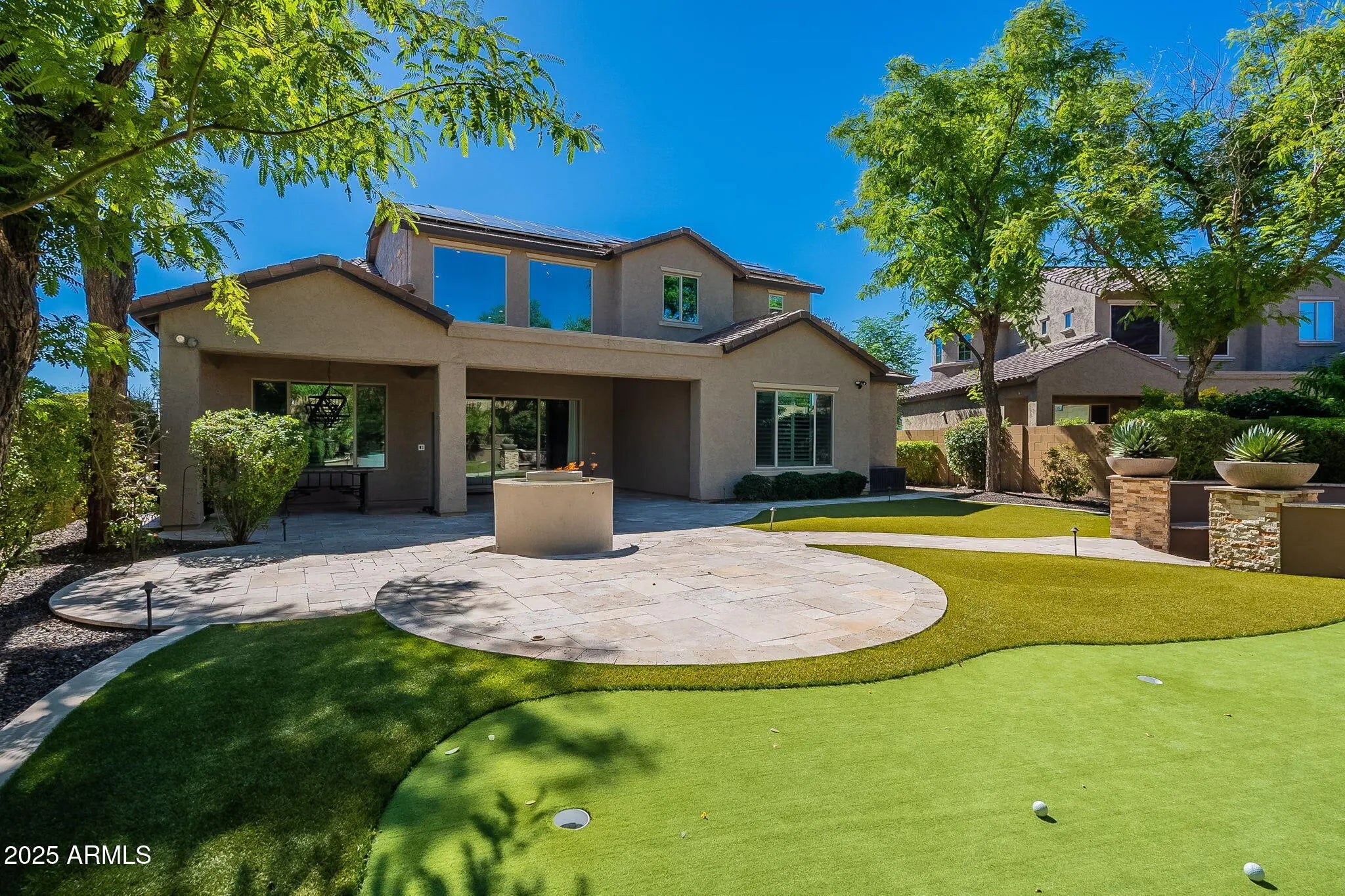 Resort living in the Fireside at Norterra! Voted #1 master planned community by Ranking Arizona. This spacious home has a gorgeous entryway and sweeping staircase. The main level of this Quinlann floorplan by Pulte features an open floor plan with 22ft ceilings, complete with vinyl plank flooring and primary suite! The gourmet kitchen is designed to be the heart of the home, which opens into the great room and dining area. The kitchen is complete with a butlers pantry & serving area, walk-in pantry, executive granite island for casual dining or entertaining a crowd. Off the front tranquil courtyard, you have your own detached private movie theatre/golf simulation room that could serve as a casita. The backyard is truly an oasis with an immaculate design that is complimented well with a water feature & gas fire features. It makes it easy to entertain with the added BBQ area, firepit, and putting green! Well appointed 4300 sq ft home has 5 large beds, dedicated office/den, huge loft, sitting room, library area and golf simulation/theater room with terraced floor. Upgrades include elegant Iron door to private courtyard, solar, cozy fireplace, 8 ft interior doors, soft water sys, RO, 3 car garage, epoxy garage floor, EV charging stations, overhead storage racks, RV gate, beautiful pavers at walks and courtyard, built in sound. This is a show stopper home you should not miss! Fireside at Norterra is one of the most desired communities in AZ, right by TSMC, shopping/dining. The HOA amenities are world class, including a fitness facility, heated lap pool, kids play pool with play equipment, hiking trails, tennis & basketball courts, full time event director for year round activities etc.
