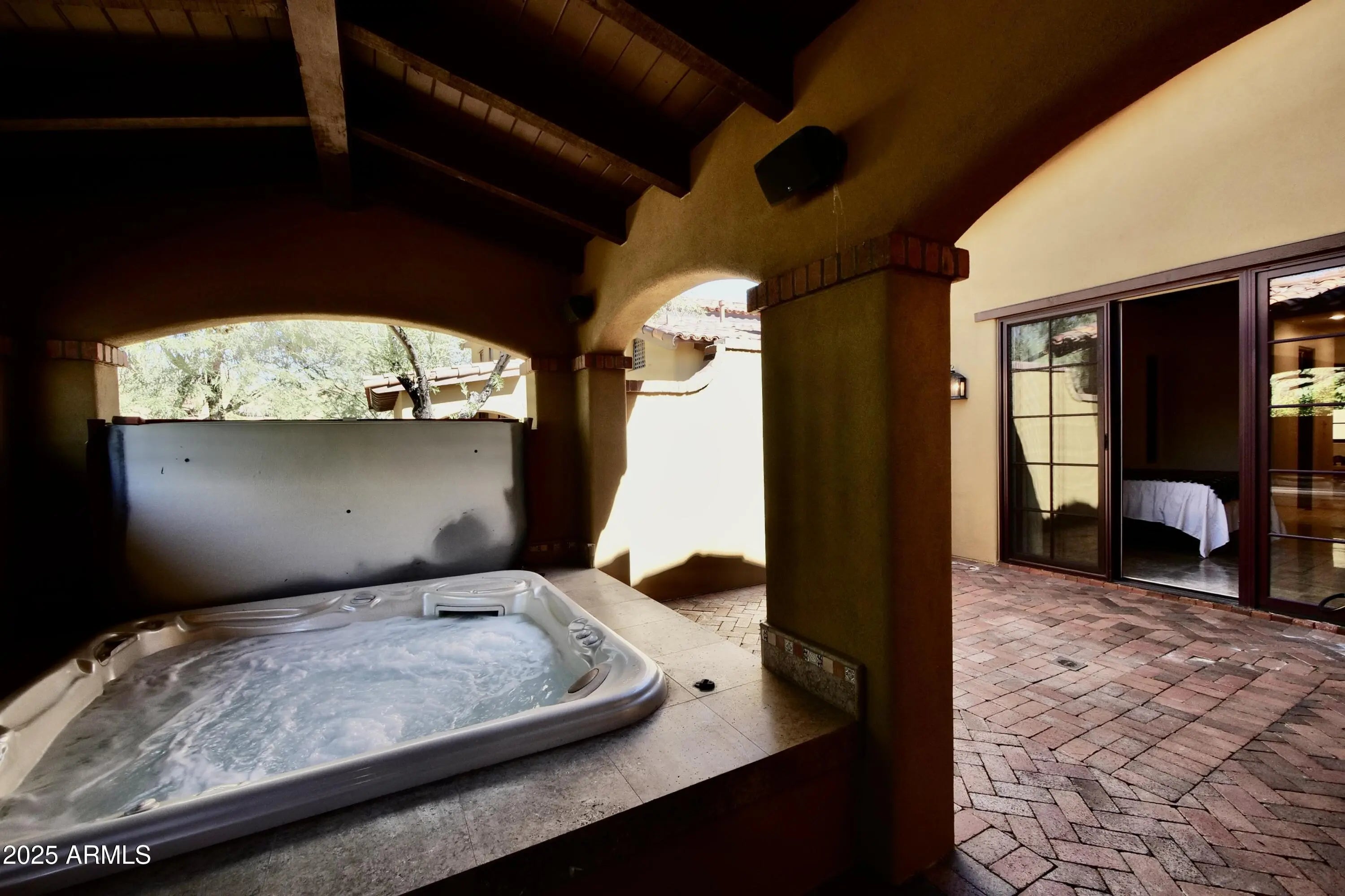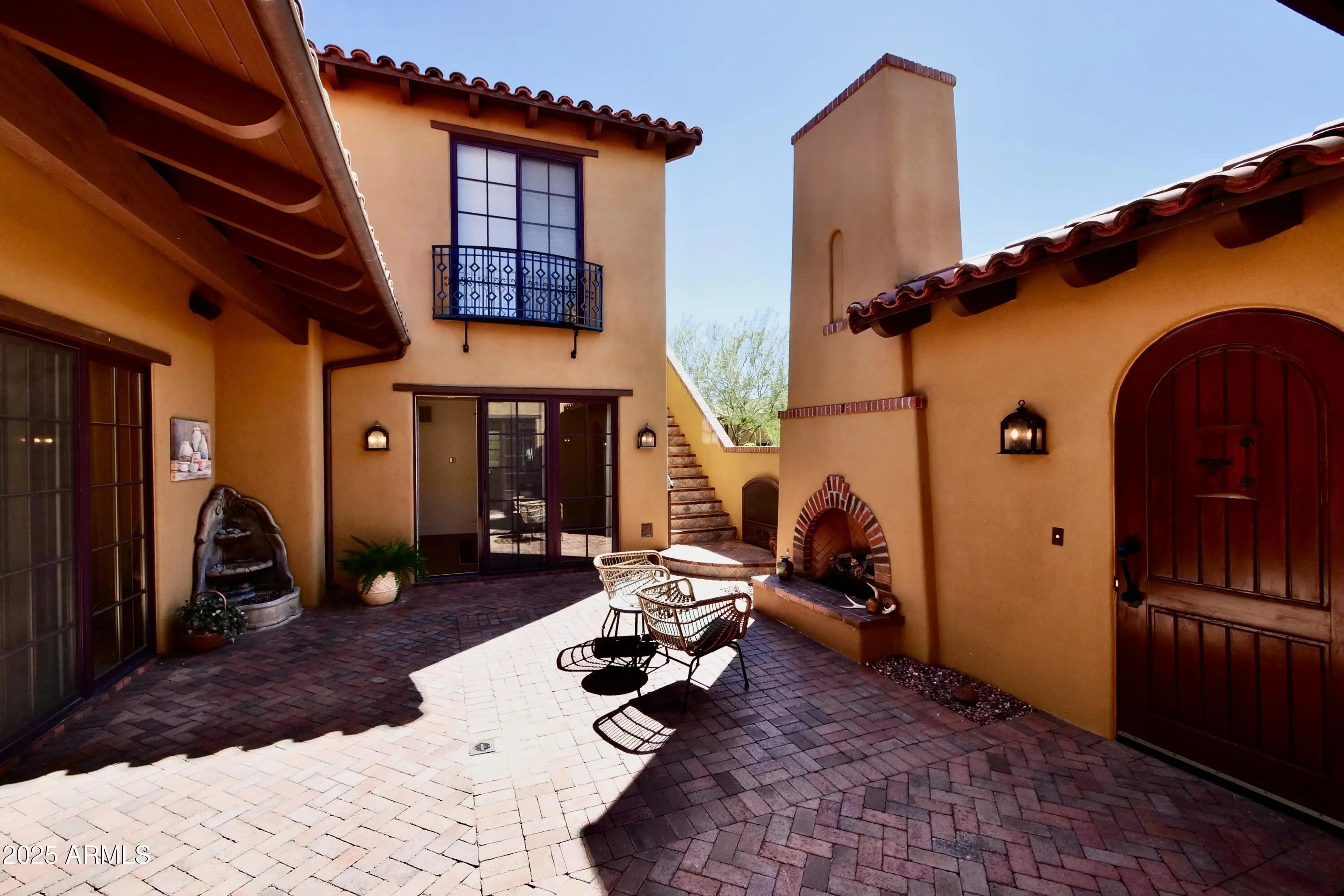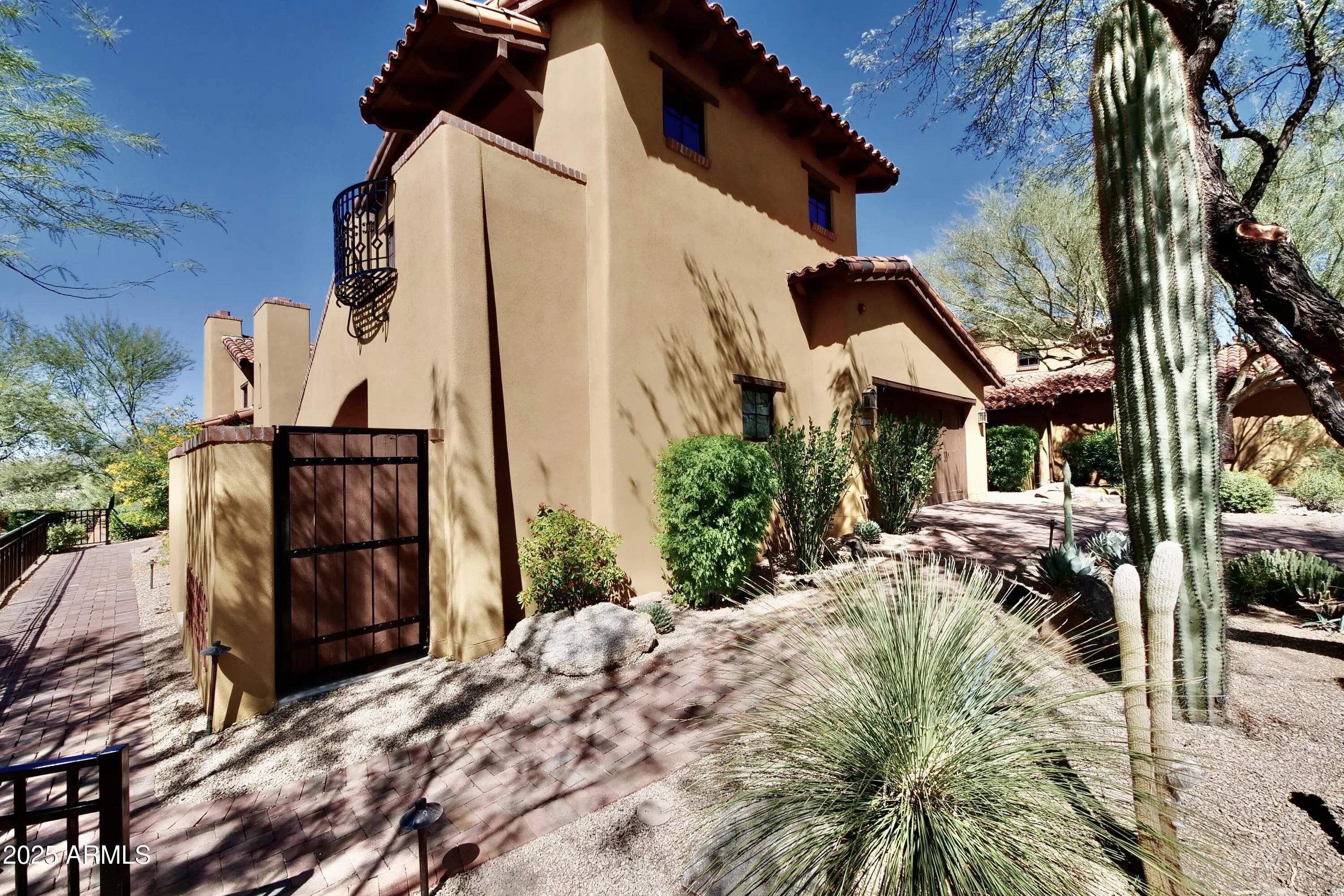 Hacienda-style home located in Desert Mountain's Hacienda Village. A gated arched entry leads to a private courtyard with fireplace and water feature. The main home offers a light and open floor plan with tall exposed beam ceilings, 2 bedrooms, and 2.5 baths. A separate-entry casita with kitchenette provides an additional bedroom and full bath, ideal for guests or extended stays. The rear courtyard is designed for outdoor living with a hot tub, built-in cooking area, and space for entertaining. Residents of Hacienda Village enjoy a community pool, spa, and fitness center. Desert Mountain offers 7 Jack Nicklaus Signature golf courses, multiple clubhouses, dining, tennis, pickleball, fitness facilities, and more than 20 miles of private hiking trails. Membership available by application.