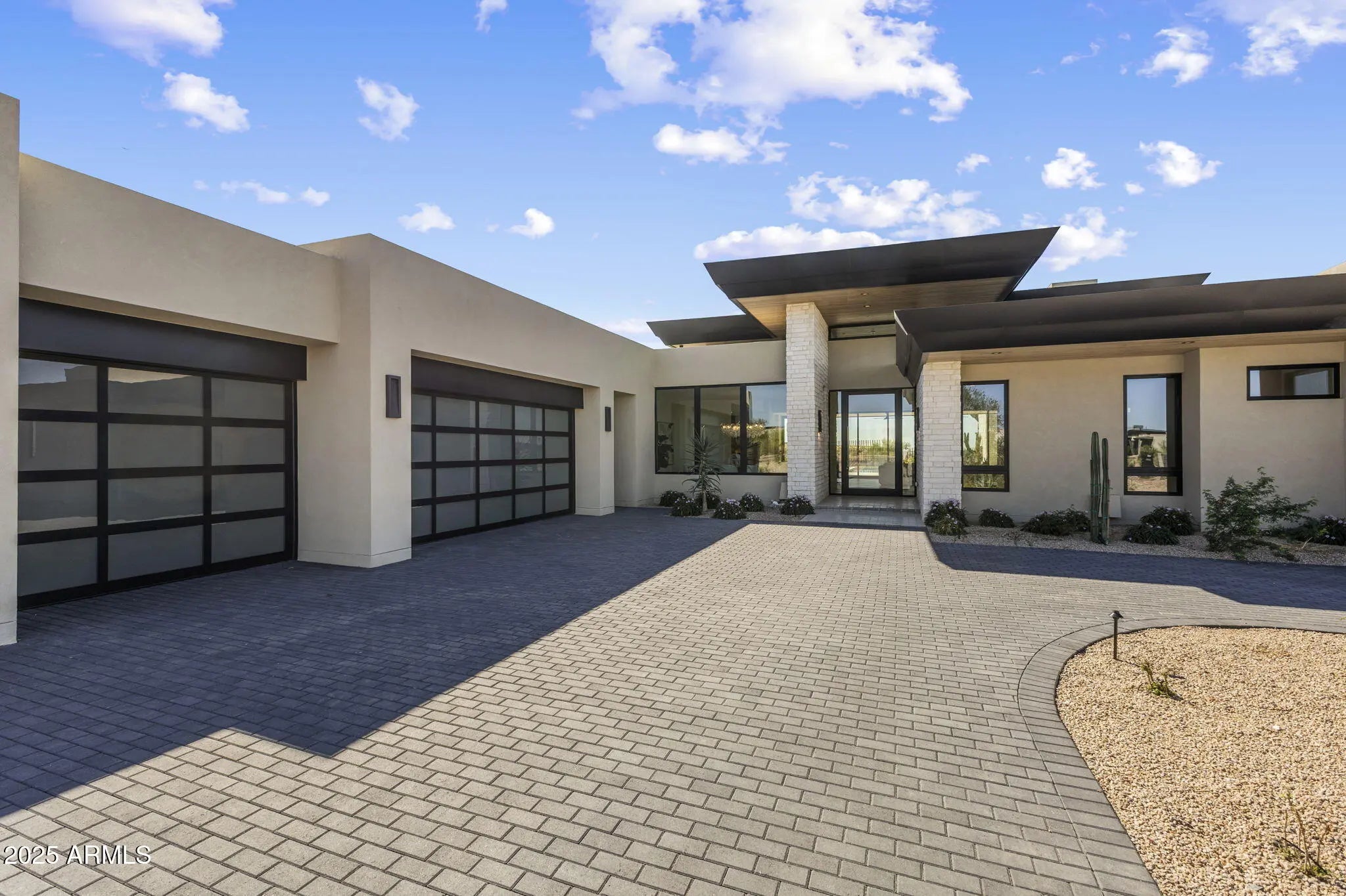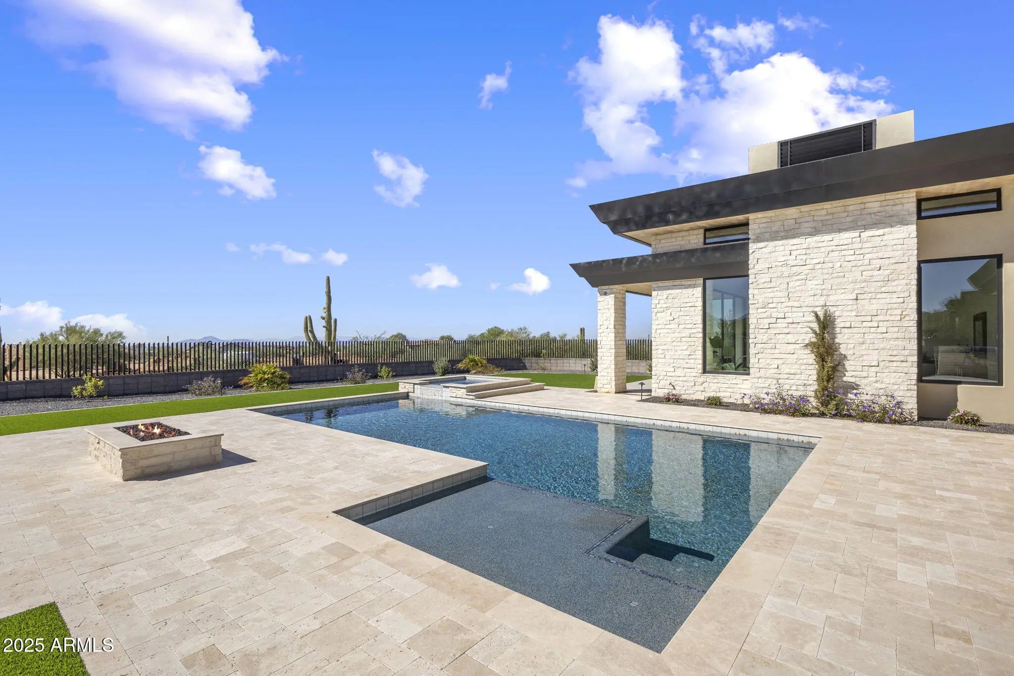 Move-in ready and meticulously designed, this 2024 New Build-NEVER LIVED IN-Solitude retreat is the embodiment of elevated desert luxury where modern architecture, new-build convenience, & endless views unite. Designed by Swaback Architects & crafted by Sonora West Development, this 5010 sqft single level home is nestled on a premium lot, capturing sweeping mountain vistas by day & sparkling city lights by night. The striking modern stone façade opens to an airy, open-concept interior with 16-foot ceilings, wide-plank European oak floors, linear fireplace with stacked stone surround, & walls of retractable glass that dissolve the boundary between inside & out. Every room has been designed to frame the desert's beauty, ensuring breathtaking views at every turn. The chef's kitchen is a showcase of refinementcustom flat-panel cabinetry, Wolf, SubZero, & Asko appliances, plus a waterfall-edge quartz islandseamlessly flowing into dining & living spaces, perfect for entertaining. The primary suite is a serene retreat, with a private fireplace, retractable slider, & spa-like bath featuring a marble-clad shower, freestanding soaking tub, & dual vanities. Outdoor living defines this residence: a heated pool & spa, elegant Turkish travertine patios, firepit, barbeque island, & wood-detailed covered patiosall perched to maximize the extraordinary panorama. Experience North Scottdale living at it's finest in this extraordinary residence.