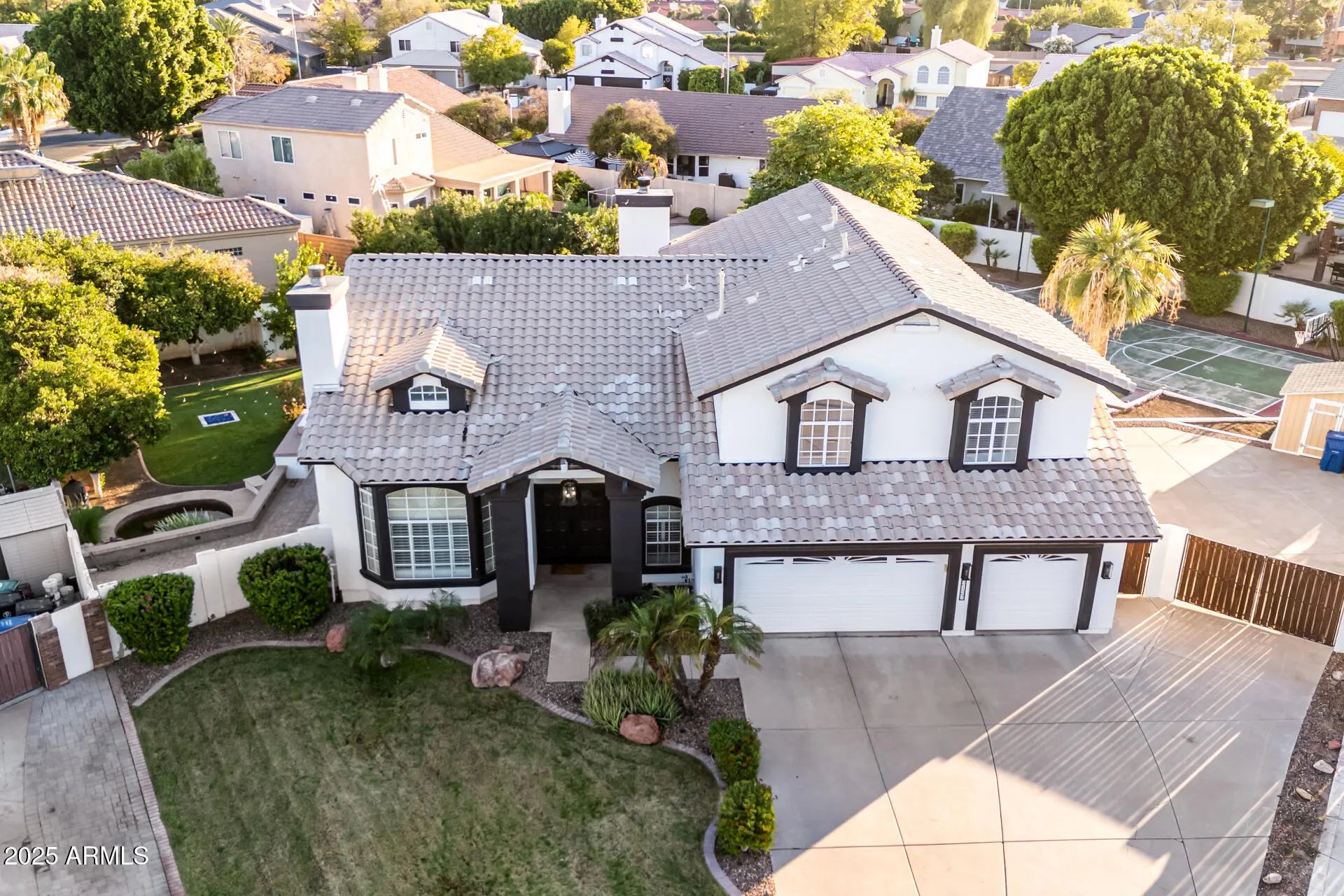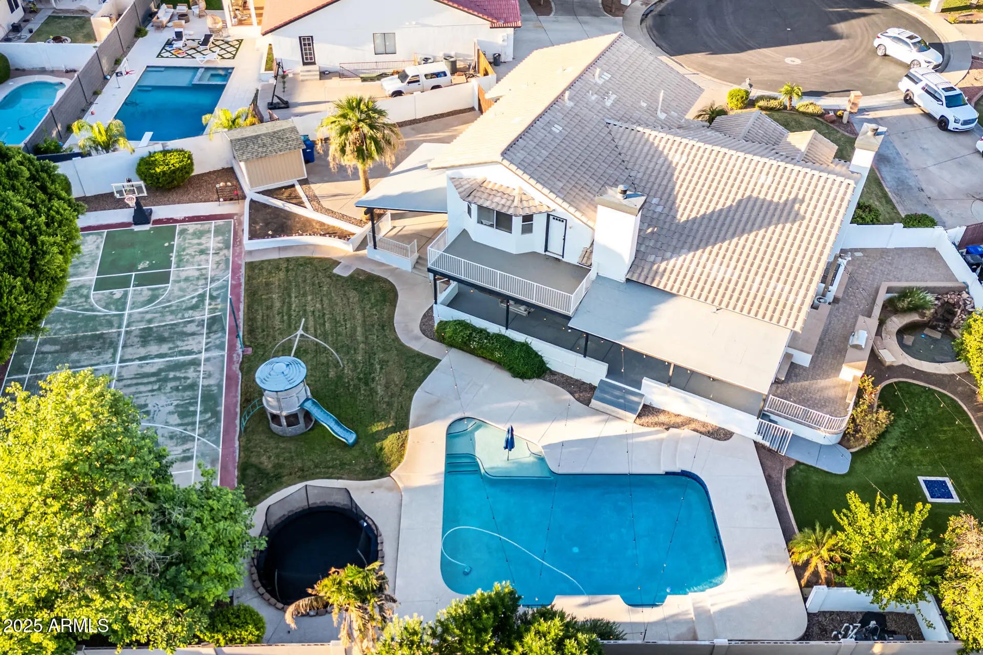 Located in one of the most coveted neighborhoods in Mesa, this ½ acre cul de sac property is sure to impress! Over 70% of the lot size is backyard offering an oversized 2021 resurfaced pool with new pumps, filter, heater, & water filler, brand new trampoline, playset, sport court with lights, built in gas BBQ & fire pit, 2025 resurfaced waterfall pond, mature fruit & shade trees, large storage shed, oversized RV parking, & huge covered patios. Under your 2023 new roof, you'll find a new 2024 HVAC unit, a whole house fan ventilation system, 2022 tankless water heater, Tesla charger in garage, a 1400 sqft fully finished basement w/ access to backyard, a room with over-engineered flooring for dance floor or heavy gym equipment, an upstairs game or play room, plenty of storage, 2 fireplaces 6 bedrooms, & 4 bathrooms. A home that needs to be seen to be truly appreciated!!