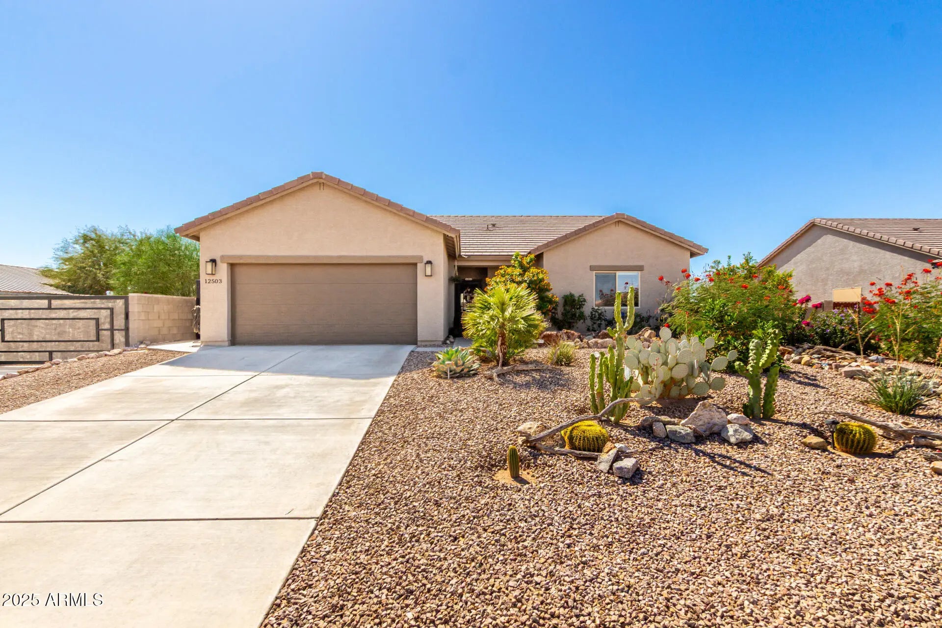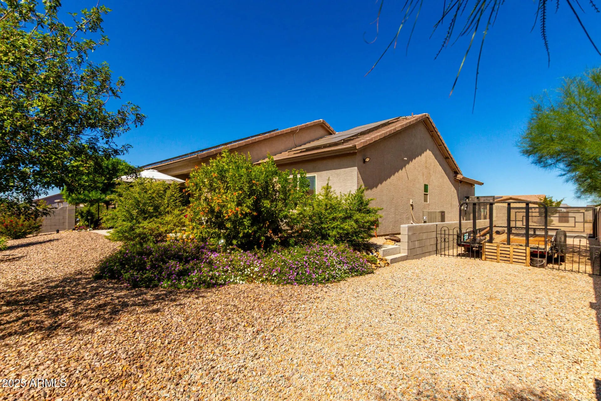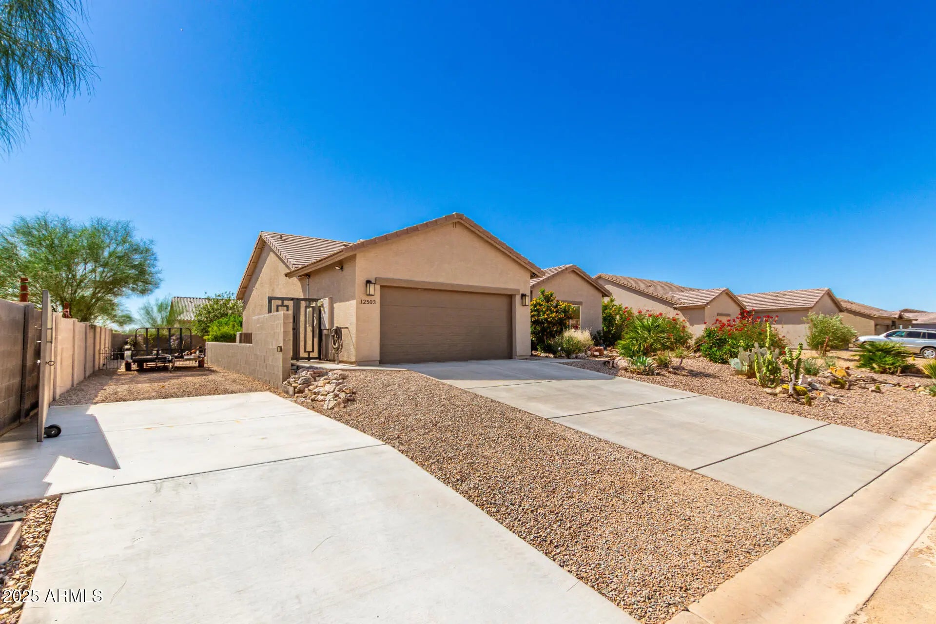 Move-in ready 2021-built home featuring 3 bedrooms and 2 baths with modern elegance throughout. Enjoy custom paint, wooden blinds, ceiling fans in every room, and tile flooring across the entire house. The kitchen shines with stainless steel appliances, slow close cabinets granite countertops. The finished garage offers custom built-in shelving for added storage and organization. Relax on extended front and back patios with a beautiful, custom steel security door. RV-ready with lighting, electricity, a concrete slab, and a custom steel gate. The beautifully landscaped yard includes mature orange and pomegranate trees on a full watering system within a private, walled backyard. One of the nicest homes and yard in the area. Don't miss out on this fantastic home!