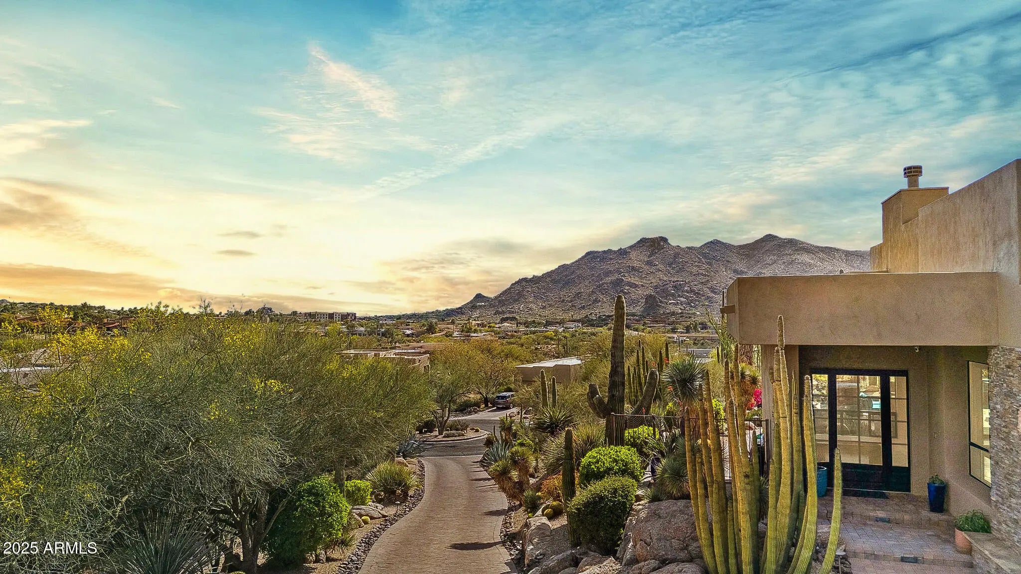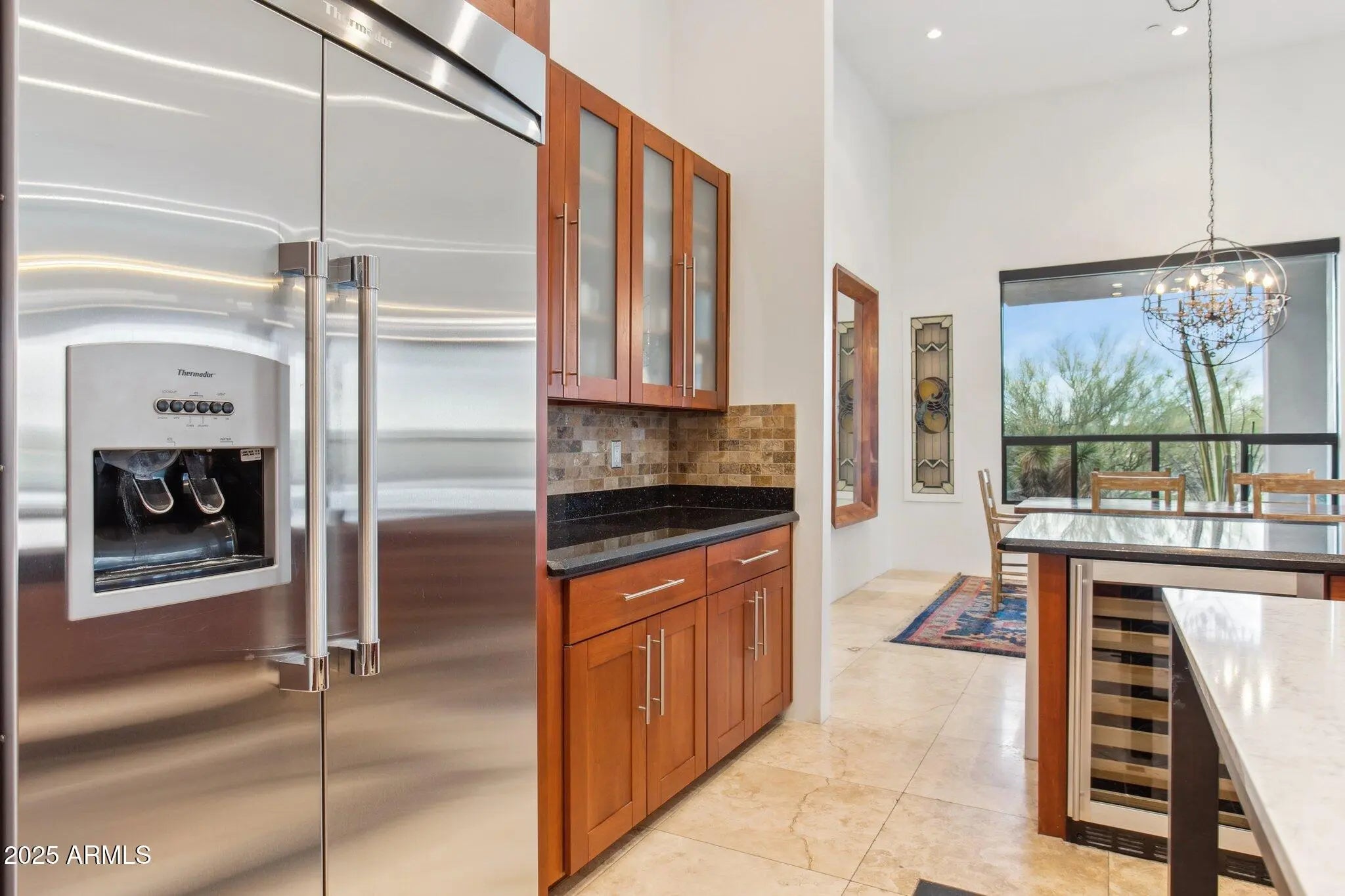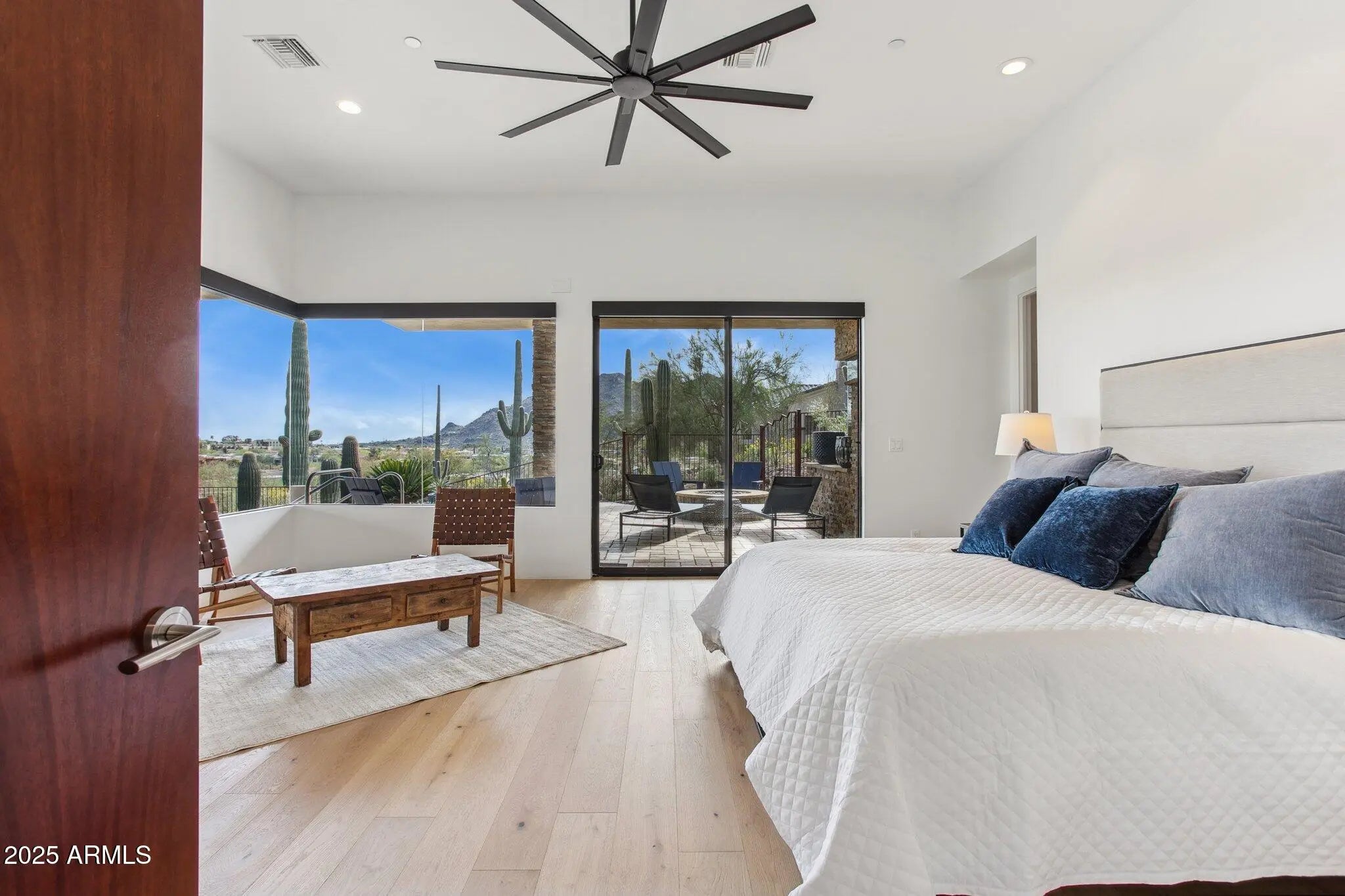 Set against the majestic backdrop of Black Mountain and the sweeping Sonoran Desert, this exceptional Carefree residence offers an unparalleled blend of refined luxury and serene sophistication. Designed as a private retreat, the home captures panoramic desert vistas from every vantage point—an ever-changing canvas of natural beauty. At the heart of the home, the great room stuns with soaring ceilings nearing 15 feet and expansive walls of glass that blur the line between indoors and out. Ideal for effortless entertaining, this open-concept space flows seamlessly into a chef's kitchen appointed with premium Thermador stainless steel appliances and sleek granite countertops—where culinary artistry meets everyday ease. The primary suite is a sanctuary unto itself, framed by breath taking desert views and enhanced by a spa-inspired en suite bath featuring a generous walk-in shower, a deep soaking tub beneath a chandelier, and a spacious, thoughtfully designed closet. Step outside to your private patio, complete with a cozy fire pit, and revel in the quiet of the high desert. Two additional bedrooms with two baths are nestled in their own wing, perfect for guests or family while expansive guest quarters above the garage offers its own patio and sweeping views, creating an inviting haven for visitors. A sparkling pool and spa lie just beyond the great room, offering a tranquil escape amid beautifully designed outdoor living spaces, ideal for dining or entertaining under the stars. The retractable glass wall opens wide, creating a seamless connection to the natural world and embodying the essence of Arizona indoor-outdoor living. Every detail of this extraordinary home has been curated with grace and intention. This is Carefree living at its finest, where elegance meets ease, and nature takes center stage.
