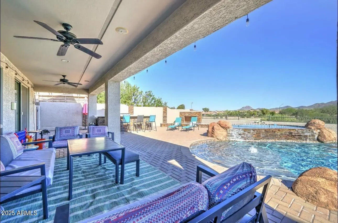 Welcome to your Anthem sanctuary—where thoughtful design, modern comfort, and Arizona beauty meet. Nestled in one of Anthem's most sought-after neighborhoods, this impeccably maintained residence showcases a truly one-of-a-kind stowaway space just off the kitchen. Behind a custom barn door awaits a versatile area—ideal for extra storage, a hidden workspace, a culinary nook, or a creative retreat. Updated brand new vanity countertops are featured throughout the entire home, including all restrooms, office area, and hallway area, complemented by all new bathroom mirrors in every restroom. Brand new kitchen faucet. Elegant plantation shutters adorn every room, adding timeless style and energy efficiency throughout. A grand, oversized front courtyard with a fireplace creates a warm welcome and an inviting spot for evening gatherings. Step into your private backyard oasis, where resort-style living awaits. Enjoy a heated pool and spa complete with a built-in bar top, grotto, and a fully functional water slide. Entertain with ease at the full outdoor kitchen featuring a built-in BBQ, sink, and kegerator, all perfectly complemented by an additional outdoor fireplace for cozy nights under the stars. Enjoy the ultimate privacy with protected land behind the home, no rear neighbors, just sweeping mountain views and tranquil Arizona sunsets. A temperature-controlled garage provides the perfect environment for vehicle care or a versatile workspace in any season, completing this exceptional home where every detail exudes both comfort and luxury. All appliances are included, featuring a GE Profile double convection oven, microwave, and brand new dishwasher, making this residence truly move-in ready. Every detail of this exceptional Anthem home has been thoughtfully curated and meticulously cared for, offering a seamless blend of luxury, functionality, and desert serenity. -Truly, an elevated lifestyle.