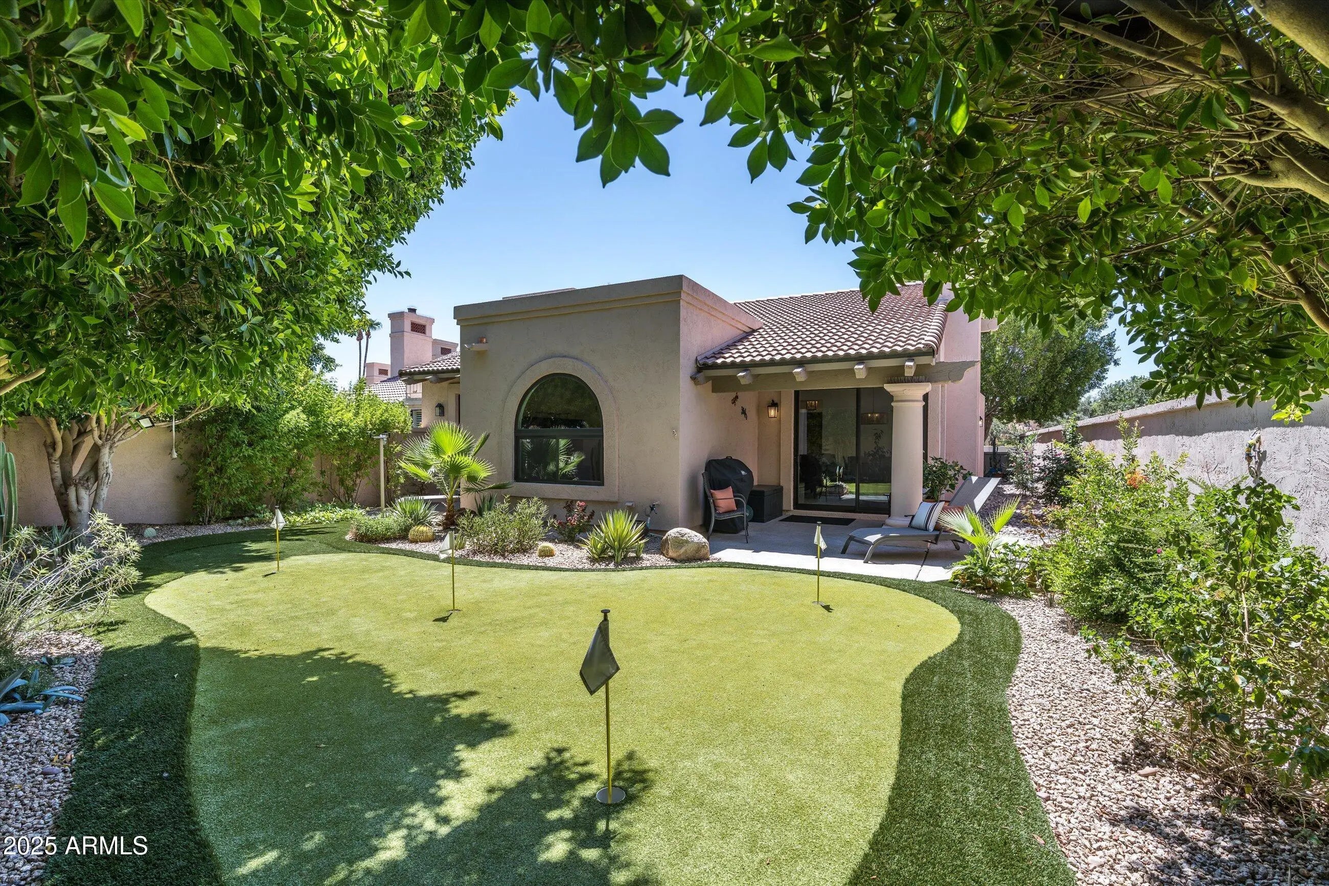 Welcome to the Jewel of Guard-Gated Las Brisas. Completely reimagined and reconstructed with exceptional craftsmanship, this residence embodies timeless design and modern comfort in one of Scottsdale Ranch's most sought-after enclaves. A thoughtful redesign now offers three bedrooms and a seamless open-concept layout, setting a new standard for luxury within Las Brisas. Beyond the canopy-covered courtyard, a light-filled foyer with soaring vaulted ceilings introduces the home's inviting elegance. To your left, the chef's kitchen impresses with natural stone accents, warm custom cabinetry, and top-tier finishes, creating the perfect place to cook, gather, and entertain. A charming breakfast nook overlooks the serene front courtyard, while the expansive great room serves as the heart of the home. Anchored by a natural wood-burning fireplace wrapped in dramatic stone, this space unites the living, dining, and wet bar areas in a cohesive and beautifully balanced design. The primary suite is privately set at the rear of the home, offering peaceful views of the lush backyard and professional-level golf putting and practice area by Southwest Greens. The newly reconfigured bath is a true sanctuary with soaring ceilings, designer finishes, a freestanding soaking tub, spacious walk-in shower, dual vanities, private water closet, and a custom walk-in closet. Two additional guest bedrooms are generous in size and complemented by a beautifully finished hall bath that mirrors the home's refined aesthetic. Nearly every room enjoys views of the private outdoor oasis framed by mature ficus trees and centered around a pristine putting green, perfect for quiet mornings or evening entertaining. Mechanically, the home lives like new construction with a redesigned floorplan, new roof, windows, appliances, fixtures, and HVAC. Within the guard-gated community of Las Brisas, residents enjoy 24-hour security, resort-style pools, and tennis courts, all moments from dining, shopping, and recreation. Experience the Jewel of Las Brisas, where quality, design, and effortless living come together in perfect harmony.