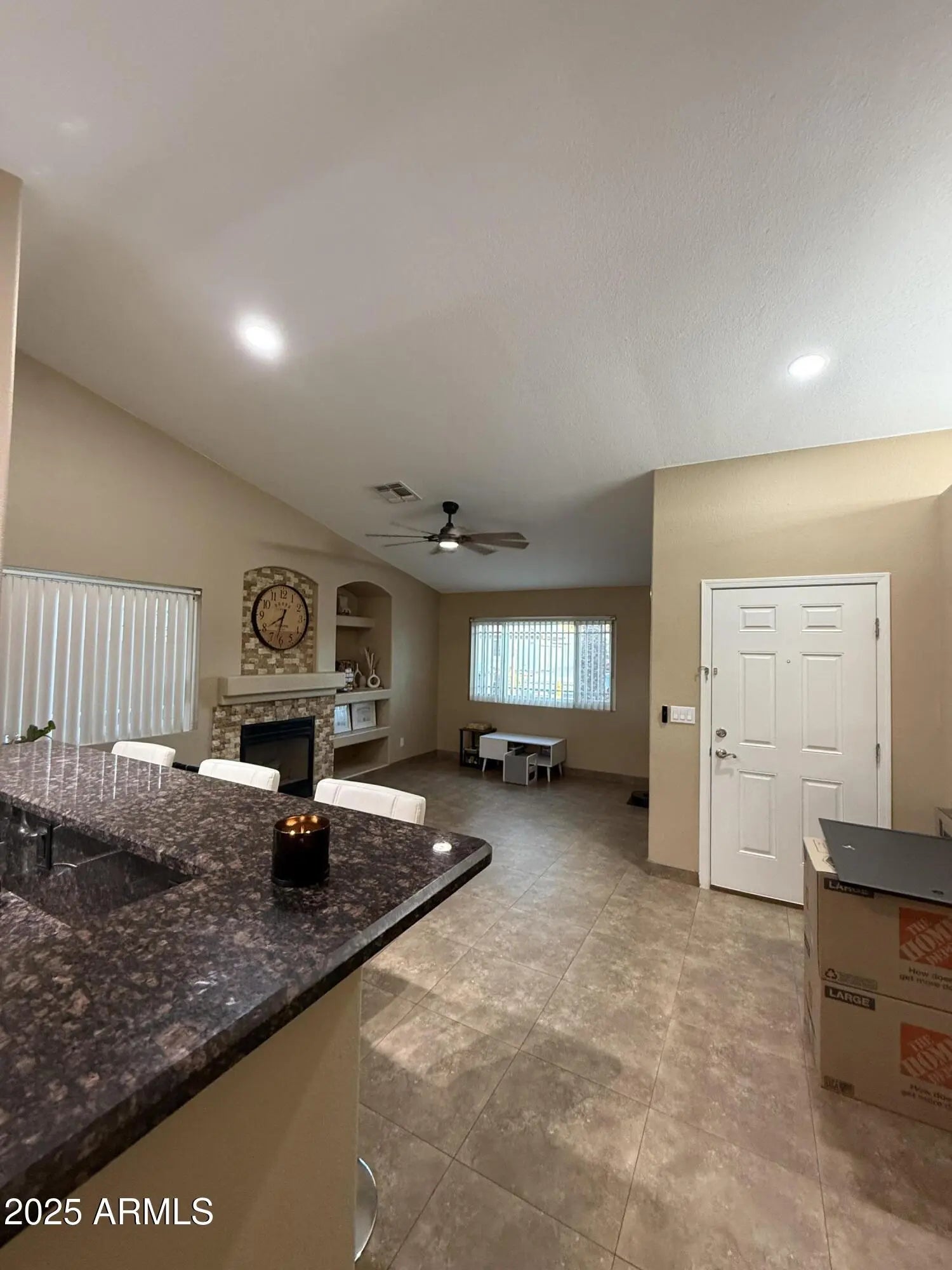 Charming 3 bed, 2 bath home featuring vaulted ceilings, tile floors, and a cozy fireplace. The upgraded kitchen offers granite counters, white cabinets, backsplash, and a breakfast bar. Both baths include granite and travertine showers. Energy-efficient Milgard windows (2017) and Trane AC (2019). Enjoy the spacious backyard with covered patio, extended seating, lush grass, and mature trees—perfect for relaxing or entertaining. Prime location close to shopping, dining, and freeway access!