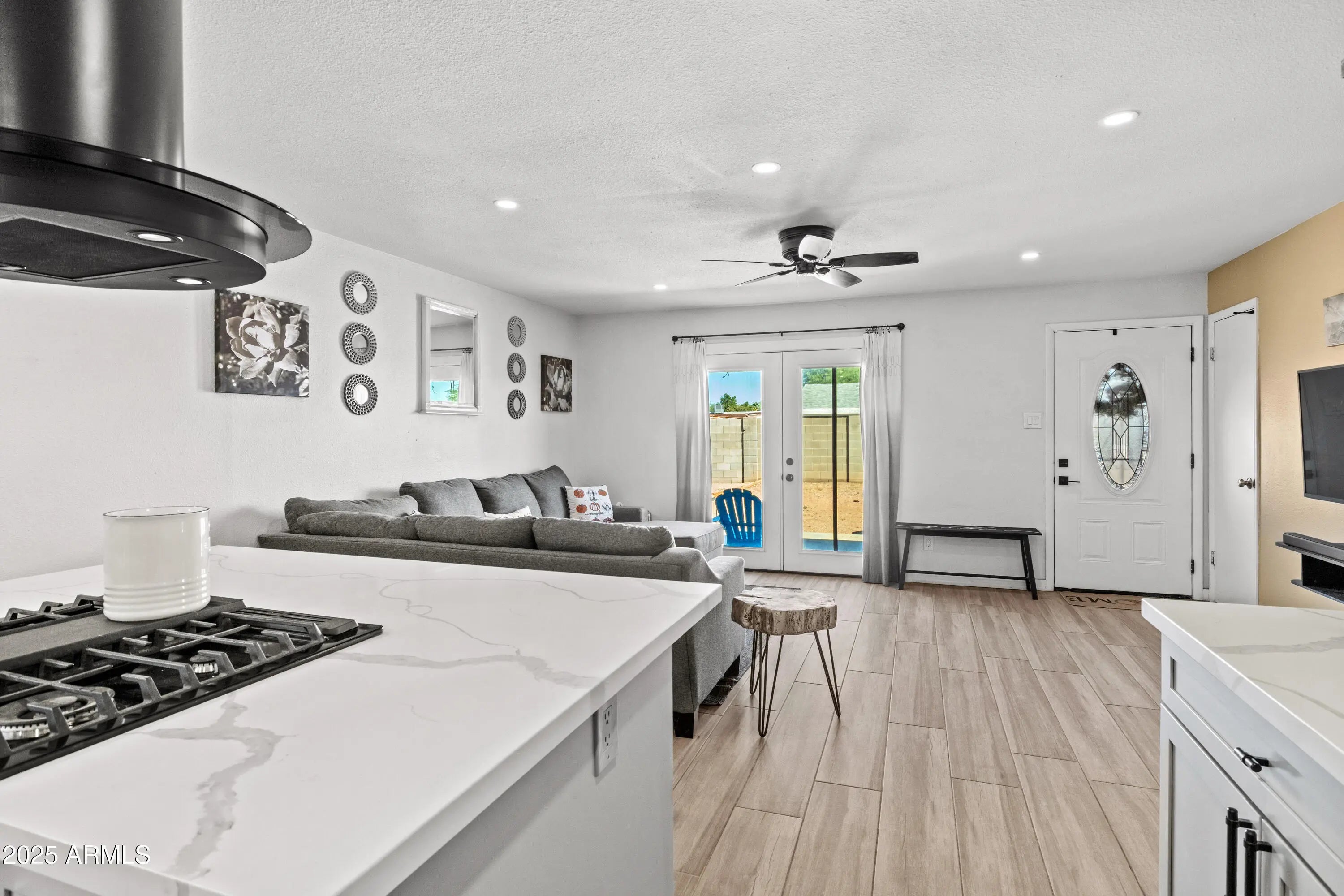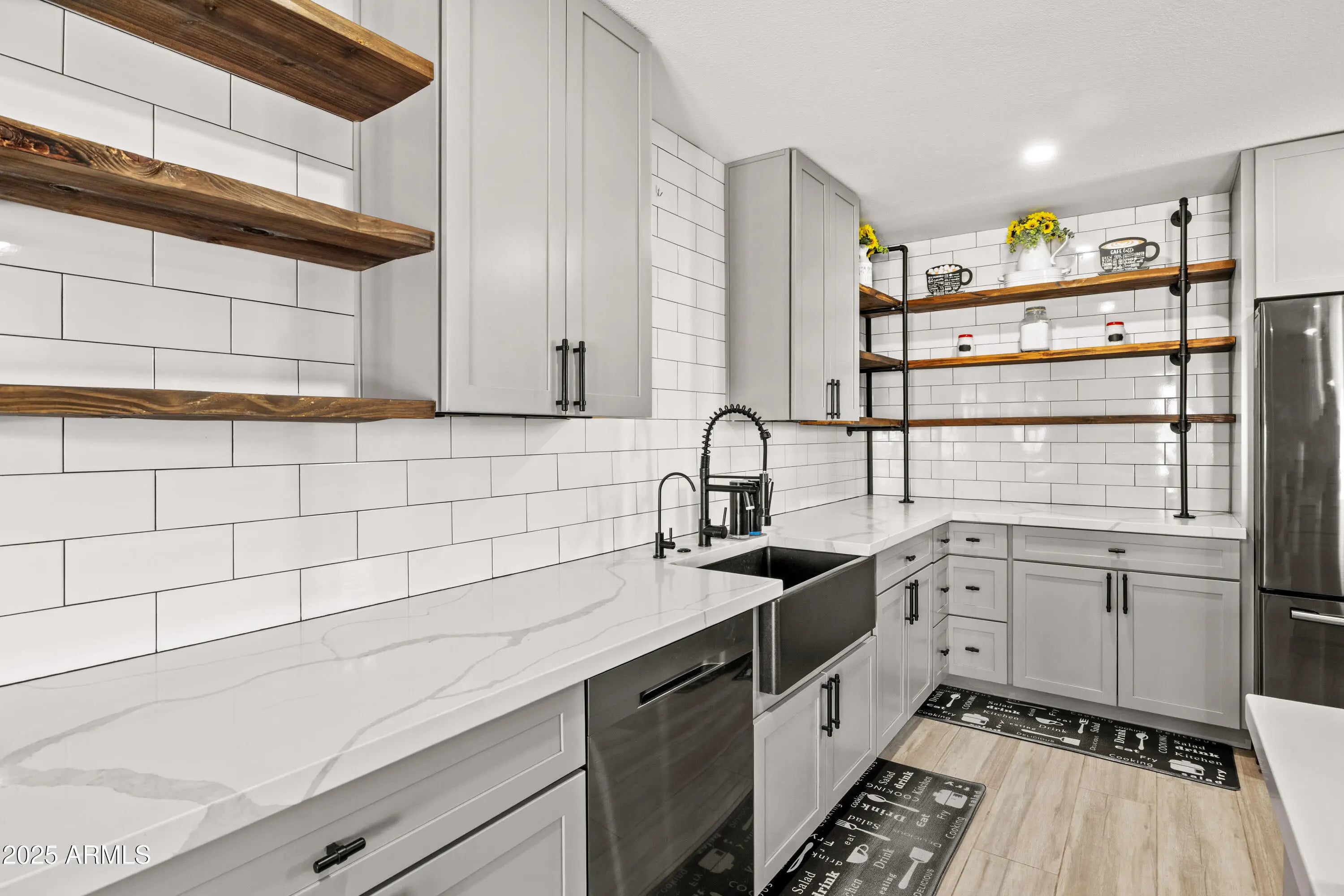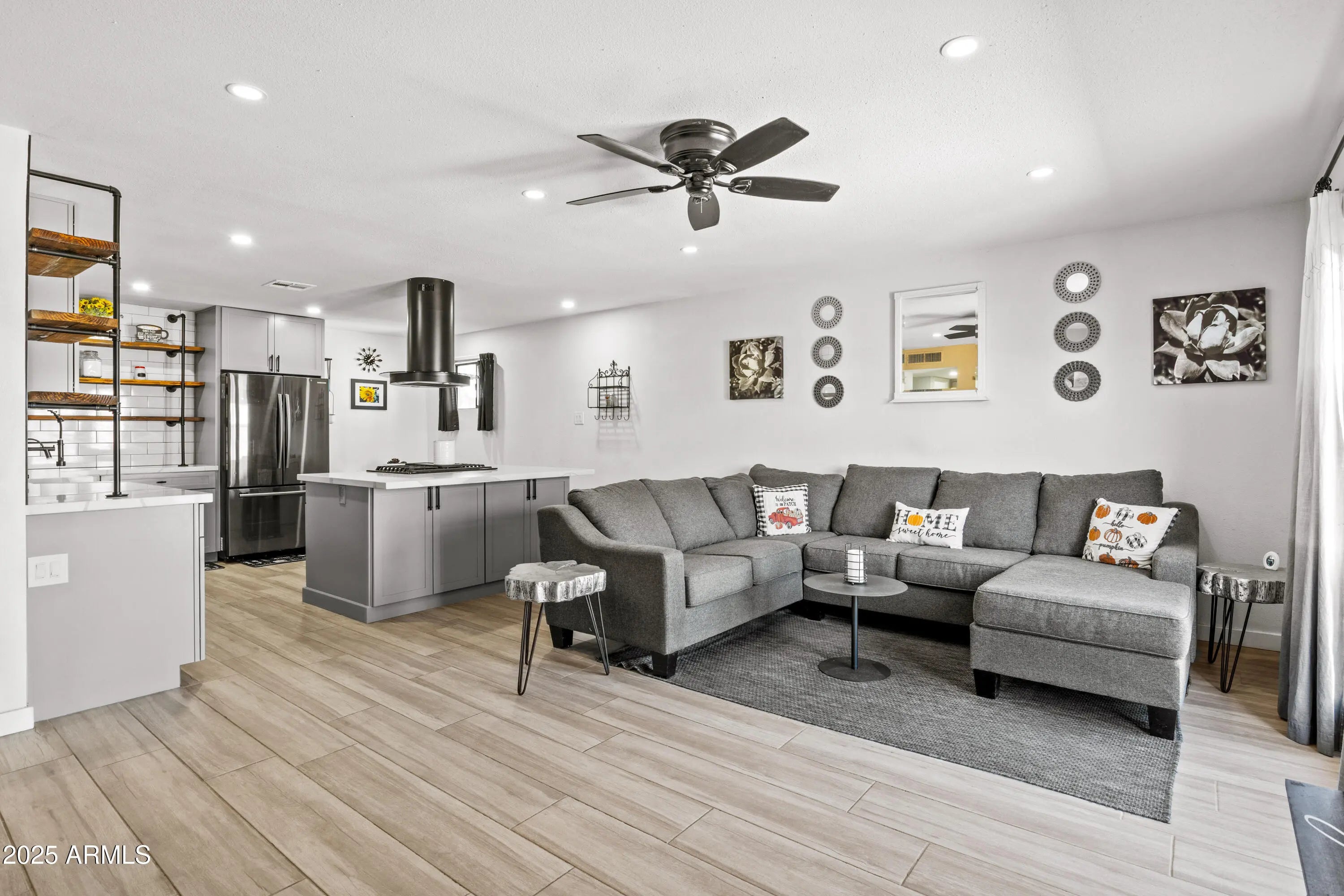 Check out this beautifully updated single-family home on an oversized lot with NO HOA and plenty of room to build or add! OWNED SOLAR!!! Enjoy comfort, efficiency, and savings! Energy efficient upgrades include newer dual-pane windows (2022), R-39 attic insulation, and an owned solar system. This home's APS electric bills average only $250 a YEAR! Step inside to find a modern, open floor plan with wood-look tile flooring, quartz countertops, a custom island, and stainless steel appliances - all included. Stylish open shelving and updated fixtures complete the contemporary feel. Updates continue with an HVAC system replaced (2020), reverse osmosis & soft water systems, and full exterior paint (2023). Fresh water lines re-plumbed overhead (2018). Large storage shed. Plan a tour today! This move-in-ready gem is ideal for a first-time buyer, investor, or anyone looking to downsize. With its energy efficiency, modern updates, and unbeatable location - this home checks every box. Let's talk about location...Home is located down the block from all the exciting new developments taking place at ASU's West Campus. It's just minutes to the I-17 Freeway and the growing number of shopping / dining and retail options at Arrowhead Mall The Arrowhead Entertainment District at P83.