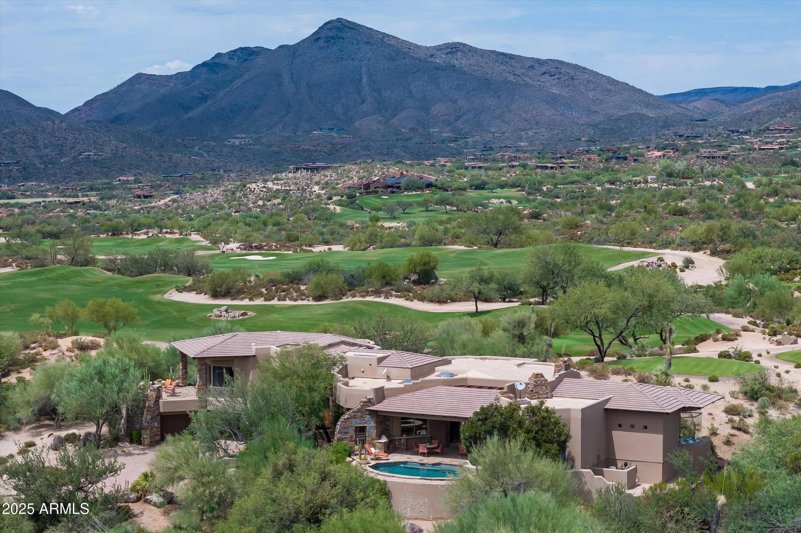 This stunning, timeless residence in Turquoise Ridge is nestled on a private cul-de-sac along a serene greenbelt, offering sweeping views of Cochise golf course, city lights, and both sunrise and sunset. Santa Fe accents add warmth and charm to this beautifully designed home, where style meets comfort at every turn. With GOLF MEMBERSHIP available to the exclusive Desert Mountain Club, you'll enjoy world-class courses and luxury amenities just moments away.Inside, the open-concept layout flows seamlessly from the gourmet kitchen to the spacious Great Room, featuring rustic beams, soaring ceilings, and expansive windows that flood the home with natural light, framing breathtaking desert vistas. The kitchen is a chef's dream, complete with high-end appliances, custom Alder cabinetry, and a convenient serving window to the outside pool patioperfect for entertaining. The office is beautifully designed, ideal for working from home, while the oversized three-car garage provides ample space for vehicles and storage, including a wine cellar. The home boasts three luxurious suites, each with its own private patio for quiet relaxation. The large primary suite has direct access to the pool and spa, offering the ultimate retreat. Multiple patios provide additional areas for guest entertaining, while the sun-soaked backyard, with a sparkling pool and shaded al fresco dining space, invites you to bask in the Arizona sunshine. For those seeking the best views, the upper patio delivers panoramic vistas, showcasing vibrant sunsets and the twinkling cityscape. This is a home where every detail has been thoughtfully crafted for both elegance and functionality, making it the perfect desert escape.