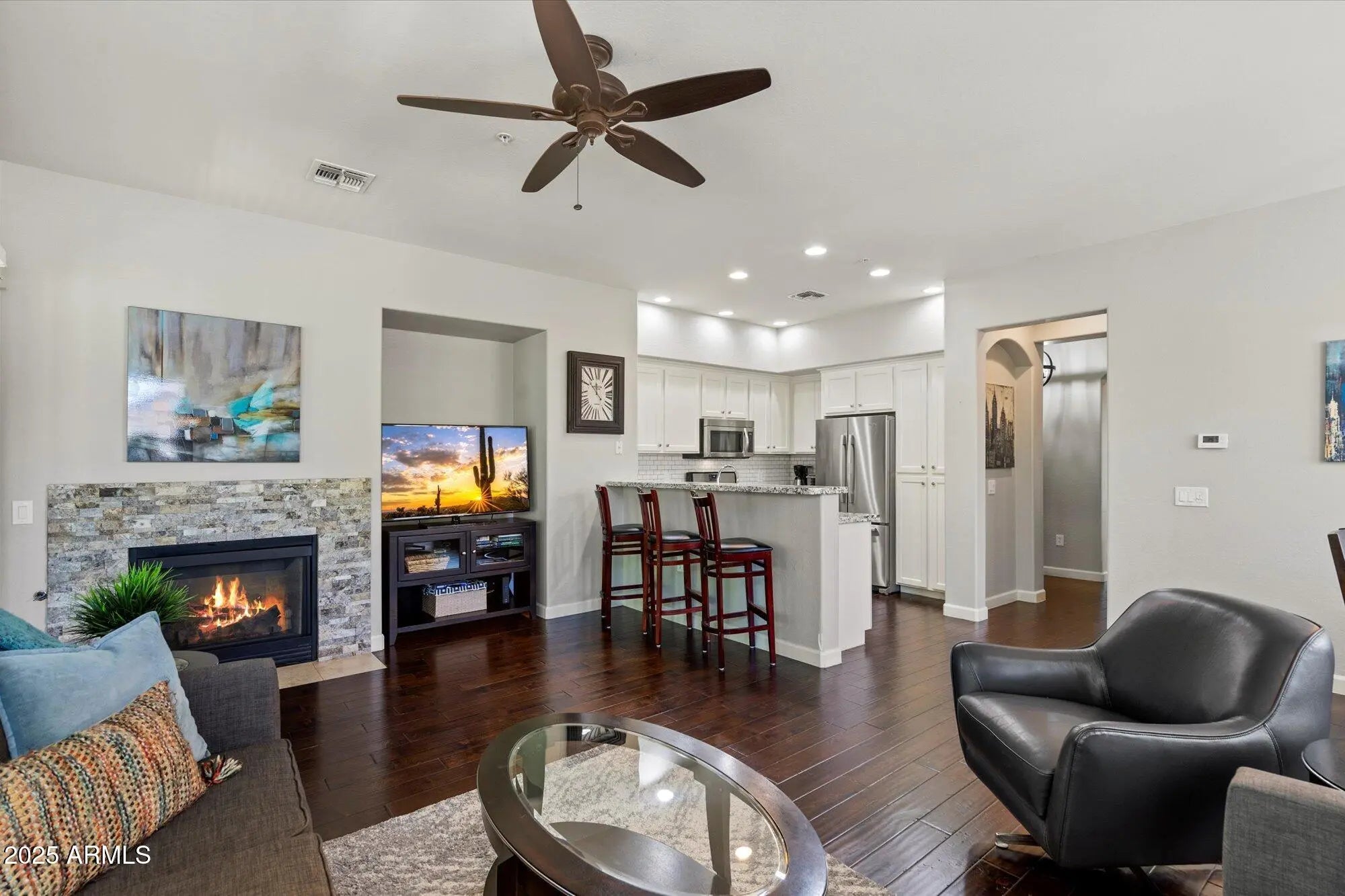 Stylish and bright second-story townhome in Encore at Grayhawk, featuring a popular 2 Bed floor plan with a poolside location. Framed by the dramatic backdrop of the McDowell Mountain Preserve, this residence balances modern design with timeless warmth. The open-concept kitchen includes granite countertops, a tile backsplash, and a breakfast bar that flows into the spacious living room with hardwood floors and a stone-surround fireplace. Enjoy updated baths, two private patios for outdoor relaxation, a two-car garage, and a beautiful stone exterior that complements the surrounding desert landscape. Encore offers a community pool, spa, fitness center, & access to Grayhawk's scenic walking trails. Located near North Scottsdale's top shopping & dining, Grayhawk Golf Clubs, and major freeways