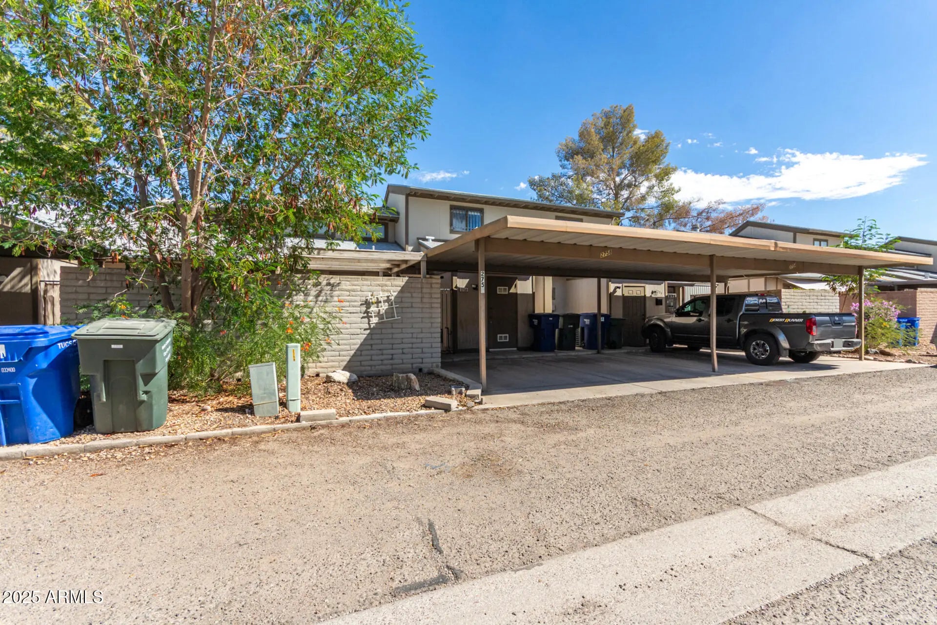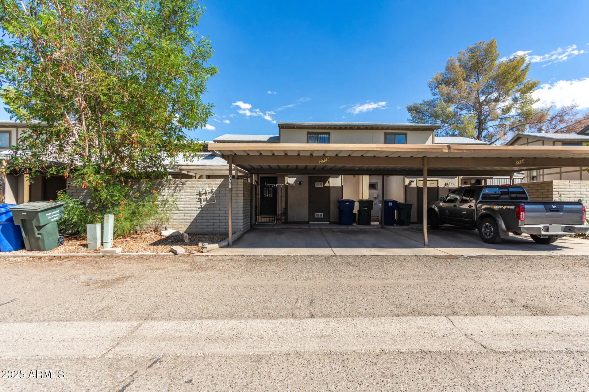 Beautifully maintained two-story attached condo! A lovely shade tree in the front yard sets a welcoming tone. Come inside to see an open layout filled w/natural light, high vaulted ceilings, clerestory windows, custom paint, plantation shutters, & elegant tile flooring throughout the main areas. The kitchen showcases tile counters, built-in appliances, white cabinets, & prep island perfect for cooking. The main bedroom is downstairs & provides convenience & privacy, boasting a closet & an ensuite w/dual sink vanity, makeup area, & sunken tiled shower. Upstairs, the secondary bedroom includes two mirrored-door closets. Don't miss the stacked laundry area! Outside, you'll find a covered patio, a storage shed, & two rear carport spaces. Enjoy the community pool! This condo is move-in ready!!