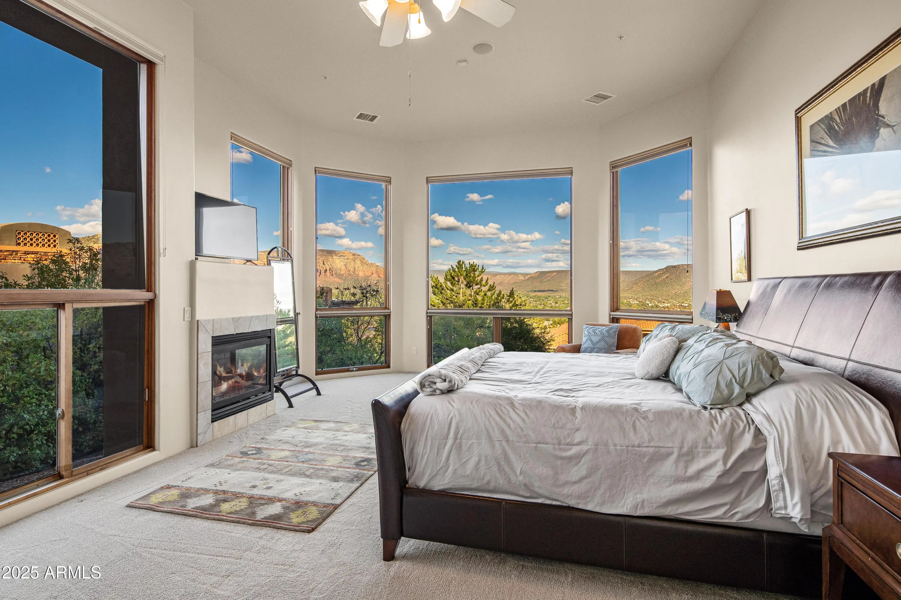 This luxurious hilltop masterpiece looks out on sweeping red rock vistas basking in awe- inspiring big-sky beauty. Overlooking the Village of Oak Creek and situated above the Sedona Golf Resort with national forestland to the rear, the property offers an expansive and secluded living experience without taking you to the middle of nowhere. The home comes with an option to purchase an adjoining lot, as well, bringing the entire property size to .87 of an acre. When you enter from the paver driveway, you're immediately captivated by a spacious interior that works in wonderful harmony with the mountain-scape outside. Cathedral wood ceilings sit atop a wide-open floorplan rich with windows and natural light. Look around and you'll find a comfortable living room space, a cozy sitting area with a gas fireplace, a dining area with room for 12, and an incredible kitchen with a breakfast bar, an island featuring plenty of prep space and a gas cooktop, natural granite surfaces throughout, tons of storage, and top-of-the-line stainless appliances, including a wine fridge and sub-zero refrigerator/freezer. To the rear of the open space are large windows and access to a stunning patio/pool area with a waterfall feature and nothing but national forestland beyond it for optimal privacy. Back inside, on the far right of the open space is a hallway leading to the primary suite. On either side of that hallway there is a generous walk-in closet. Entering the welcoming and spacious primary suite, you'll find yourself wrapped in window views and natural light. The suite features a gas fireplace and a large primary bath with two sinks, a walk-in shower, a separate tub, and access to the patio/pool area. On the opposite side of the house there is a hallway leading to a half-bath with patio access, closet space and two delightfully private en suite guest bedrooms. Also on the main level is the laundry room and access to a spacious three-car garage. Accessible from the main level but with private access from the outside is a phenomenal, open-floor-plan, upstairs in-law/guest suite with a kitchenette, full bath, private patio, and amazing views.