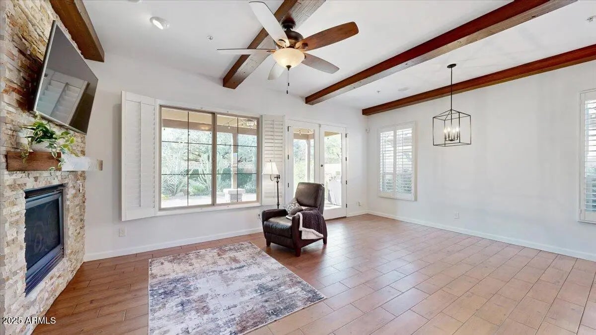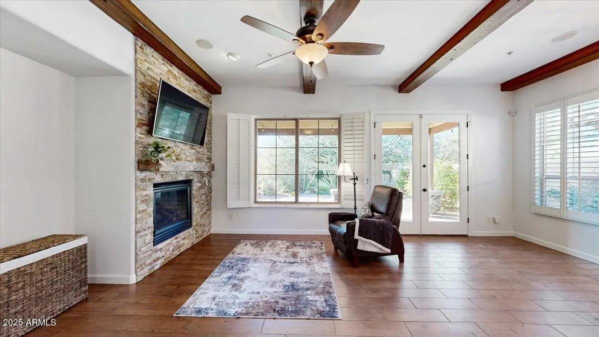 Fully remodeled stunning townhome in the gated N. Scottsdale community of Solstice, a charming courtyard welcomes you to custom beveled glass entry door, tastefully appointed kitchen with gas cooktop, drop-down hood, stainless steel appliances, subway tile backsplash, and quartz countertops, open floor plan, beautiful masonry work, floating mantel fireplace and beams in Great Room opens to covered patio lovely and professionally landscaped desert private backyard with pavers, designated sitting areas perfect for tranquil nights or entertaining, remodeled bathrooms with extensive tile work, new faucets, sink, new flooring throughout, plantation shutters, utility sink in the laundry room, new A/C, and water heater in 2020, Epoxy floor garage with floor to ceiling storage cabinets, water softener, and whole house filtration system. Community pool, spa, BBQ area, and dog park. Close to shopping, dining, and hiking. Must see this won't last long!
