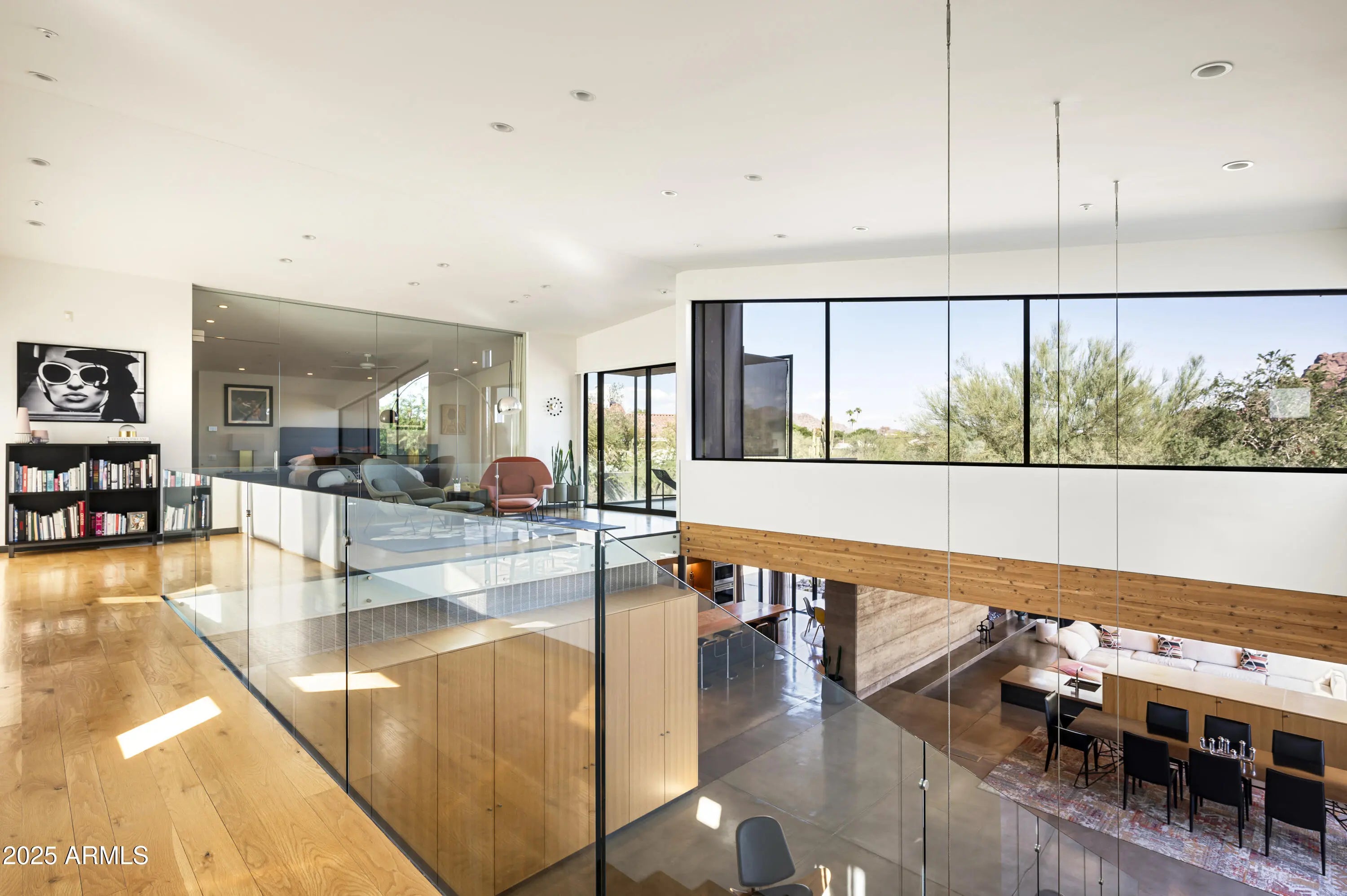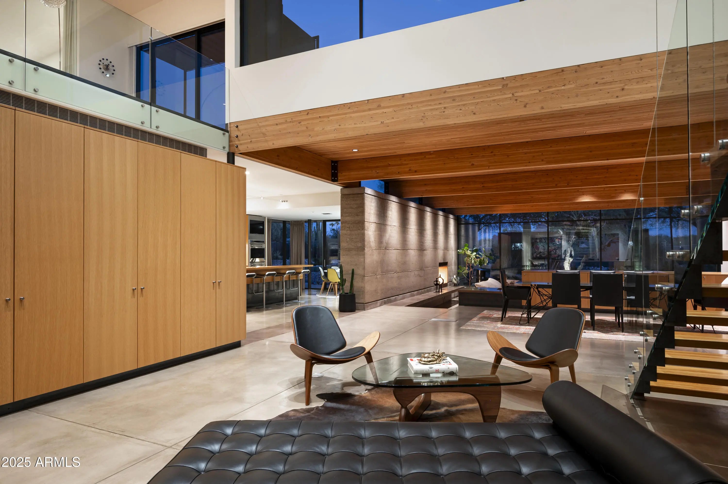 Set on a very private 2.5 acre, double gated site, this architectural masterpiece is a warm and organic modern estate that is truly timeless. Designed and built by Construction Zone featuring an axis of stout rammed earth walls running inside and out, complemented by extensive millwork, a floating staircase, polished concrete, standing seam copper and fantastic lighting. The floor plan features a large private primary suite upstairs and a wing of 3 en-suite guest bedrooms set around a guest family room. The home gym could easily be the 5th en-suite bedroom plus there is a perfect attached guest house. The grounds are exceptional and don't miss the golf simulator and new show garage which could easily become a 2nd guest house. Significant architecture in an exceptional PV neighborhood.