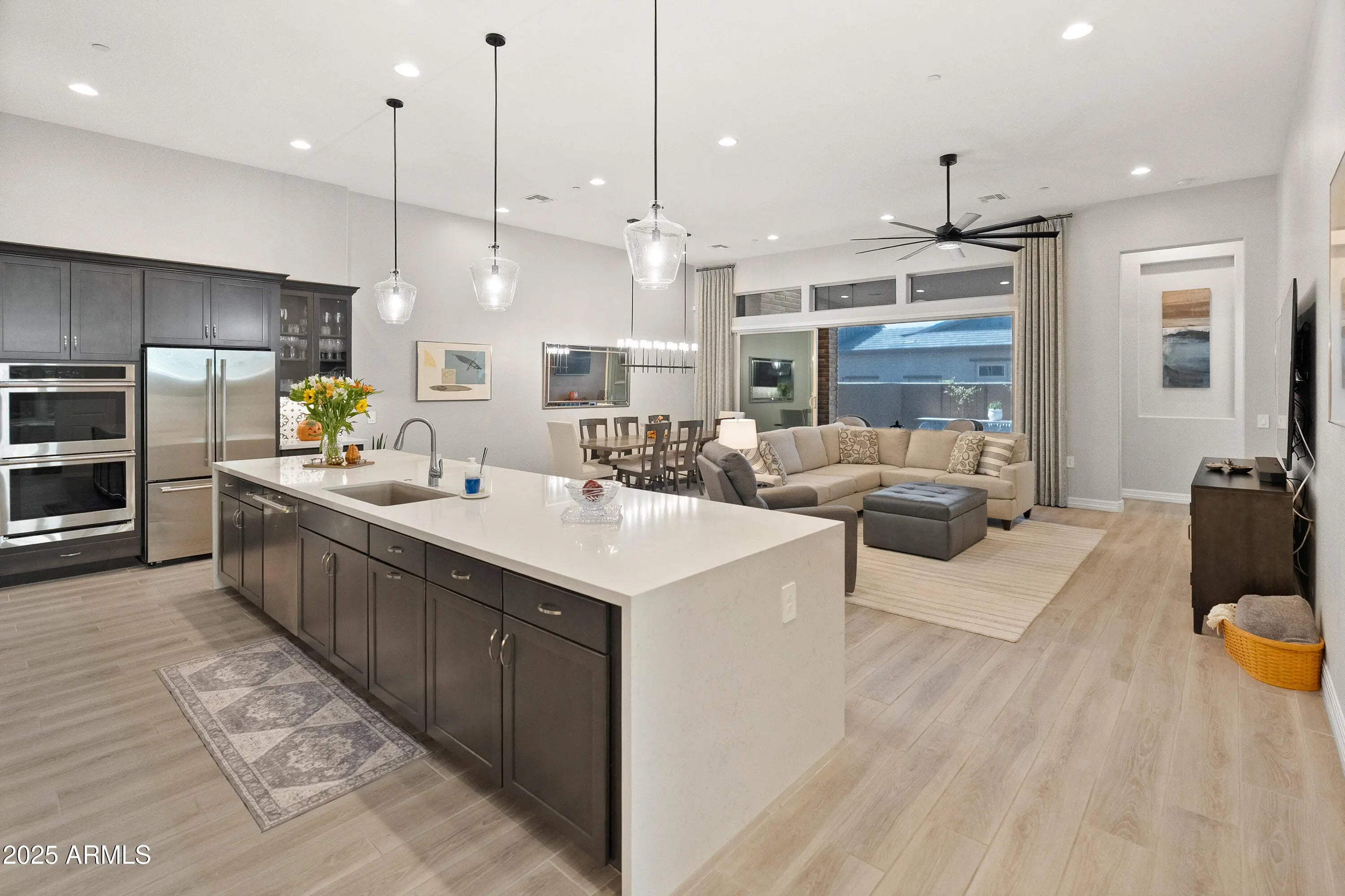 Located in a gated 55+ community, this beautifully designed home showcases tall ceilings and elegant finishes throughout. The modern kitchen features a large quartz island, stainless steel appliances, double Monogram ovens, gas cooking, and a walk-in pantry. Just off the kitchen, a cozy office nook adds functionality and charm. Enjoy seamless indoor-outdoor living with a pocket sliding door that opens to a private patio complete with a fireplace, BBQ, pool, and retractable screen—perfect for relaxing or entertaining. The community offers pickleball courts, a pool, and is conveniently located near Asher Hills Community Park.