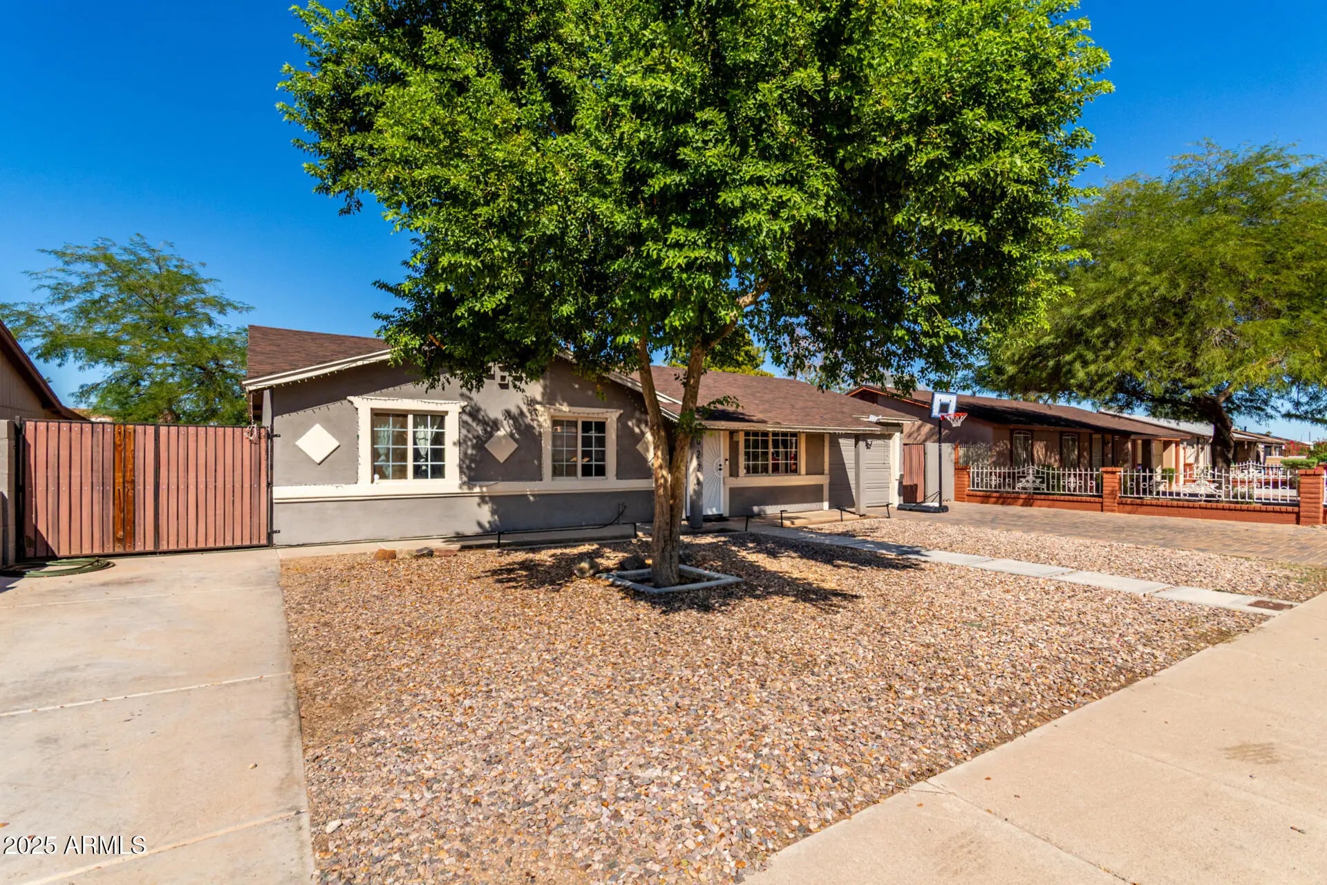 This charming 3-bedroom, 2-bath home is the one for you! You're greeted by an RV gate, stylish pavers, and a low-maintenance front yard. Inside, you'll find a serene living room with a soothing palette, blinds, and attractive wood-look flooring. The kitchen comes with quartz counters with a matching backsplash, ample wood cabinetry with crown moulding, contemporary track lighting, and built-in appliances for a seamless cooking experience. The main bedroom includes a private bathroom for added comfort. Venture out onto the backyard, which offers a covered patio and a fantastic opportunity to get creative in crafting your dream oasis. With no HOA restrictions, you'll be able to turn your vision into reality! Don't miss out on this one!