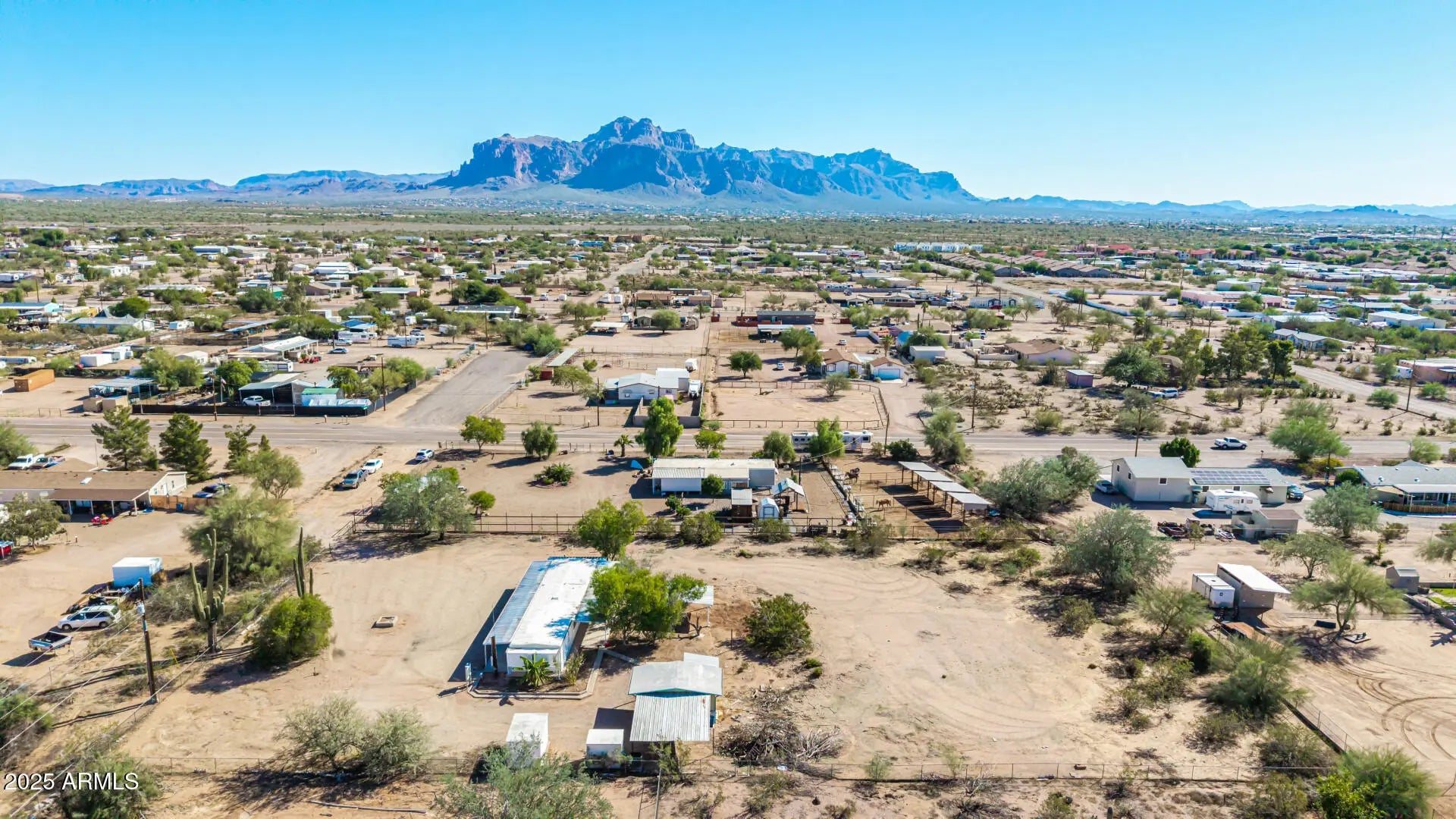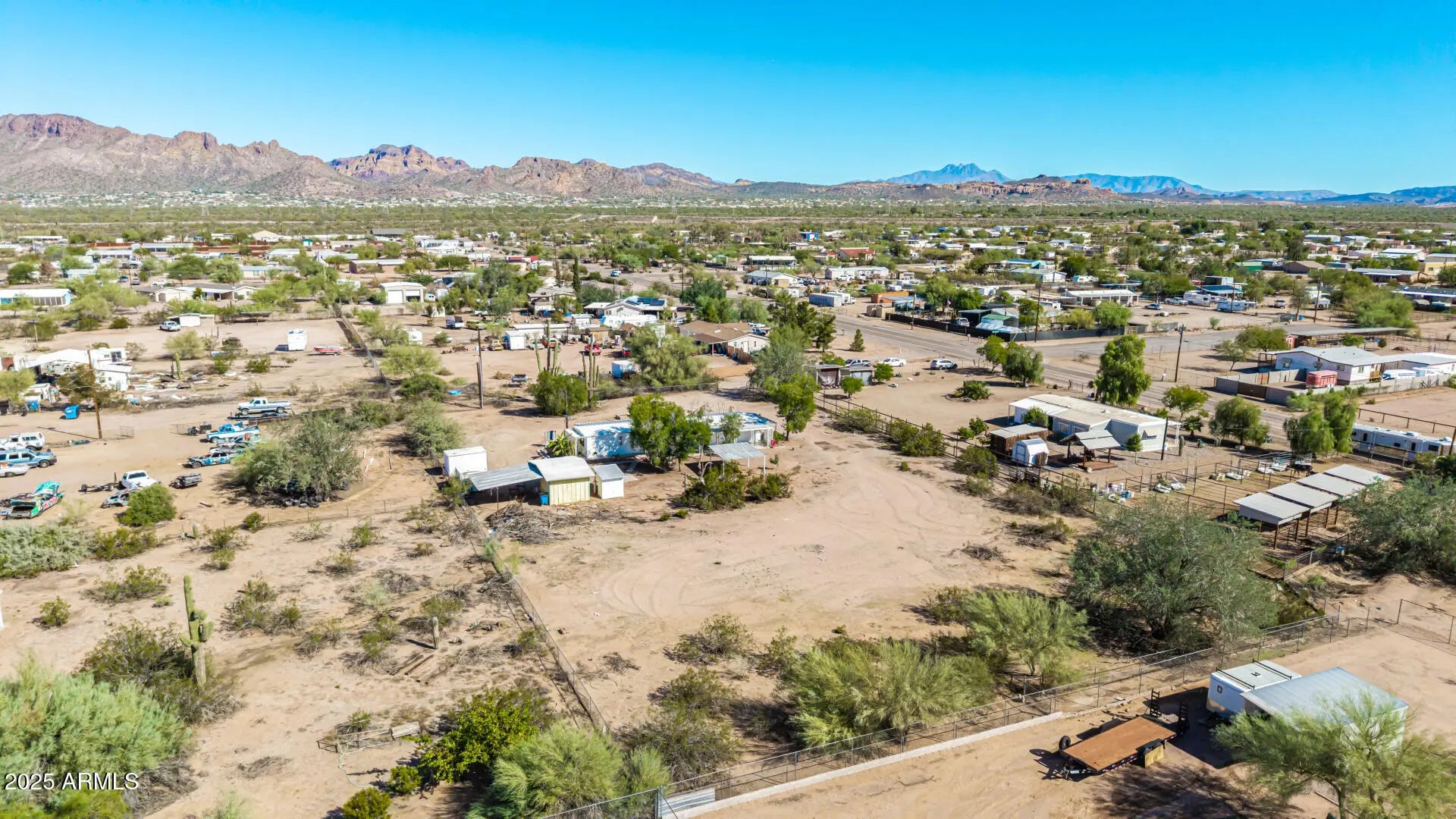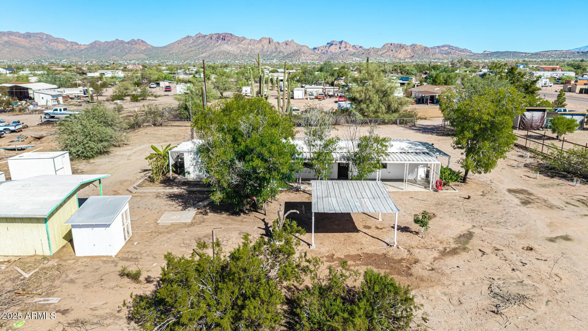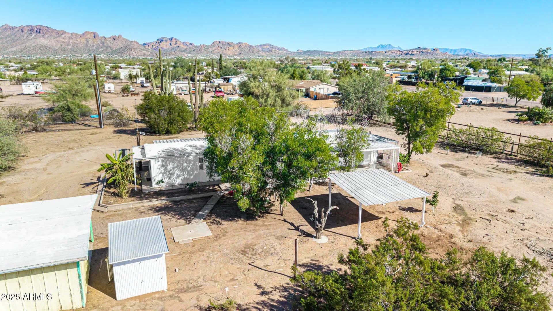 ***Property available to view beginning 10/25*** Enjoy peaceful desert living with easy access to favorite recreation sites like Salt River Tubing, Canyon Lake, and endless horse/ATV trails. You'll love the panoramic views of the Superstition Mountains from *both* porches of this charming 2-bed, 2-bath home on 1.25 acres in Apache Junction. The property offers room for horses, gardens, or future expansion—ideal for those dreaming of a custom home site. Inside, an open layout features warm wood-look flooring, neutral tones, and a modern kitchen with white shaker cabinets and updated stainless-steel appliances. The primary suite includes a private bath with extra storage space as well as a separate tub and shower. Recent upgrades include buried electrical lines and a completely redone panel, providing a solid framework for future building or additions. Step outside to a covered patio, outdoor shade ramada, storage sheds, workshop, and endless views that showcase Arizona's natural beauty.