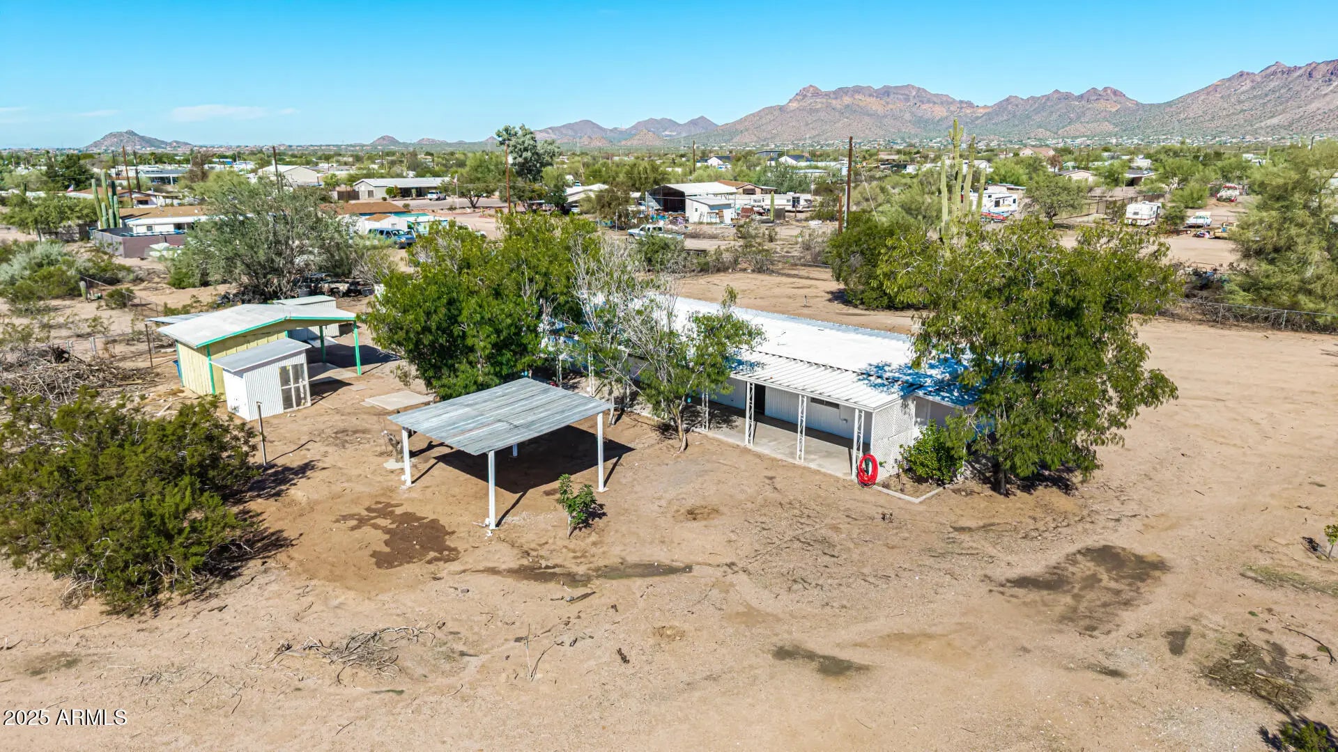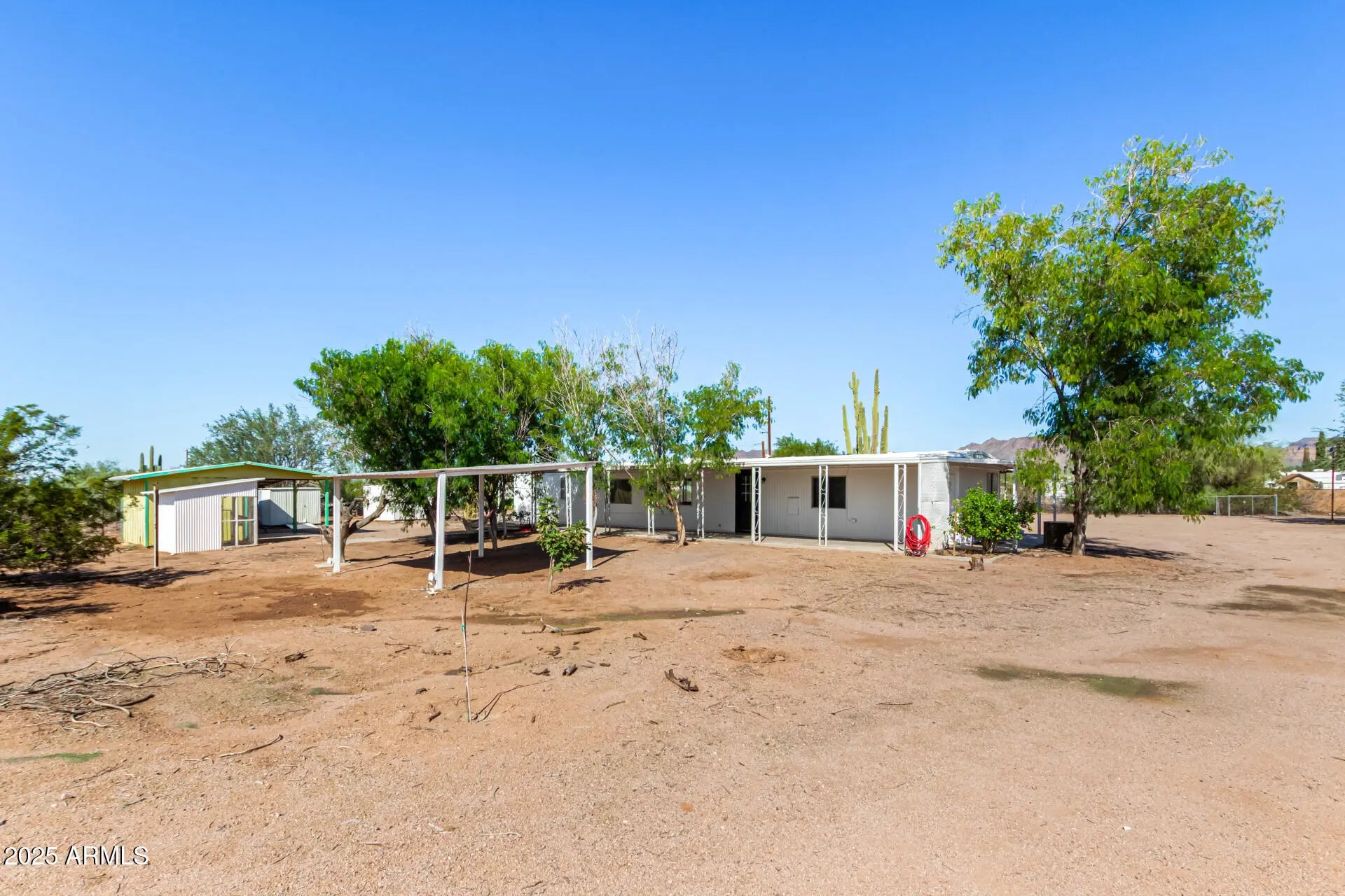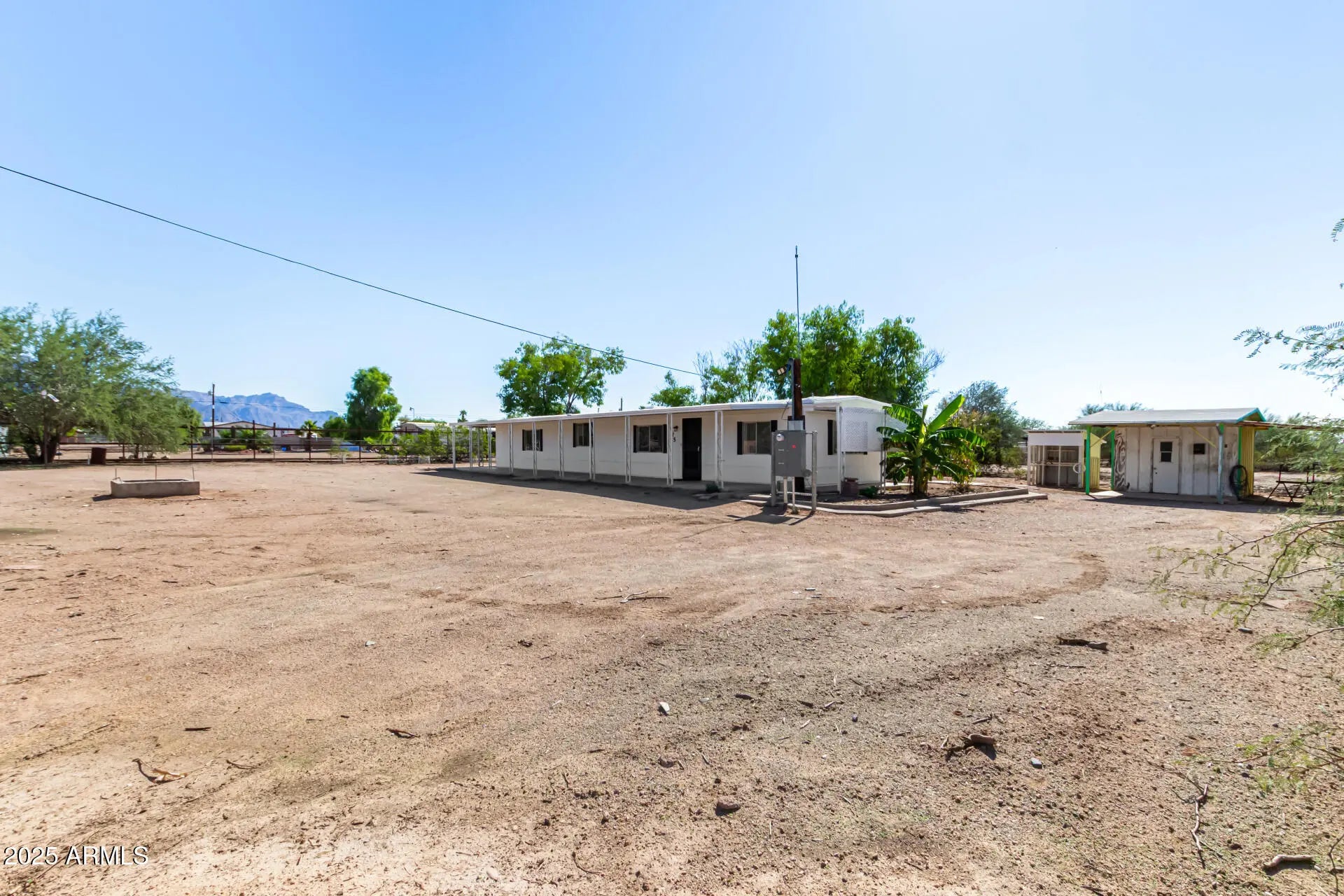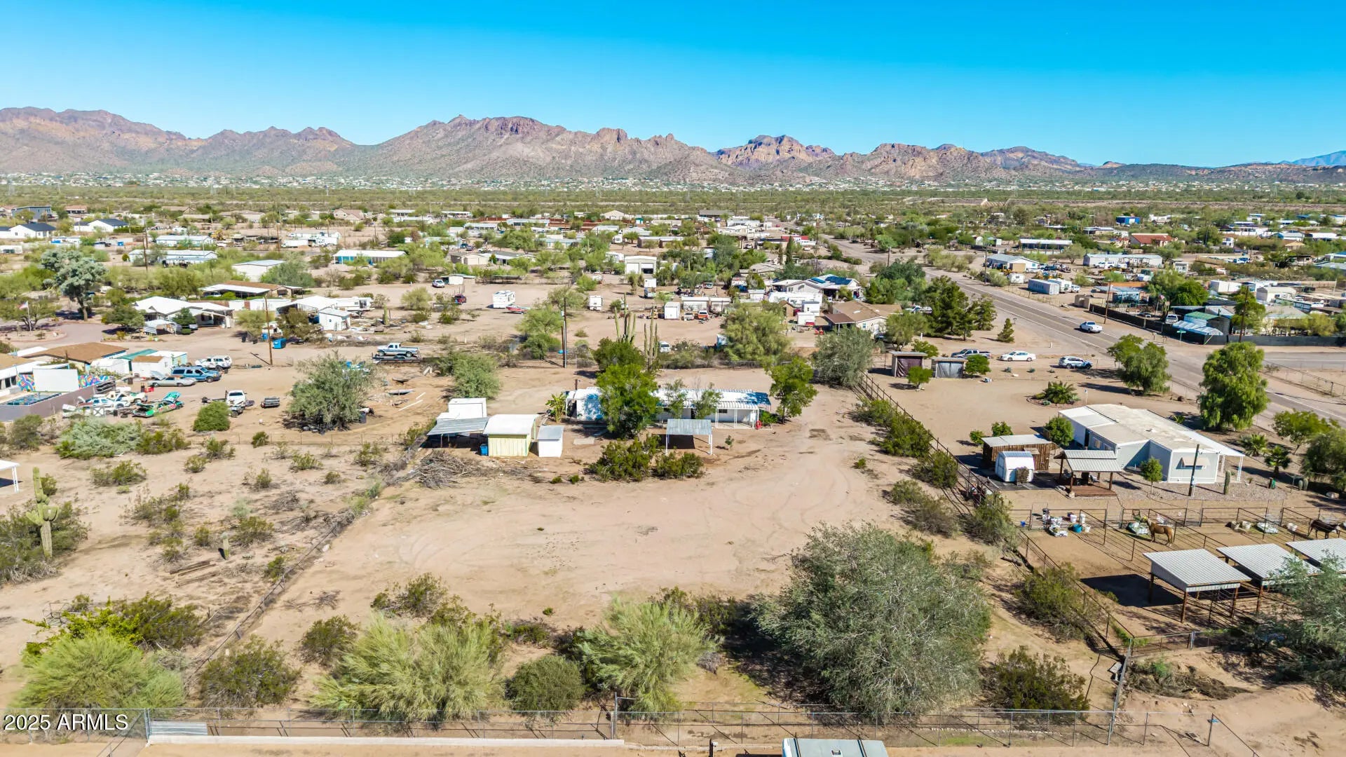 ***Property available to view beginning 10/25*** Enjoy peaceful desert living with easy access to favorite recreation sites like Salt River Tubing, Canyon Lake, and endless horse/ATV trails. You'll love the panoramic views of the Superstition Mountains from *both* porches of this charming 2-bed, 2-bath home on 1.25 acres in Apache Junction. The property offers room for horses, gardens, or future expansion—ideal for those dreaming of a custom home site. Inside, an open layout features warm wood-look flooring, neutral tones, and a modern kitchen with white shaker cabinets and updated stainless-steel appliances. The primary suite includes a private bath with extra storage space as well as a separate tub and shower. Recent upgrades include buried electrical lines and a completely redone panel, providing a solid framework for future building or additions. Step outside to a covered patio, outdoor shade ramada, storage sheds, workshop, and endless views that showcase Arizona's natural beauty.