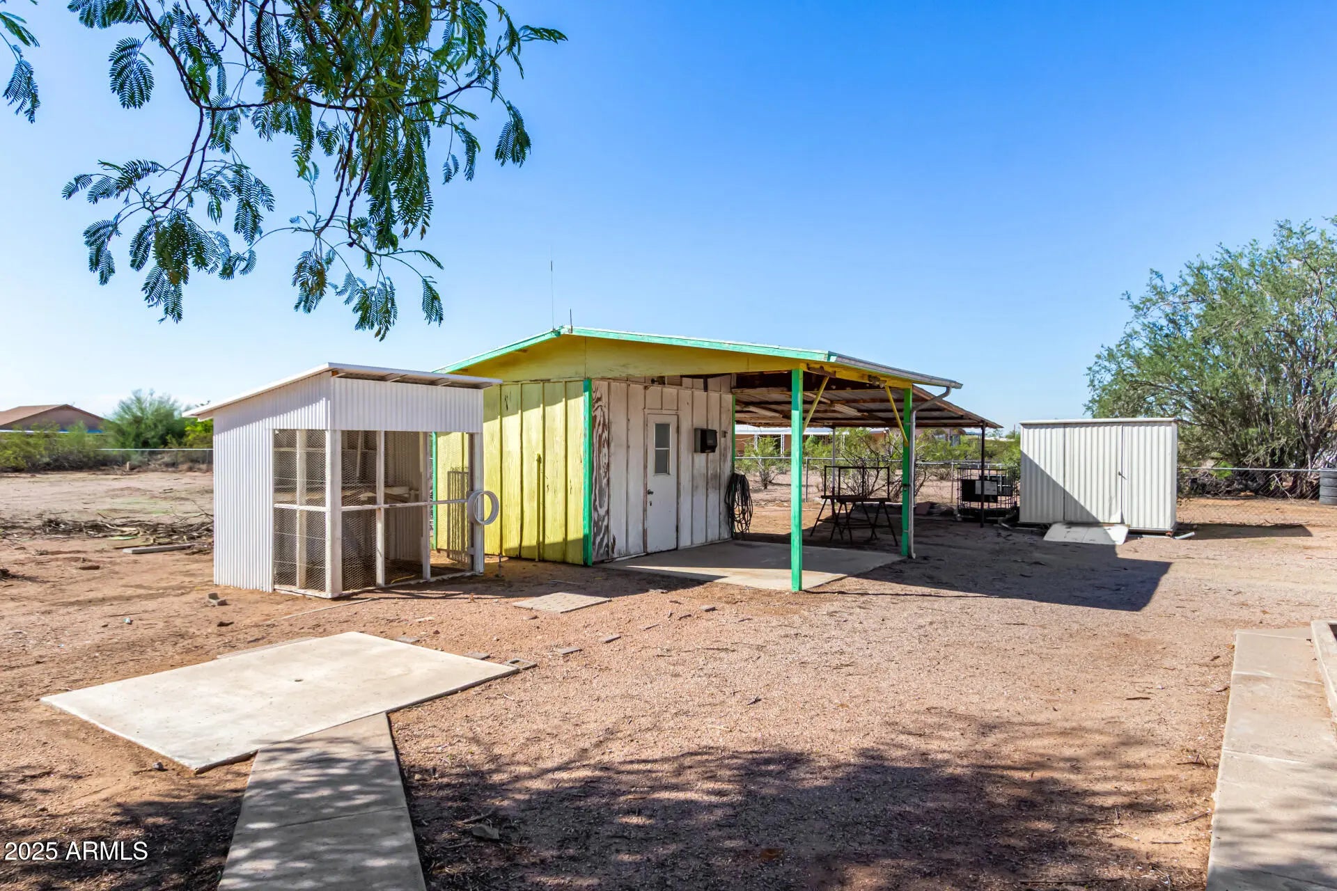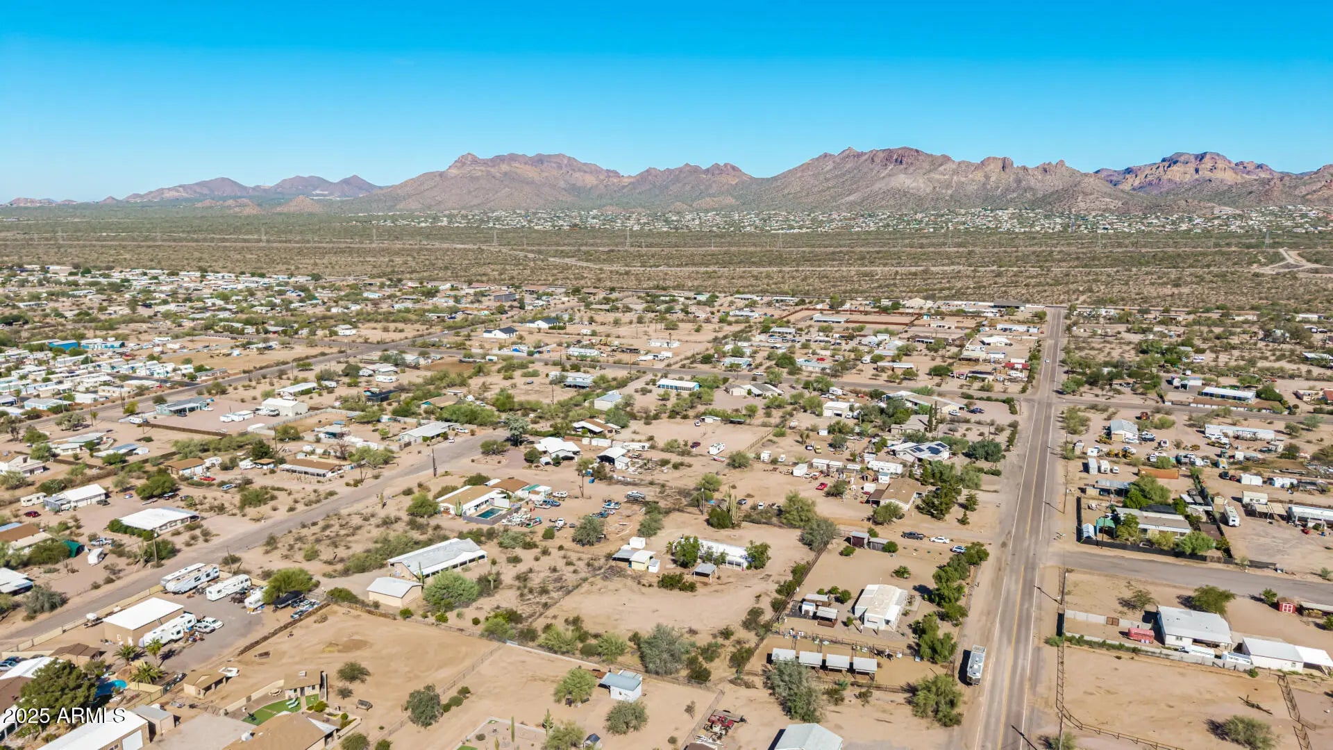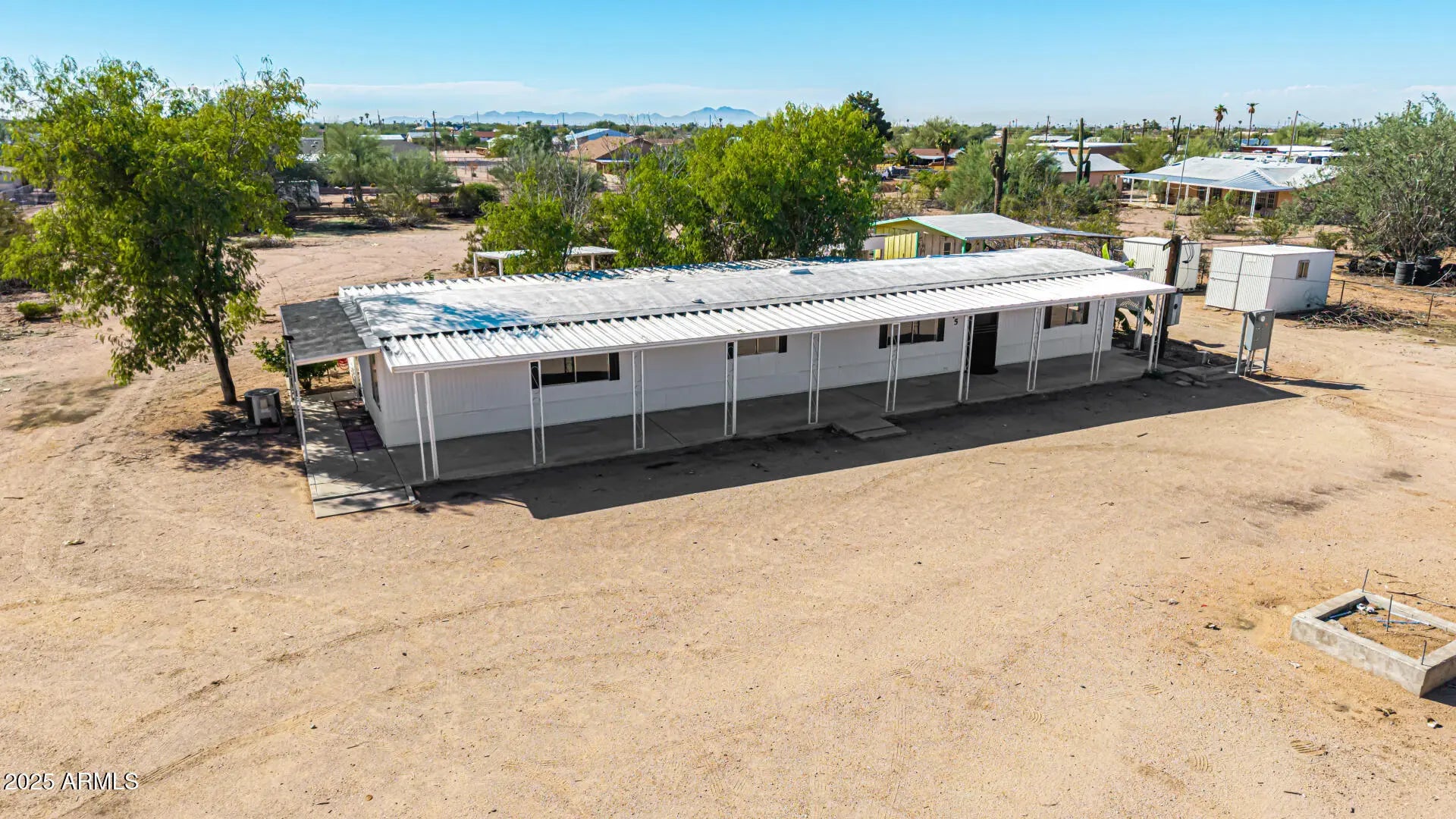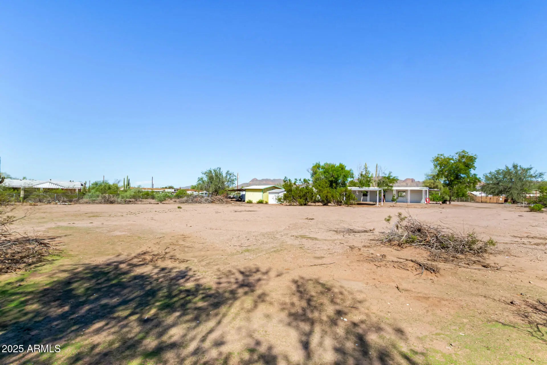 ***Property available to view beginning 10/25*** Enjoy peaceful desert living with easy access to favorite recreation sites like Salt River Tubing, Canyon Lake, and endless horse/ATV trails. You'll love the panoramic views of the Superstition Mountains from *both* porches of this charming 2-bed, 2-bath home on 1.25 acres in Apache Junction. The property offers room for horses, gardens, or future expansion—ideal for those dreaming of a custom home site. Inside, an open layout features warm wood-look flooring, neutral tones, and a modern kitchen with white shaker cabinets and updated stainless-steel appliances. The primary suite includes a private bath with extra storage space as well as a separate tub and shower. Recent upgrades include buried electrical lines and a completely redone panel, providing a solid framework for future building or additions. Step outside to a covered patio, outdoor shade ramada, storage sheds, workshop, and endless views that showcase Arizona's natural beauty.