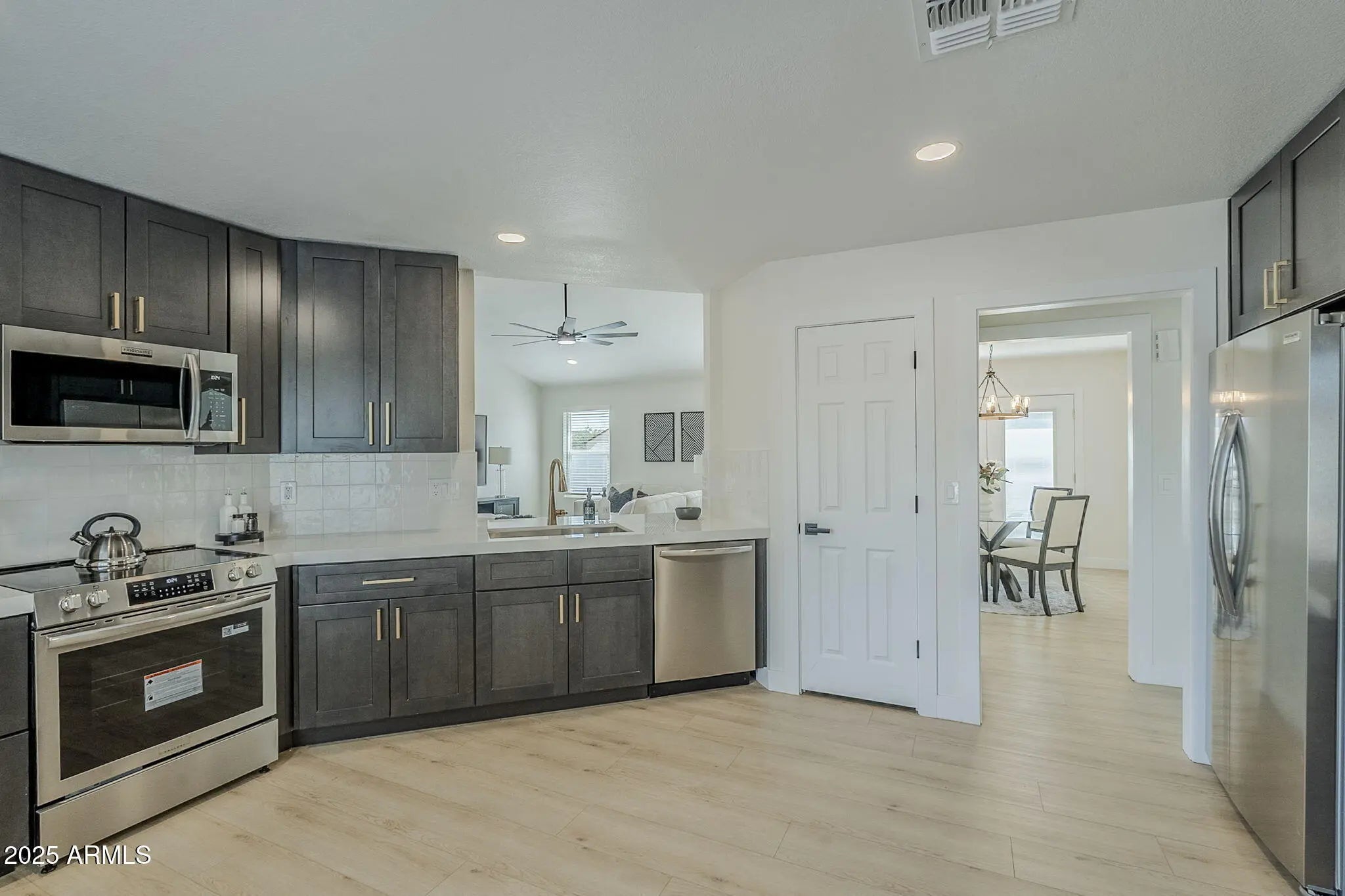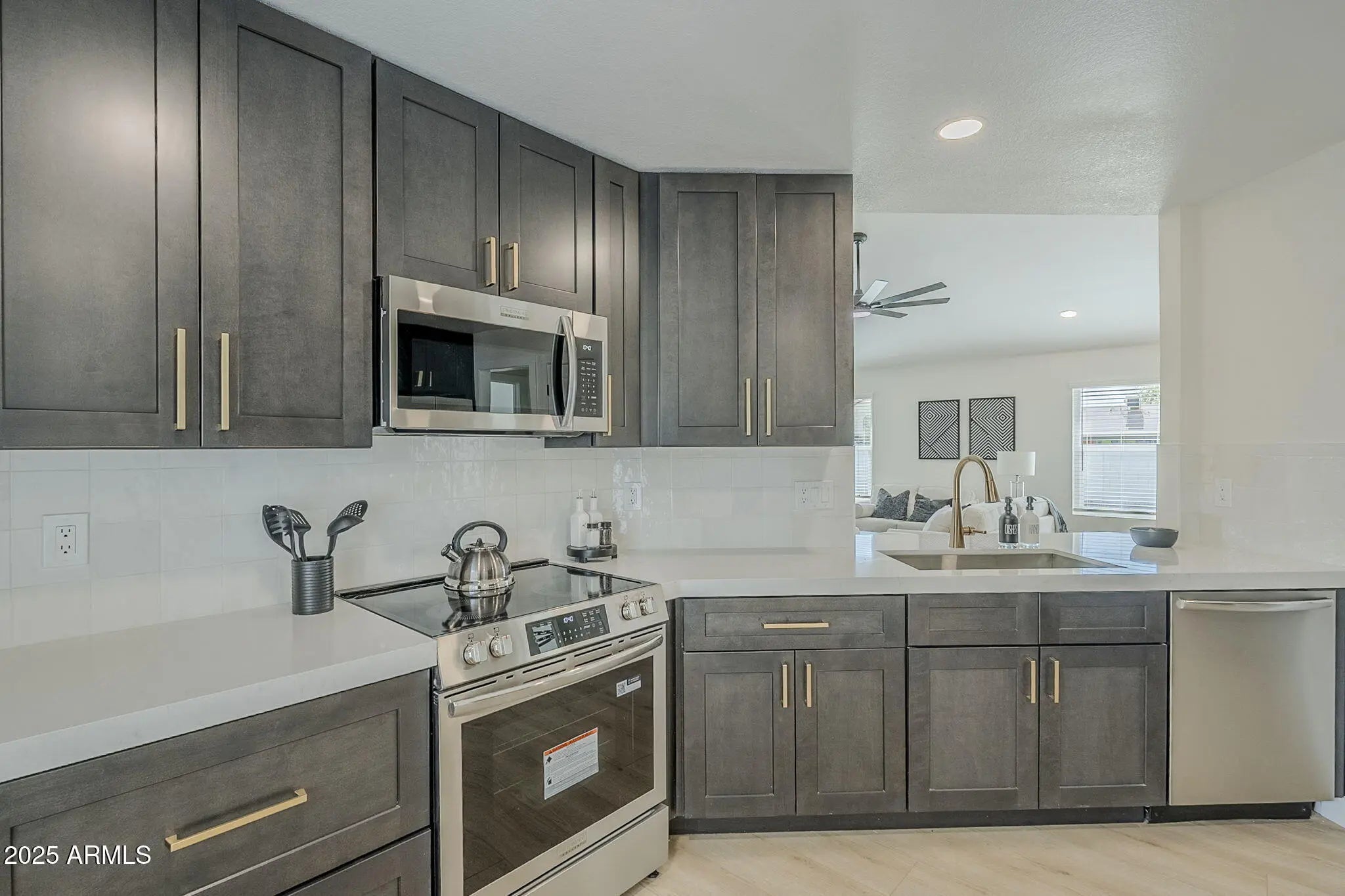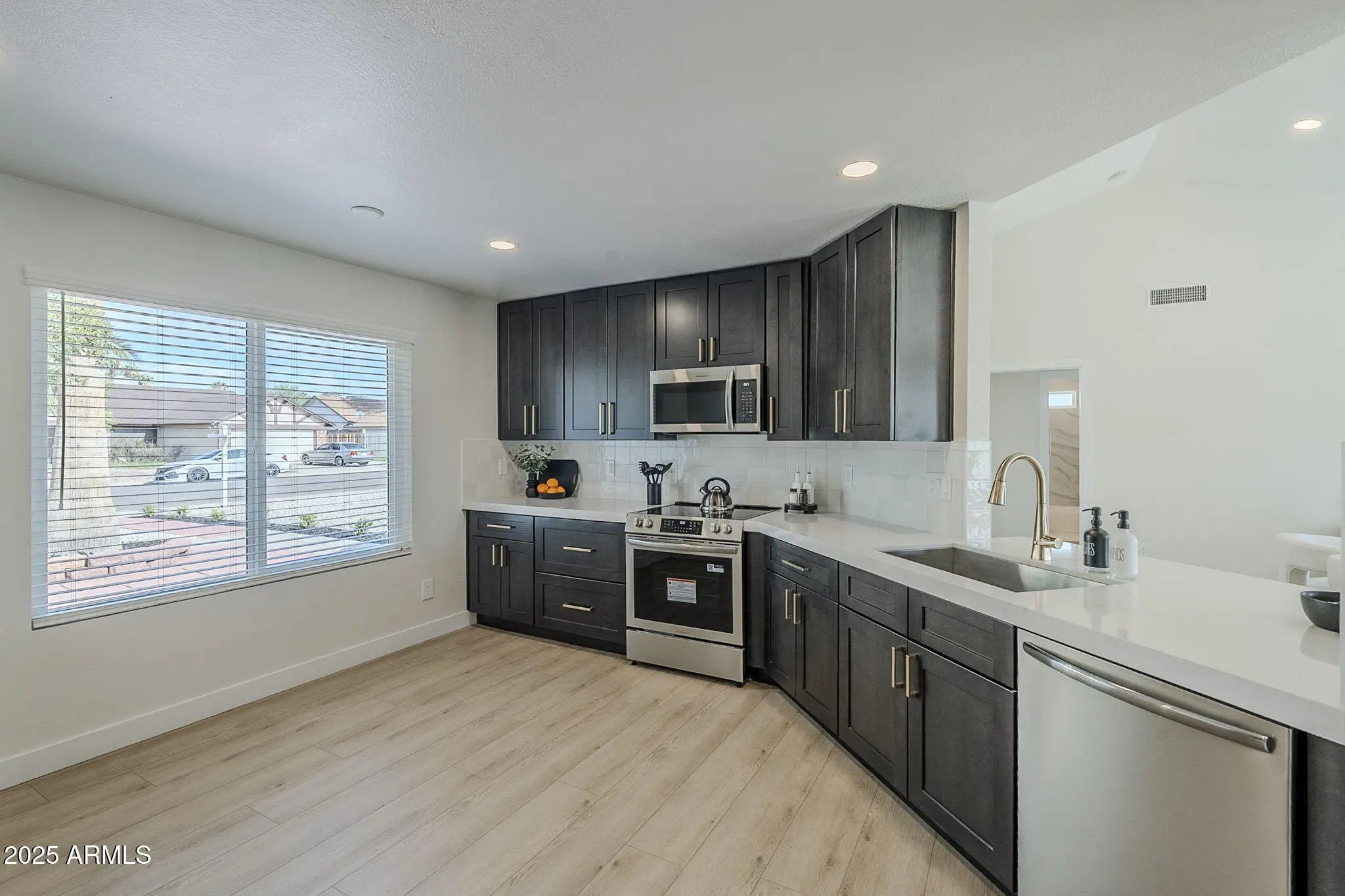 Welcome to this fully remodeled Chandler gem, ideally located in a desirable non-HOA neighborhood just minutes from major shopping, dining, and entertainment options. With convenient freeway access to the 101, 202, and I-10, and close proximity to top-rated Chandler schools, this home perfectly combines comfort and convenience. From the moment you arrive, the brand-new roof, fresh exterior paint, and low-maintenance landscaping give this home exceptional curb appeal. Step inside and be greeted by soaring vaulted ceilings and new wood-look flooring that flows through the main living areas, complemented by plush patterned carpet in the bedrooms for a warm, inviting feel. The spacious great room opens seamlessly into a stunning brand-new kitchen, featuring black shaker cabinets with brushed gold hardware, modern white quartz countertops, a custom-tiled backsplash with under-cabinet lighting, and new stainless-steel appliancesa true showpiece designed for entertaining. The split floor plan offers privacy, with the luxury primary suite on the west side of the home showcasing vaulted ceilings, a dual vanity, custom-tiled walk-in shower, dual closets, and a private toilet room. Forget the big-ticket worriesthis home includes a brand-new roof with warranty, all new dual-pane windows and window coverings, and a new A/C unit for peace of mind. The two additional bedrooms are located on the opposite side of the home along with a beautifully renovated hall bath. Modern touches like new ceiling fans, door hardware, and updated light and plumbing fixtures throughout give the entire home a fresh, contemporary feel. Step outside to a spacious backyard with freshly laid sod, perfect for relaxing or entertaining, and enjoy the epoxy-coated garage floor that adds a clean, finished touch. Don't miss your chance to own this turnkey Chandler beauty in the heart of the cityjust minutes from Chandler Fashion Center and all the best the East Valley has to offer!