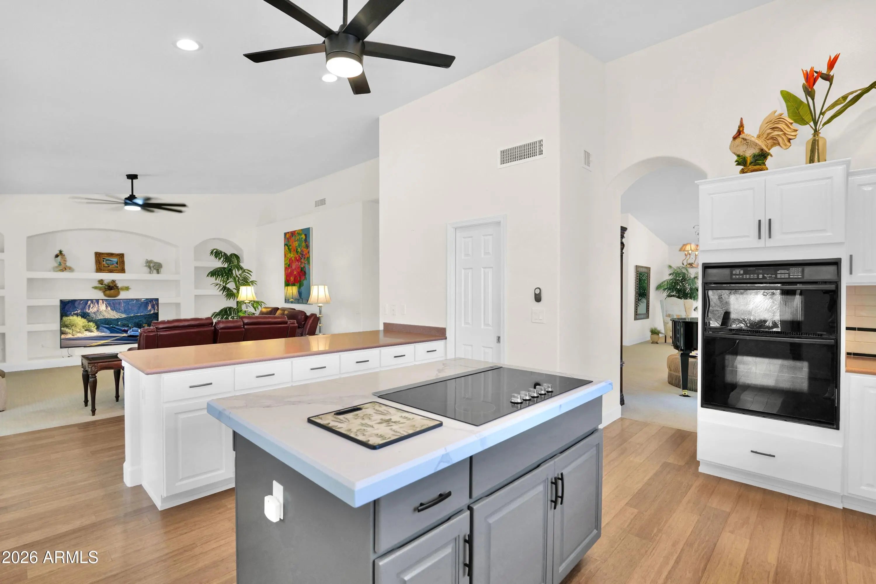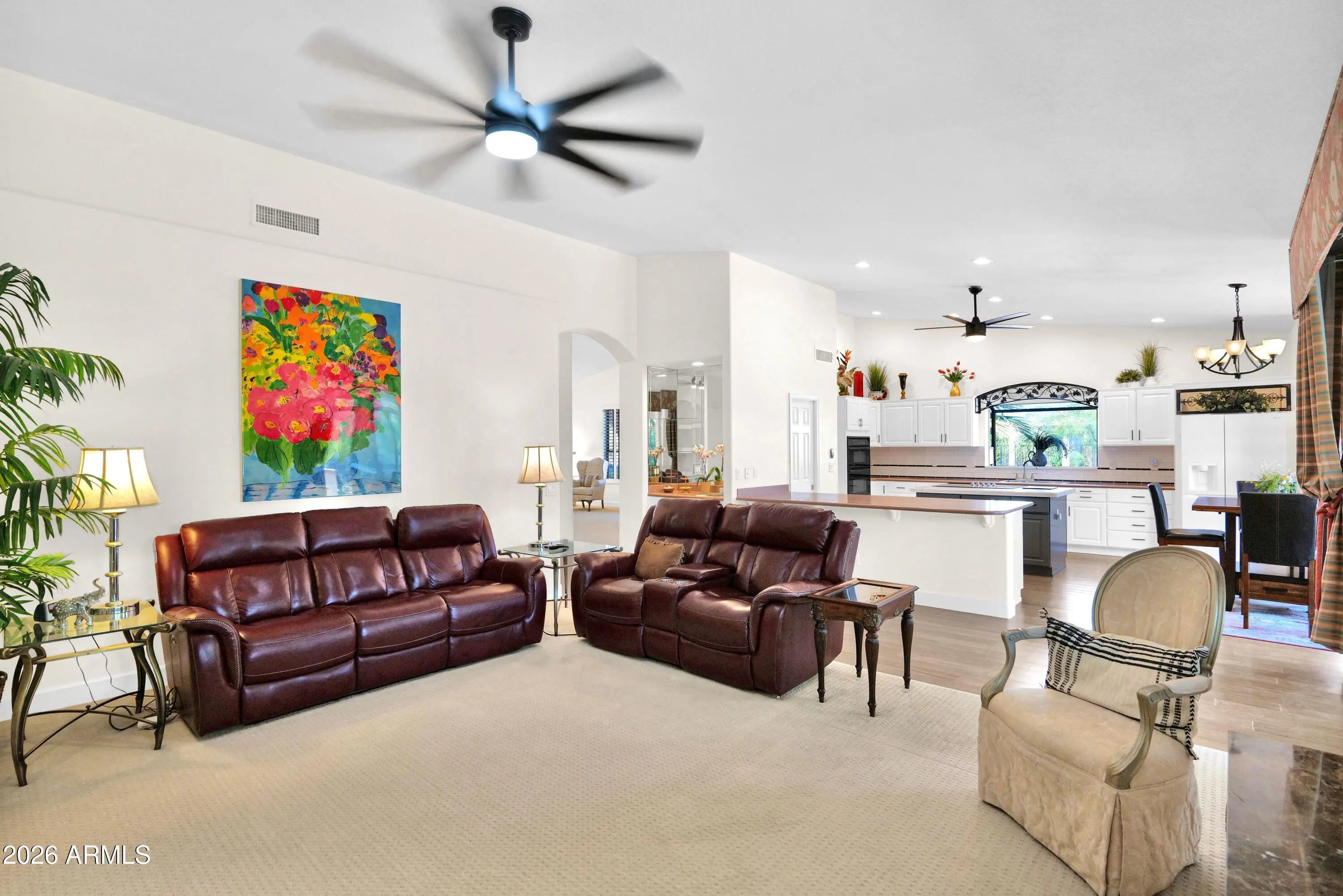 Truly EXCEPTIONAL value for one of the largest freshly updated homes in the gated Oakwood community of Sun Lakes! Offering over 3,500 sq ft of beautifully refreshed living space, this home combines impressive entertaining areas with the peace of mind of major upgrades already completed including new roof ('23), new HVAC systems ('22), and a stylish kitchen remodel ('22). Soaring vaulted ceilings and expansive windows fill the main living areas with natural light while framing serene views of the adjacent greenbelt. The remodeled kitchen features painted cabinetry, quartz island, subway tile backsplash, new appliances, and a generous serving bar that opens seamlessly to the inviting family room -perfect for gathering with friends and family. The main-level primary suite offers privacy and comfort with a beautifully renovated spa-style bath featuring a dual-head super shower, new cabinetry, stone counters, and custom closet systems. A double-door office with built-ins sits near the entry, ideal for hobbies or working from home. Upstairs, two spacious guest bedrooms and a full bath provide excellent separation for visiting family, friends, or use as additional hobby space. Outdoor living is equally inviting with a quality Arizona Room and backyard with built-in BBQ--perfect for enjoying Arizona evenings. A spacious 3-car garage provides ample room for vehicles, golf cart, and storage. Residents of Sun Lakes enjoy an exceptional resort lifestyle with clubhouses, heated pools and spas, fitness center, restaurants, walking paths, and 45 holes of golf, along with tennis and pickleball at the IronOaks Racquet Center. If you've been searching for a spacious, move-in-ready home in one of Arizona's premier active-adult communities, this is an opportunity not to miss.