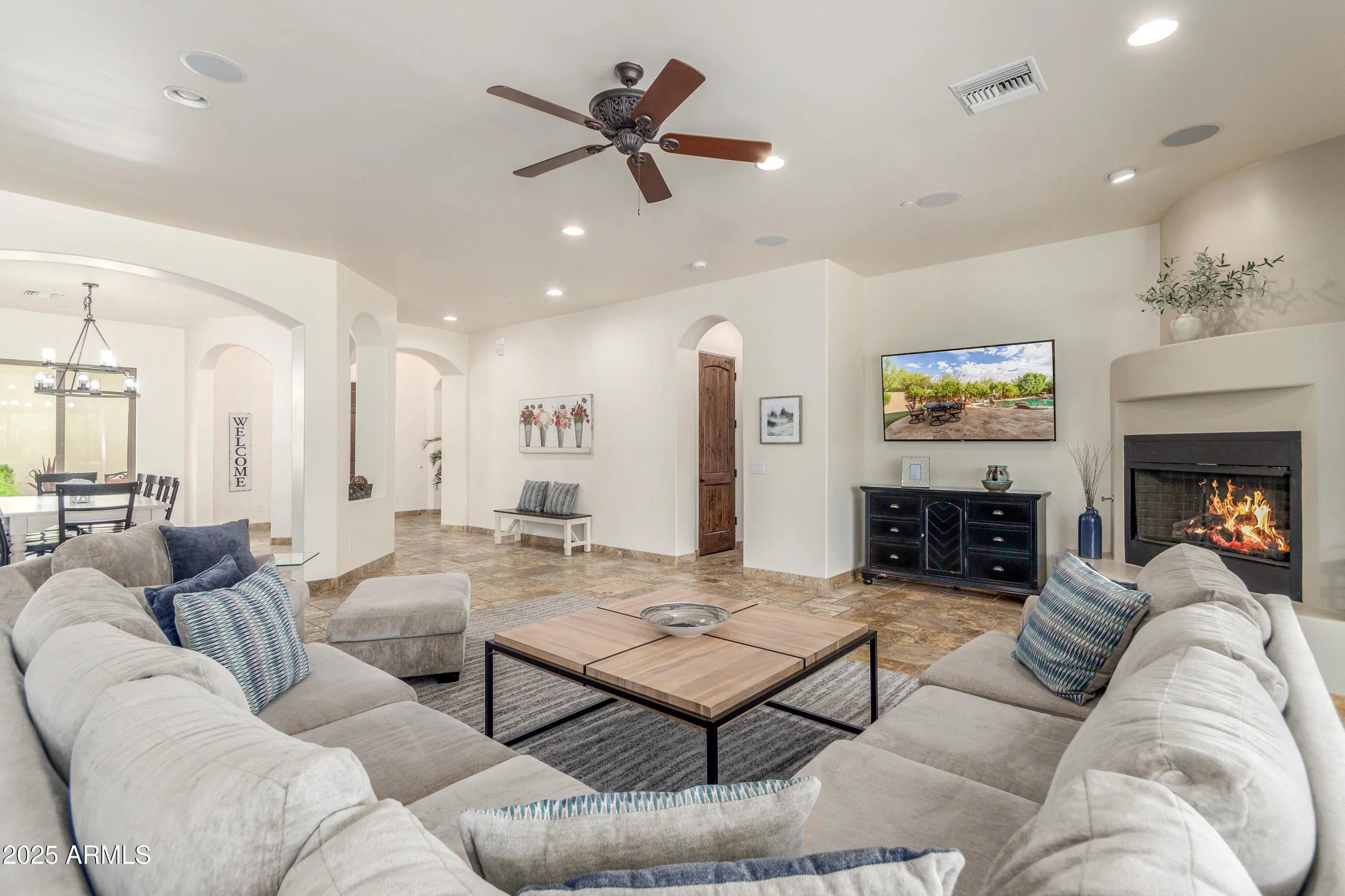 BUYER NEVER OPENED ESCROW AND COULD NOT PERFORM! Exquisite Toll Brothers Estate in Gated Montevista — Refined Elegance Meets Resort Living! Welcome to this exceptional Marchetti Model residence, perfectly positioned on a premium oversized lot across from a picturesque five-acre park in the coveted gated community of Montevista. Backing to a peaceful green belt, this designer-appointed home blends architectural sophistication with resort-style living. Step inside to discover an open Great-Room floor plan and split layout that effortlessly balances everyday comfort with upscale entertaining. A private Casita, spacious Bonus Room, and Control 4 Smart Home System elevate both functionality and luxury. The home showcases custom built-in cabinetry in the Den, Primary Suite, Loft, and Bonus Room, alongside hand-selected chandeliers, travertine flooring, Santa Fe wall texture, and solid-core wood doors throughout. A gas fireplace with hearth, framed mirrors, 36" vanities, and upgraded fixtures and finishes complete the home's refined aesthetic. The gourmet Kitchen is a showpiece in itself featuring an expansive center island, 48" built-in refrigerator, double convection ovens, five-burner gas cooktop, beverage center, under-cabinet lighting, and staggered custom cabinetry with pull-out drawers. Designed for both form and function, it's the ideal space for gatherings, both casual and grand. Entertainment flows seamlessly throughout the home with integrated surround sound, extending to the Front Courtyard, Backyard, and Garage. The resort-inspired Backyard is a true oasis: a heated pool with Baja step, spa with cascading waterfall, gas fire pit with seating area, and synthetic turf play zone, framed by mature fruit trees and an extended covered patio are all perfect for outdoor living under the Arizona sky. Additional highlights include a three-car Garage with epoxy flooring, built-in cabinetry, workbench, 220V Tesla outlet, and service door. The paver driveway with medallion inlay, custom wrought-iron gates and doors, and professionally designed landscaping create unmatched curb appeal. Located just 10 minutes from Desert Ridge and downtown Cave Creek, Montevista offers the ideal blend of convenience and serenity where starlit skies, scenic walking paths, and neighborhood parks define an exceptional lifestyle. This is more than a home - it's a statement of quality, craftsmanship, and Arizona luxury living at its finest.