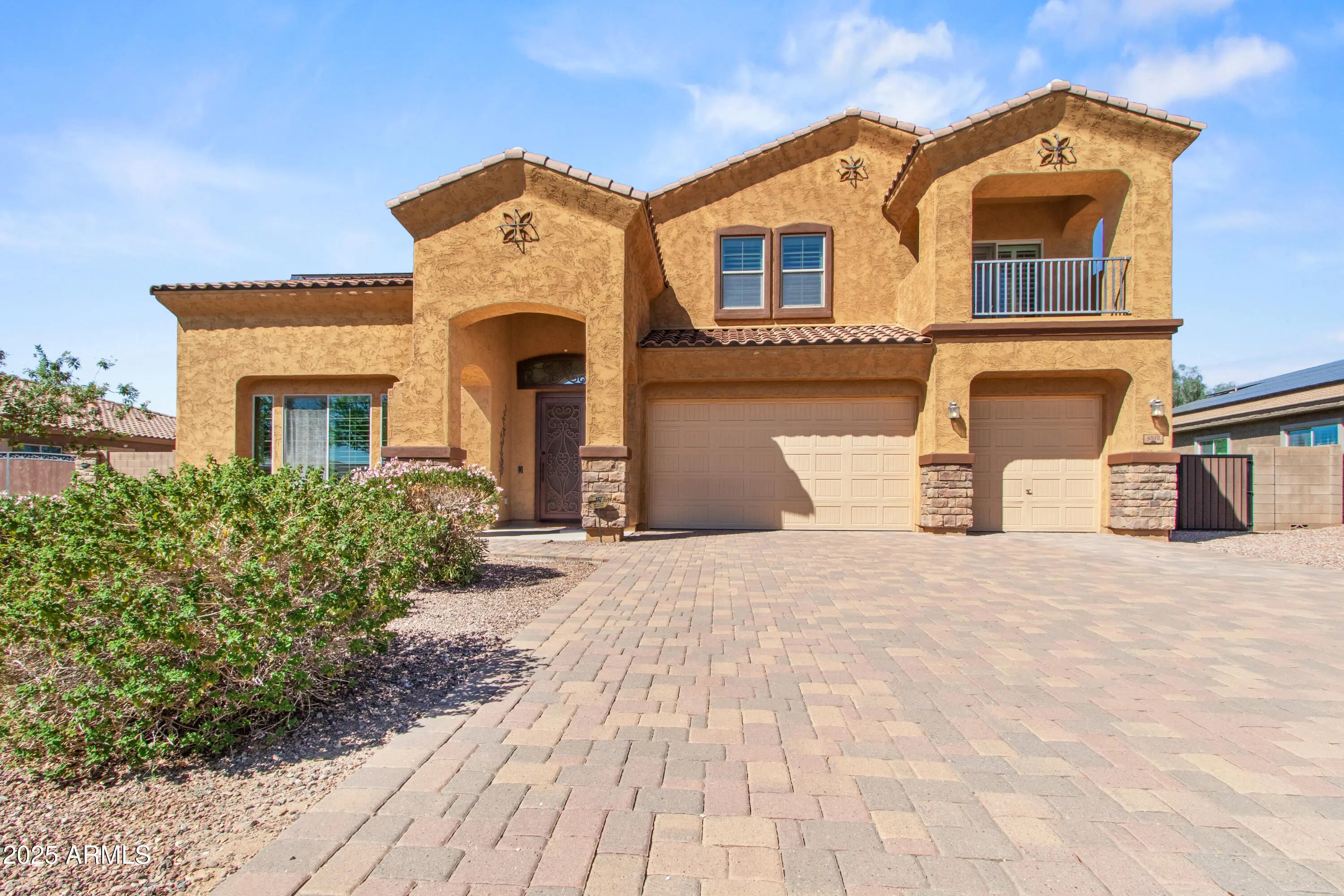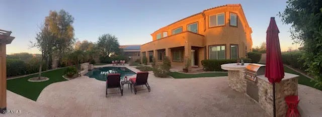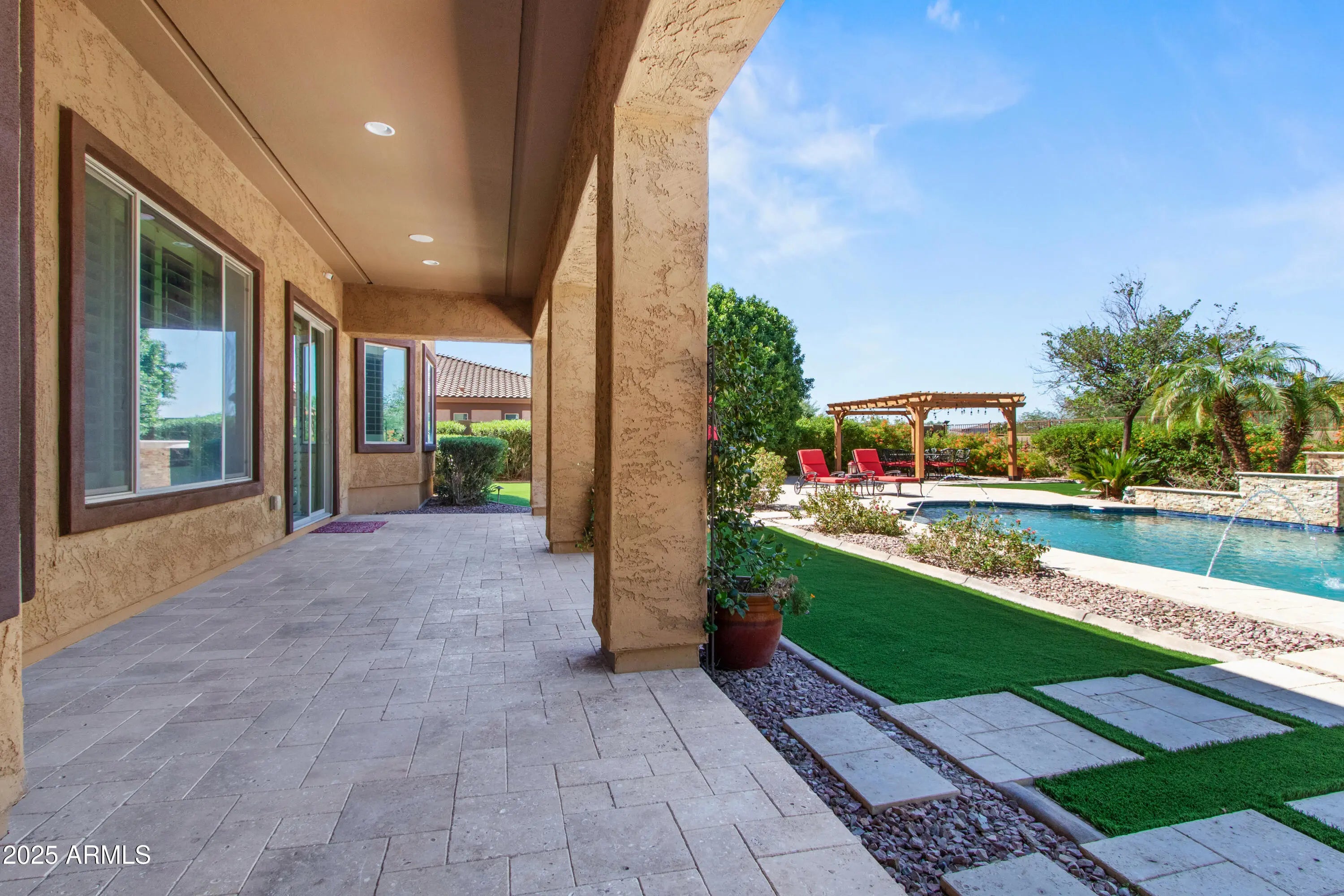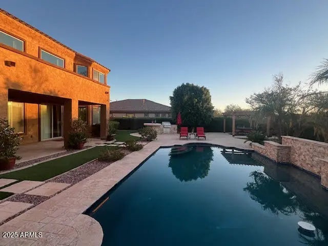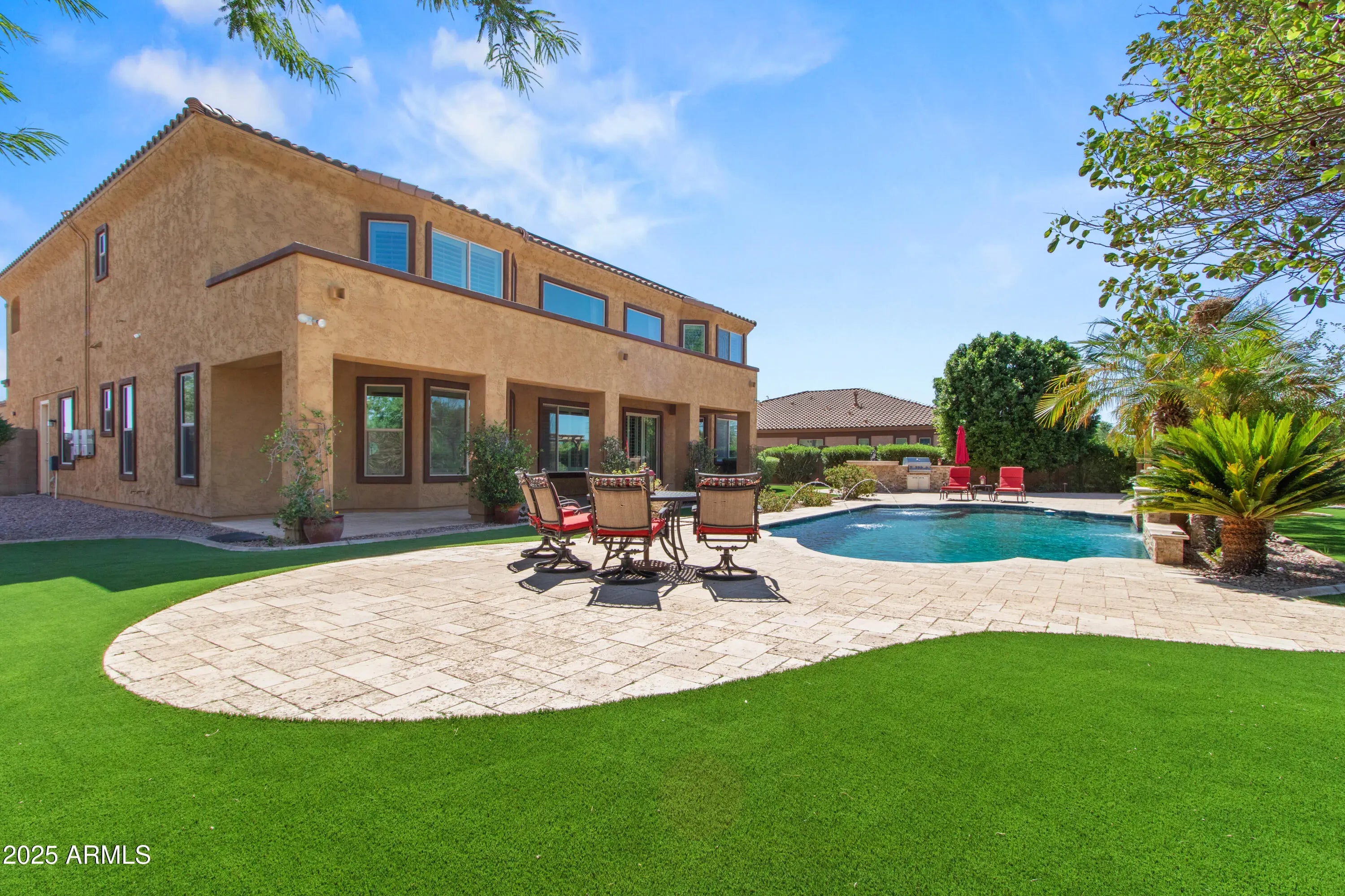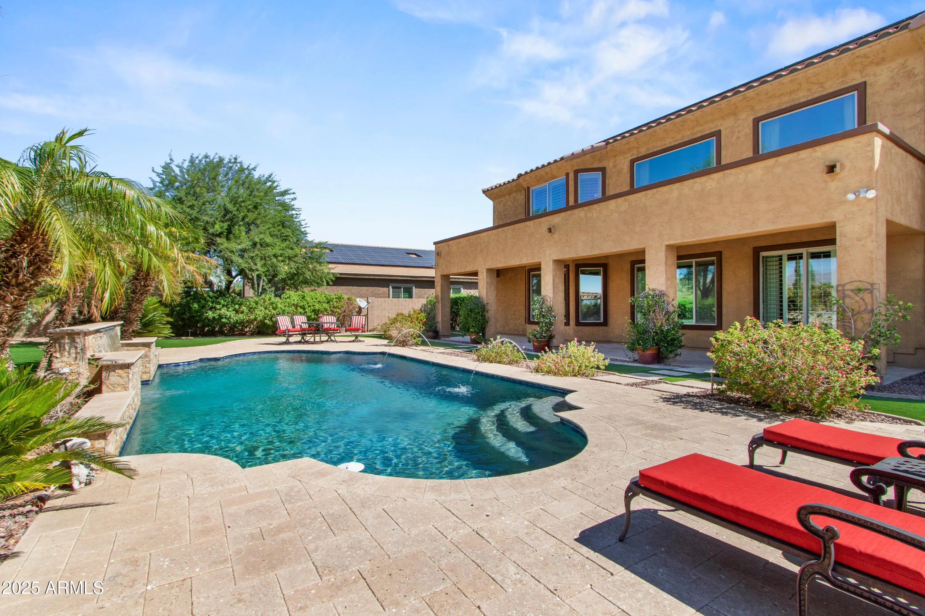 The word 'WOW' does not come close to describing this gorgeous luxury home of 5 BRs, 3.5 BAs with fireplace, 26-foot cathedral ceilings, California Shutters throughout + professional window treatments, open floorplan w/ natural lighting accenting the magnificence of this architectural design, w/huge loft + 4 bedrooms upstairs & Primary Bedroom downstairs, wonderful kitchen area with SS appliances, large double granite islands + breakfast area overlooking the backyard. Relax or entertain in your backyard oasis w/refreshing swimming pool including waterfall & light features, complimented by extended covered patio w/ Travertine flooring & pool decking, gazebo, built in BBQ plus 20K in luxurious new turf. Backyard overlooks walking/bike paths as well as stunning mountain views. This beautiful dream home is located in the prestigious Sedella gated community giving you privacy and security in one of the quietest and sought after neighborhoods in Goodyear. Upgraded driveway with pavers not only adds curb appeal but welcomes you into your freshly painted 3-car garage with new epoxy floor, auto charging station, and water softener system. Partial interior freshly painted. 14ft heavy-duty and balanced RV gate. Home comes with a leased solar system which greatly reduces your electric bills. Landscaping, AC and pool have been professionally maintained. Easy access to the 303 and just minutes away from great hiking, golfing, shopping and restaurants. Schools, parks and playgrounds are within walking distance.