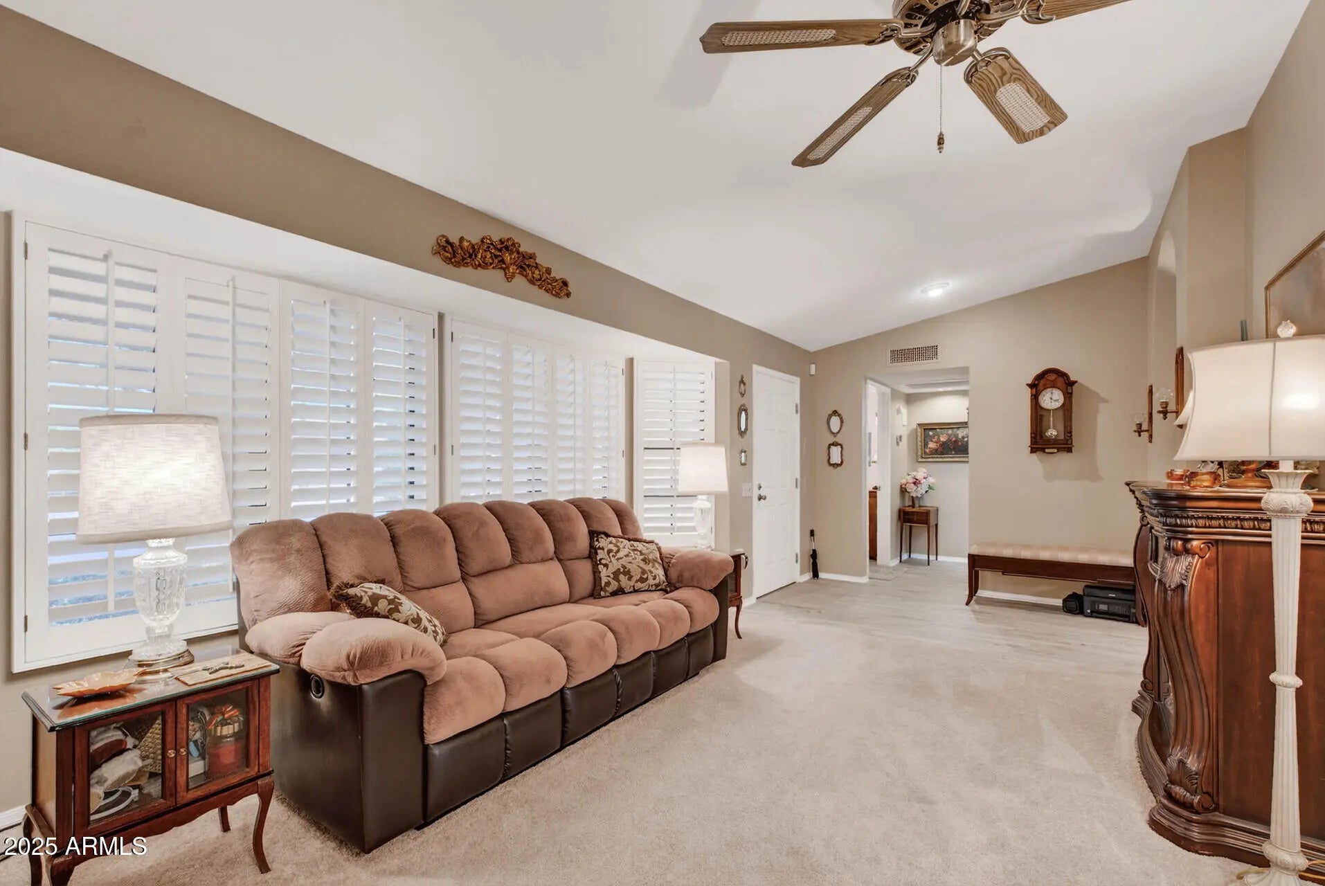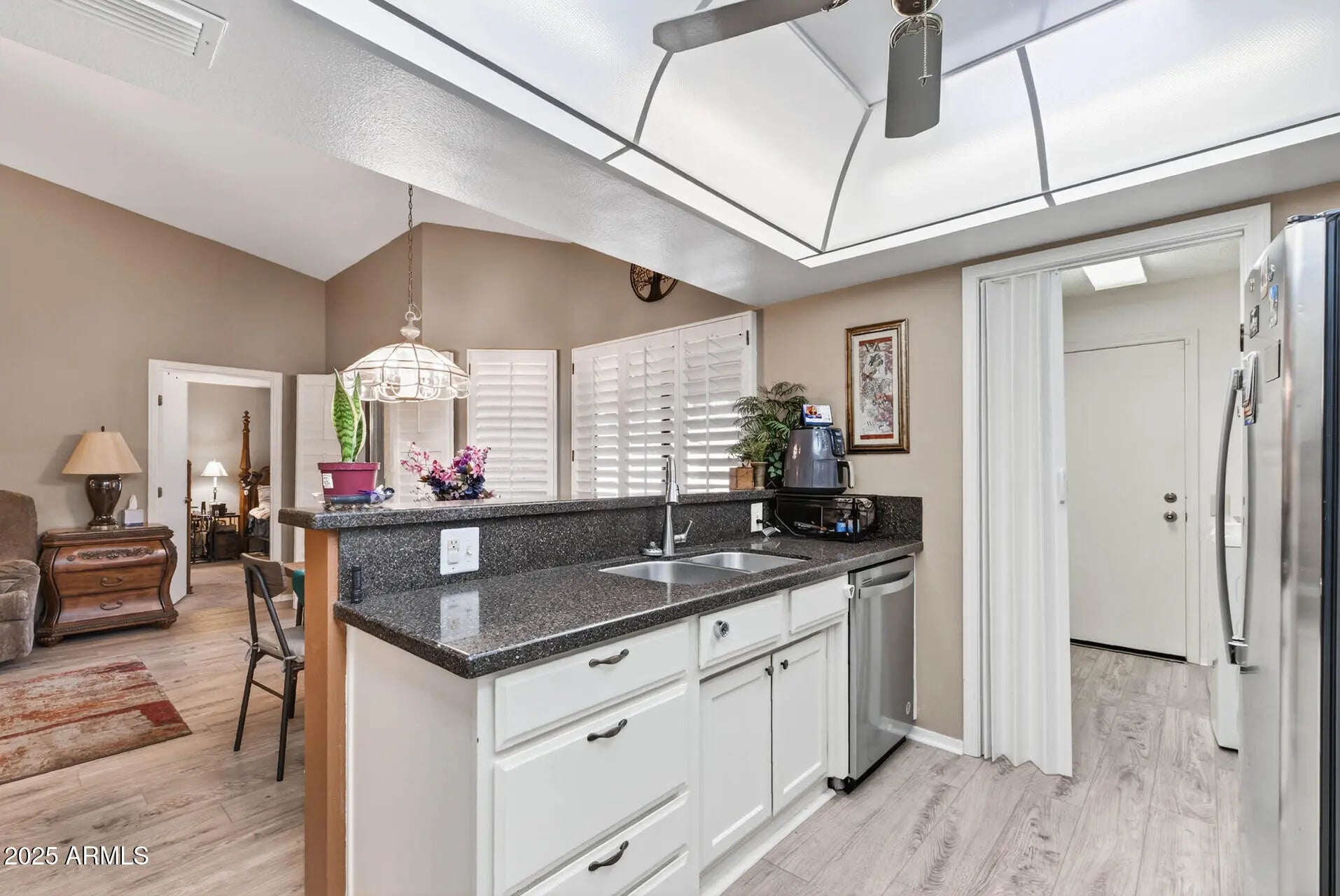 Discover refined tranquility in this updated 1377 sq ft Pueblo model garden apt. in Sun City West, AZ. This 2BR, 2BA gem features vaulted ceilings & plantation shutters throughout. Modern touches abound: quartz countertops, newer appliances, fresh paint, & updated flooring. Say goodbye to popcorn ceilings! Efficient living with newer HVAC (2024), dual-pane windows, & roof (Assoc. covers repairs). Both bedrooms have walk-in closets; primary bathroom features double sinks & private toilet room. Relish the inviting courtyard with covered patio, double gate, & slab for golf cart/bike parking etc. Central to all amenities in a bustling 55+ community. A seamless blend of comfort & convenience awaits.